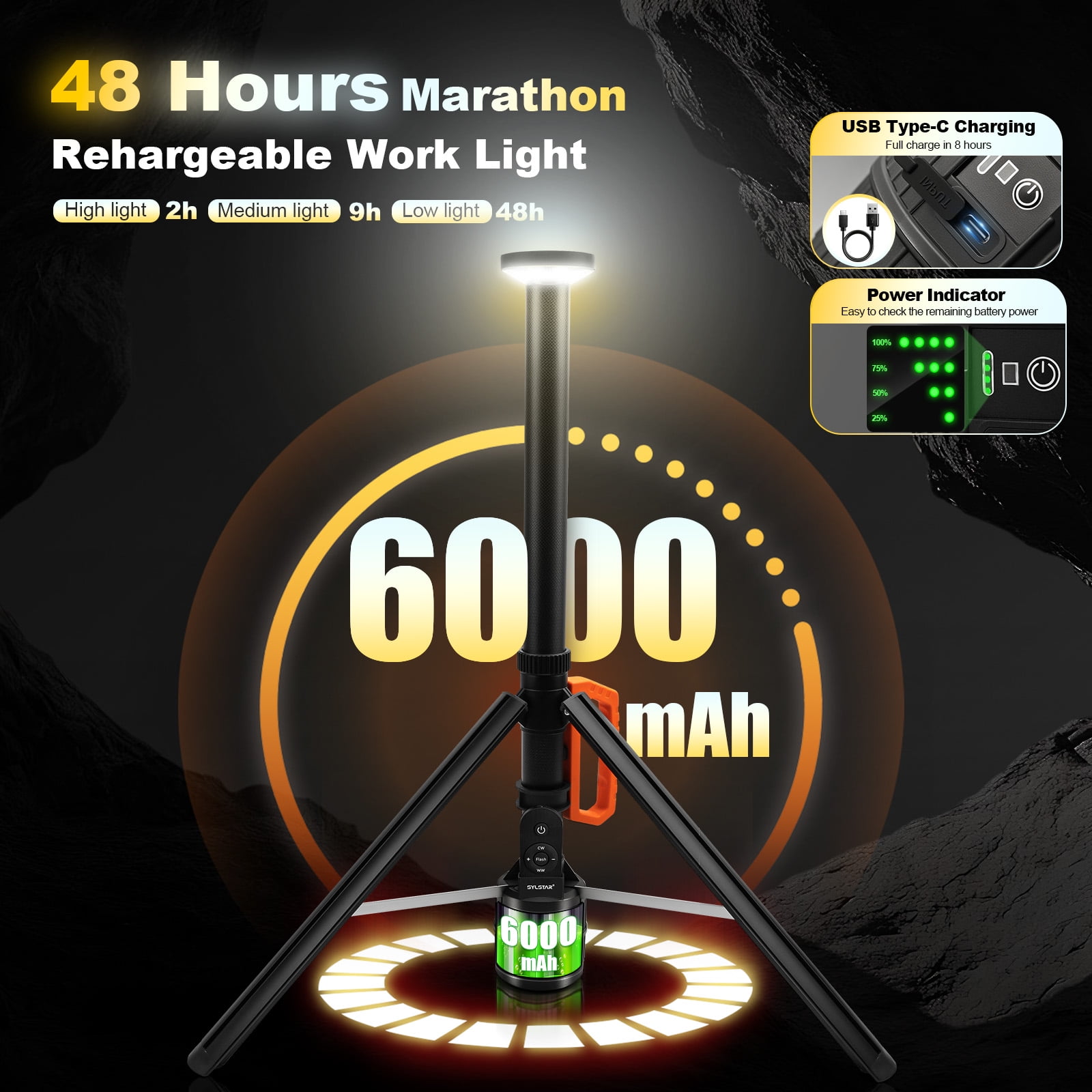 Powered by a high-capacity lithium battery, providing up to 8-12 hours of continuous light.