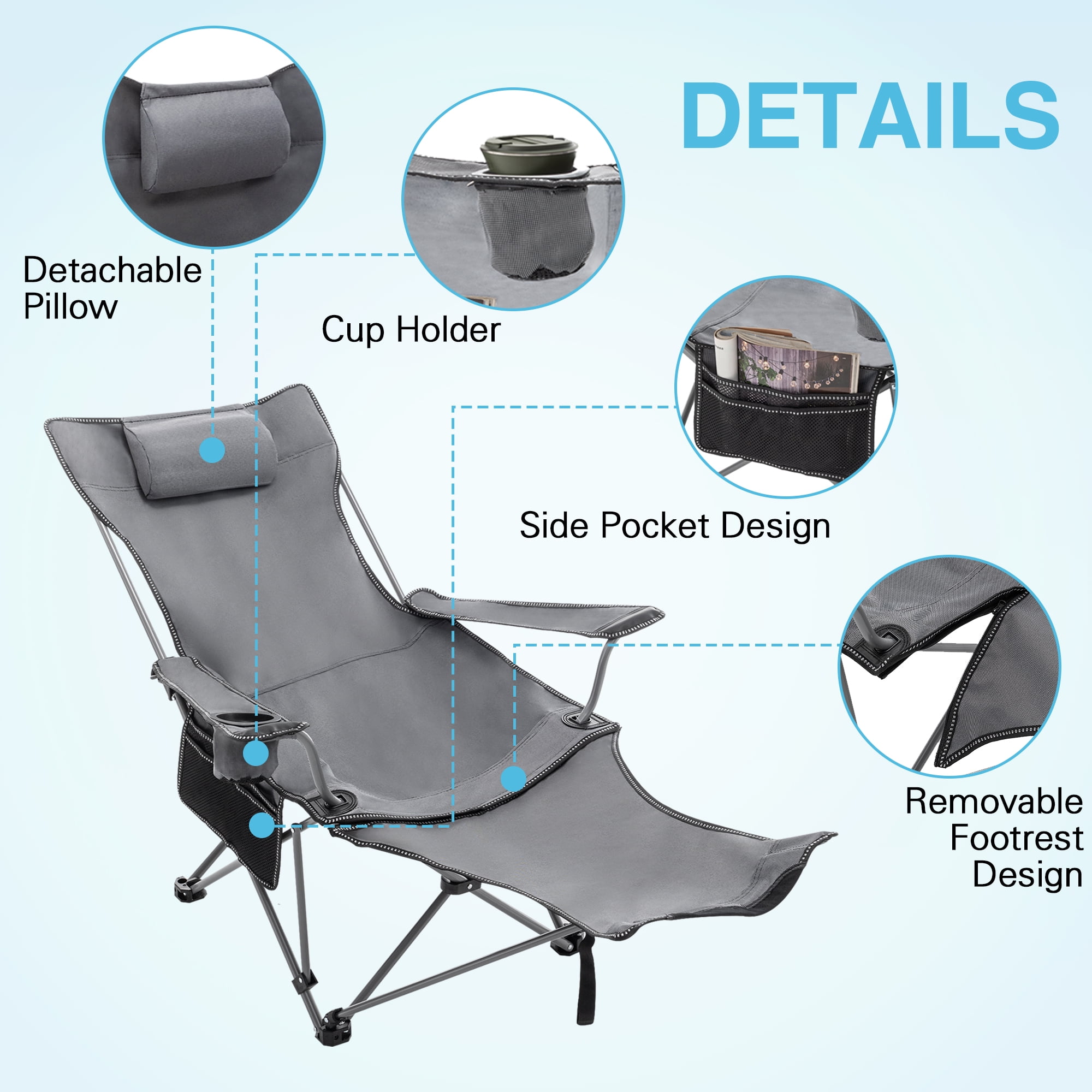 The design of this adult lawn chair, complete with a detachable footrest, accommodates various needs. Installing or removing the footrest is effortless. The camp lounge chair’s 3-in-1 pocket provides convenient storage for phones or books. Additionally, the cup holder design of this portable beach chair effectively prevents drink spills. With a weight capacity of up to 265 lbs, this adjustable camping lounger ensures sturdy support. The adjustable armrests and backrest of the Andeworld folding chair offer maximum comfort, making it ideal for outdoor activities such as camping, concerts, beach parties, fishing, barbecues, hiking, and more.