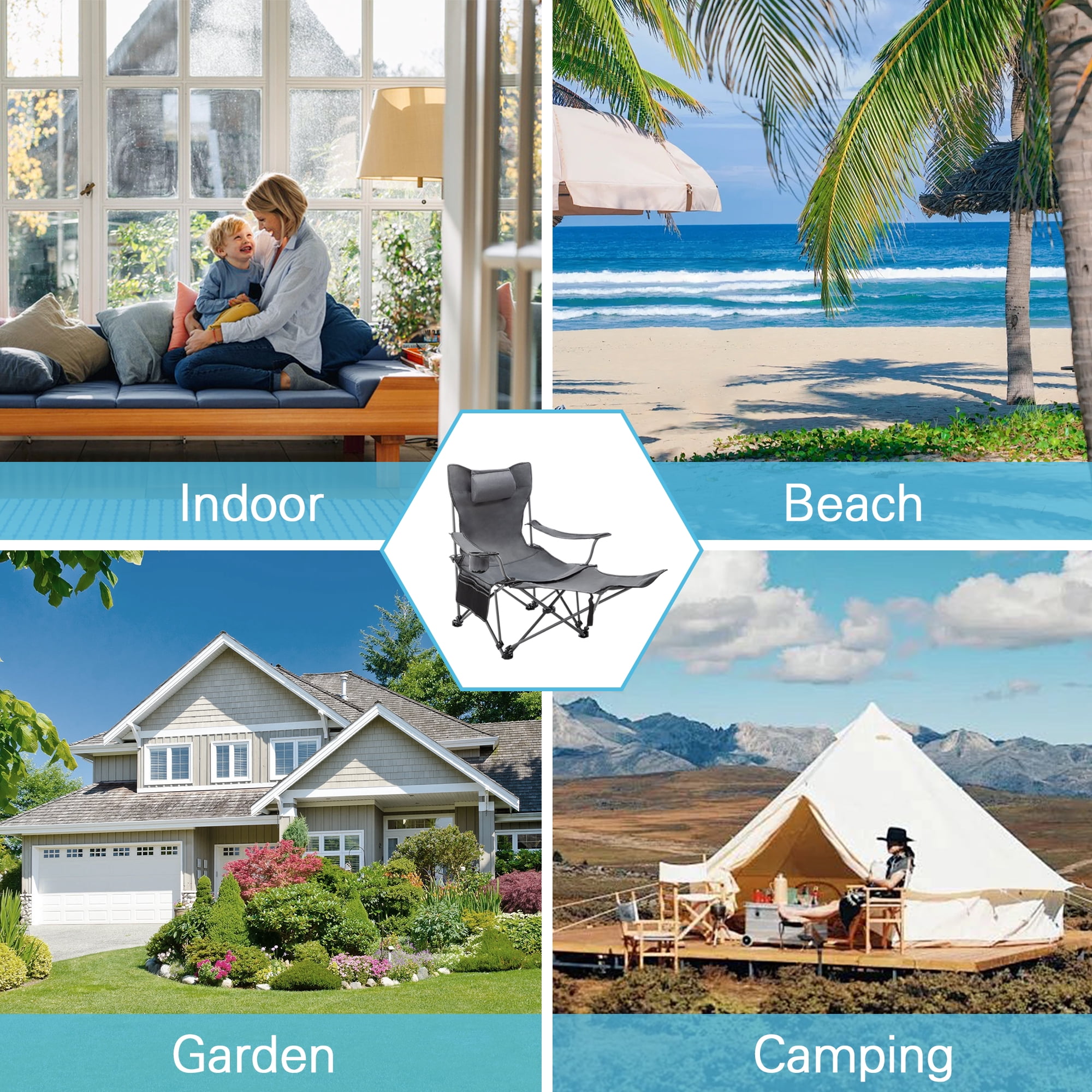【Applicable Occasions】This camping chair is versatile, fitting for various settings. It’s a great option for both indoor and outdoor use, serving as an excellent office relaxation chair. Additionally, this chaise lounge chair is perfect for outdoor activities like camping, backyard gatherings, lawn lounging, concerts, beaches, and more.