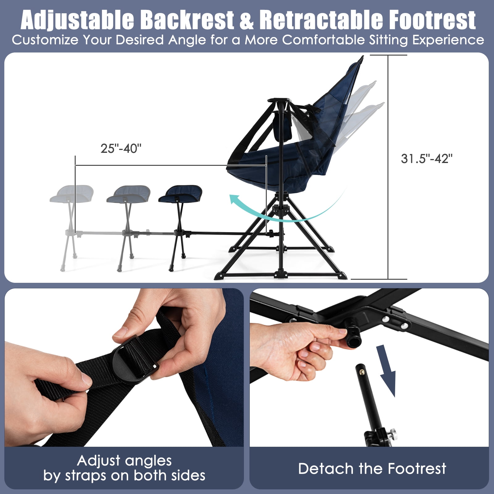 - Adjustable Backrest & Retractable Footrest: The adjustable backrest allows you to customize your desired angle for a more comfortable sitting experience. You are able to adjust back angles by straps on both sides. What’s more, the retractable footrest can be fixed to any position. Also, you can detach the footrest.