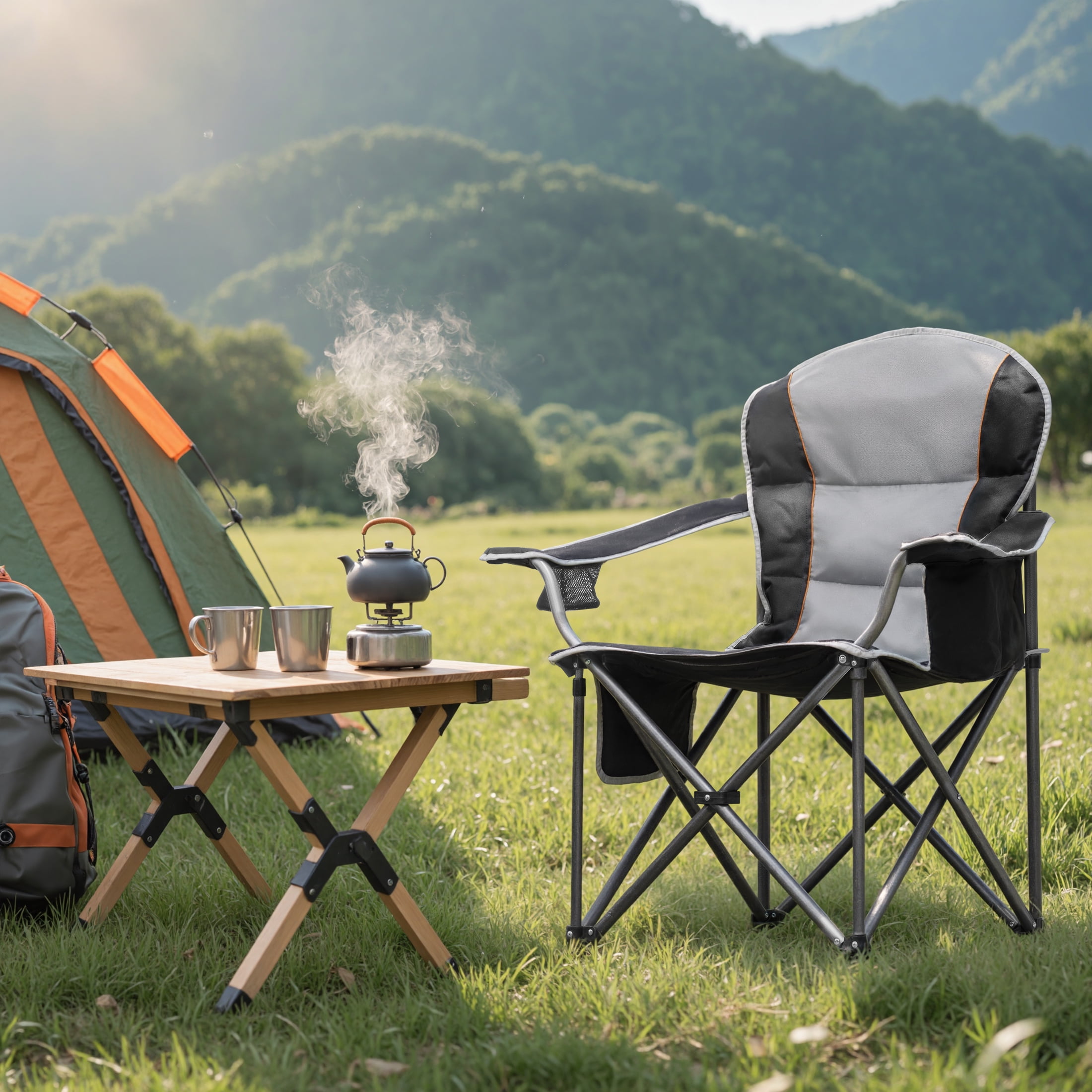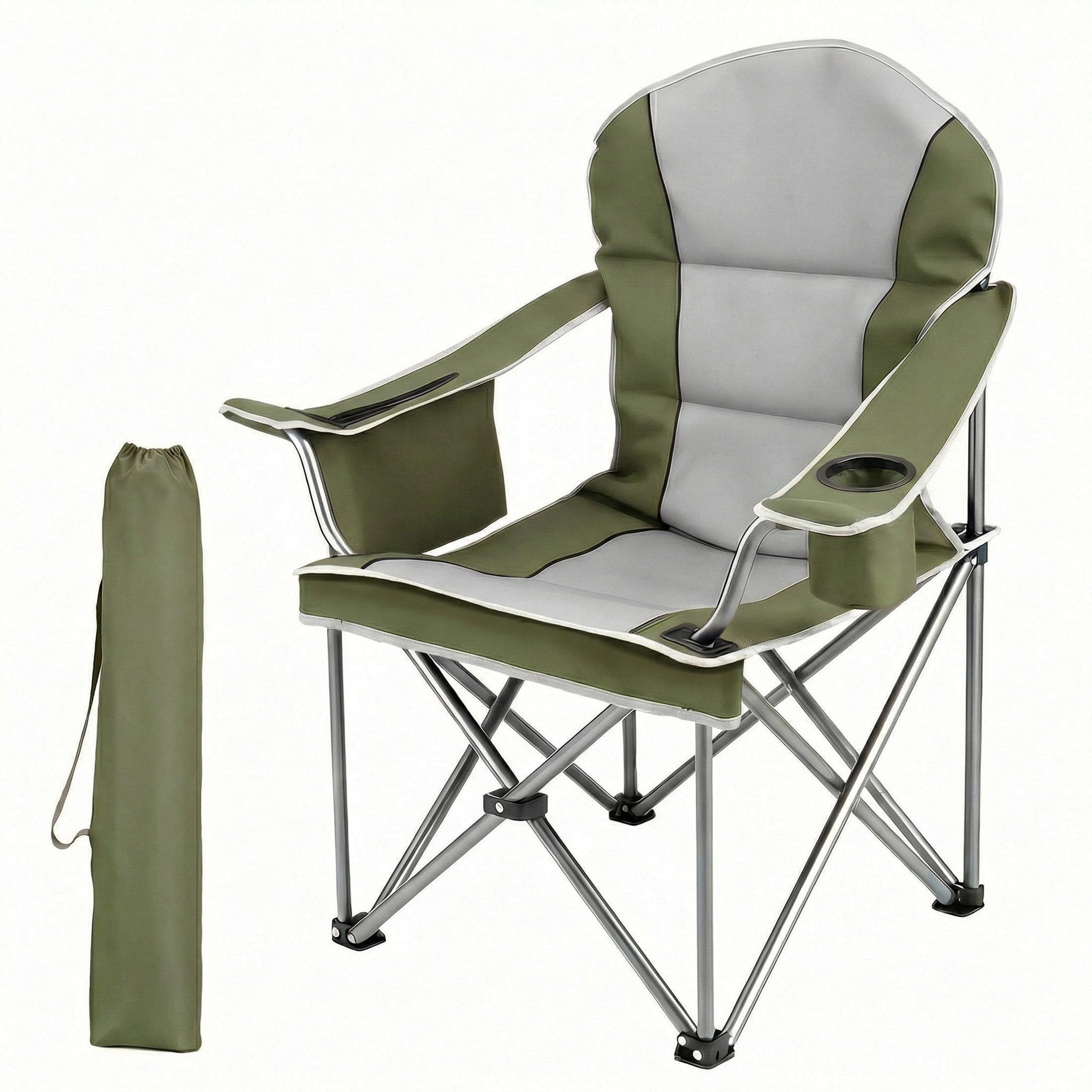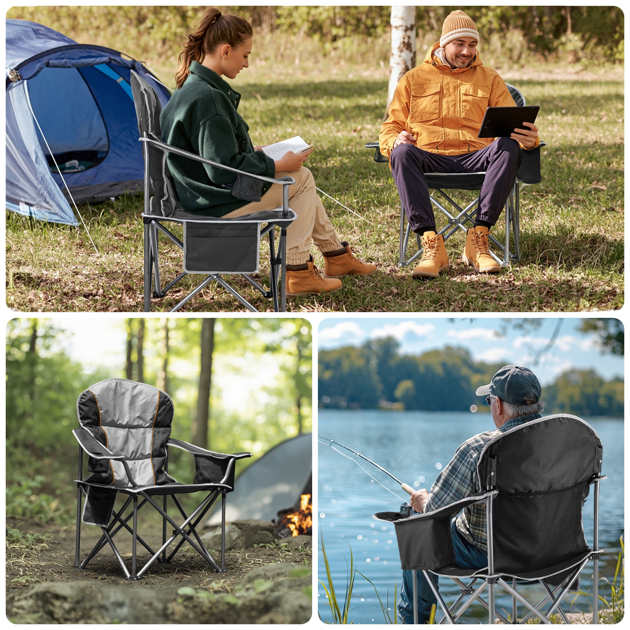 EDX Oversized Camping Folding Chair, Heavy Duty Padded Chair with Cup Holder Storage and Cooler Bag, 500 lbs Steel Frame, Portable for Outdoor,Black Gray