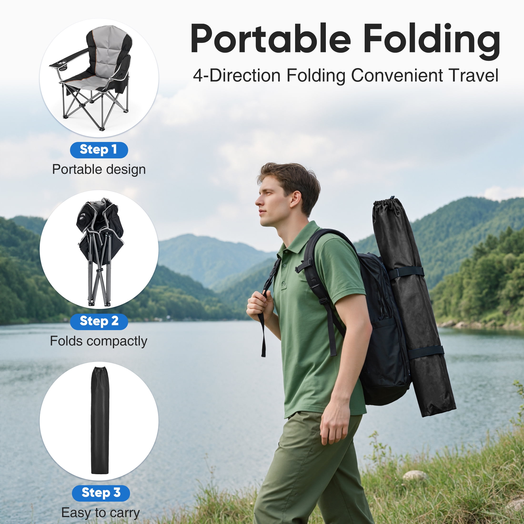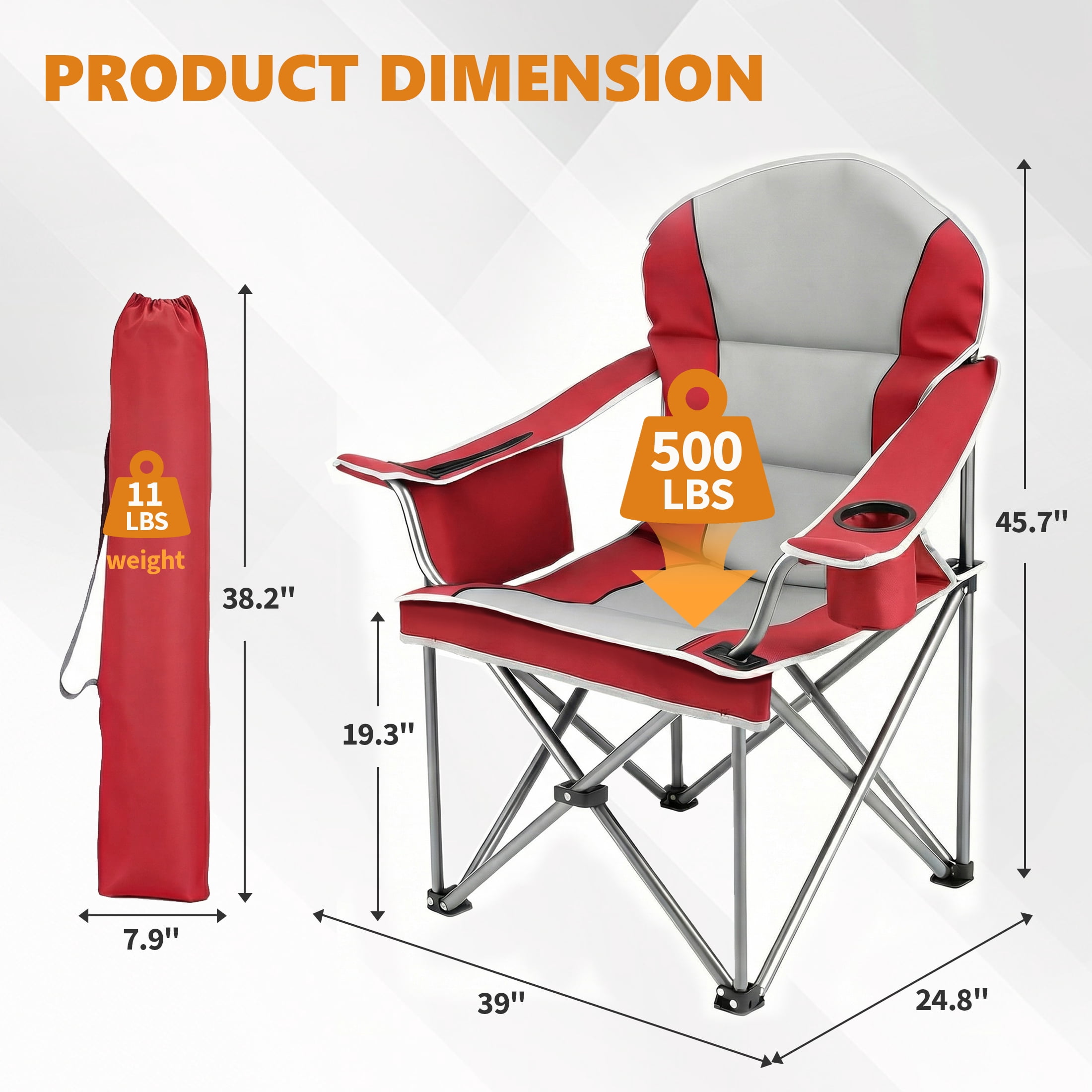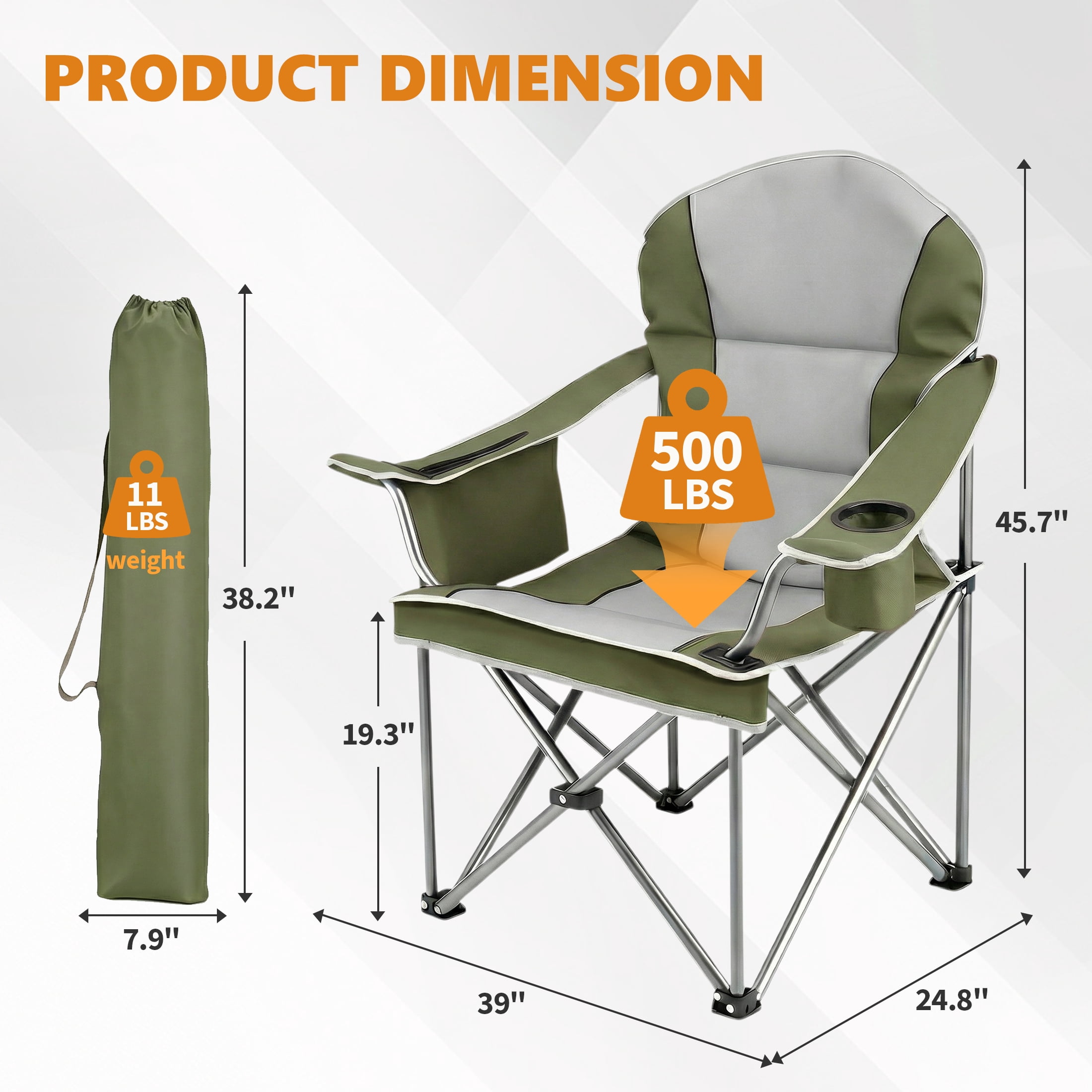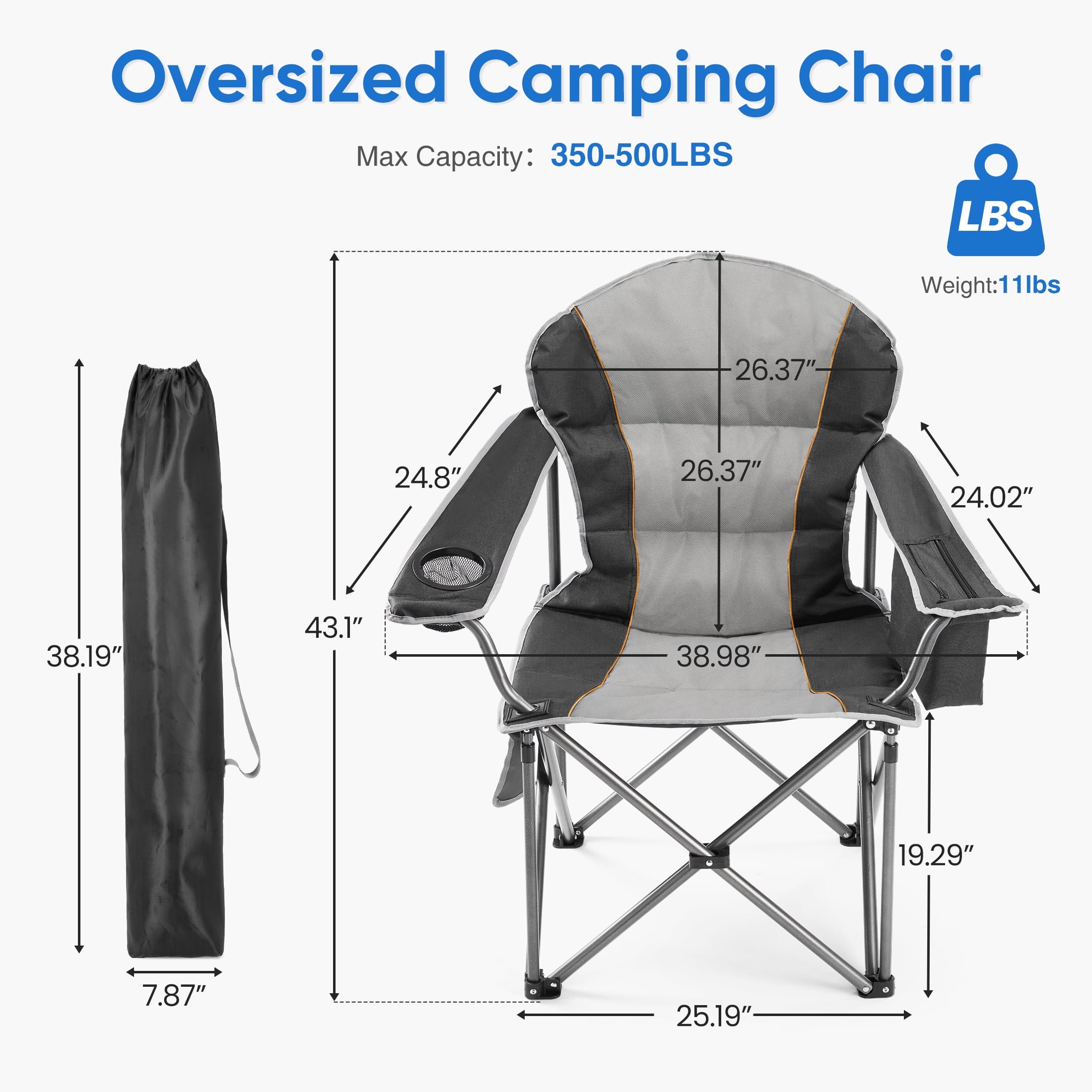 Foldable & Portable: Our camping chair is easy to set up and fold. Open dimension is 38.8″ x 24.2″ x 43.1″ , 8″ x 38″ after folded, weighs only 11 lbs, convenient to store and transport. This portable folding chair is a perfect outdoor seat.