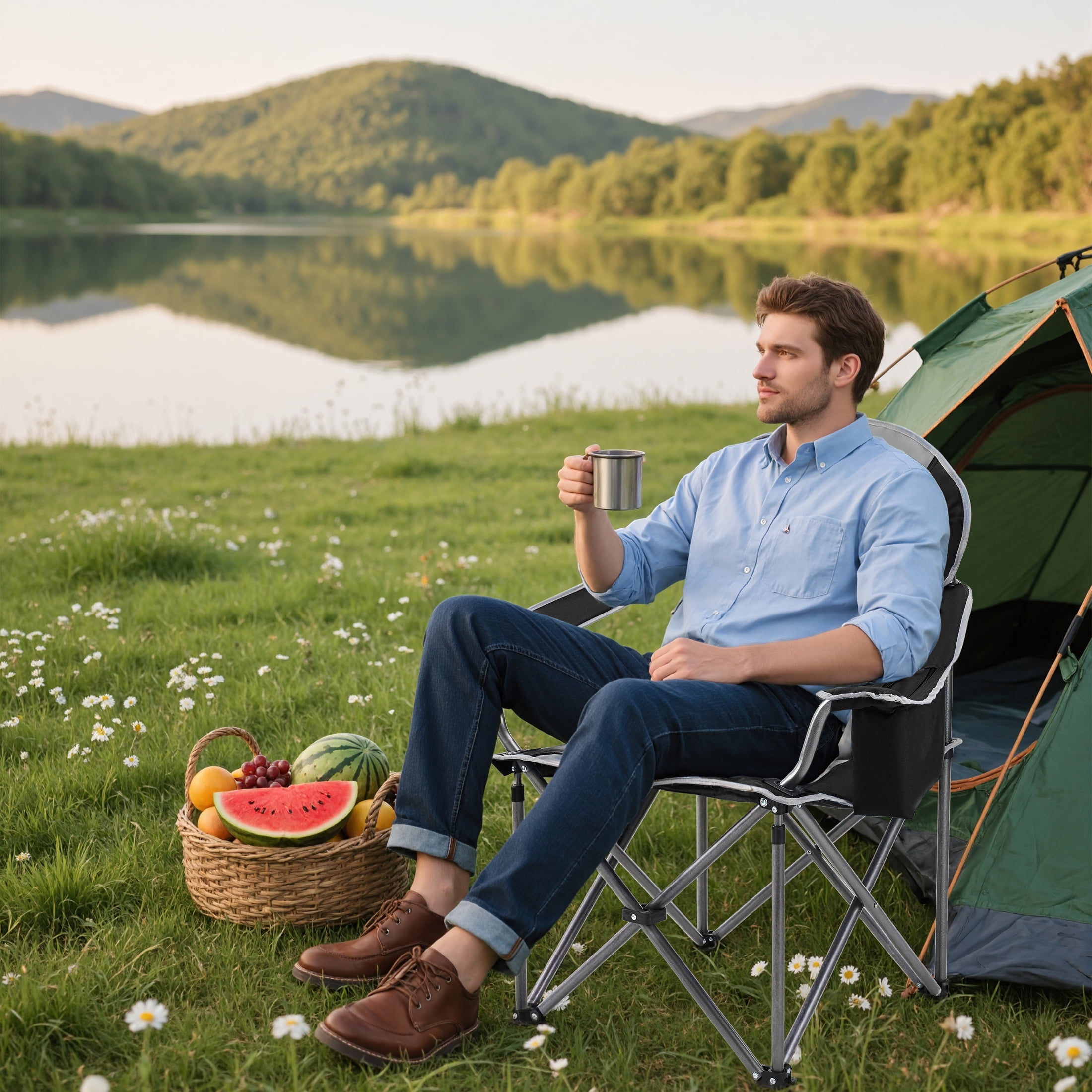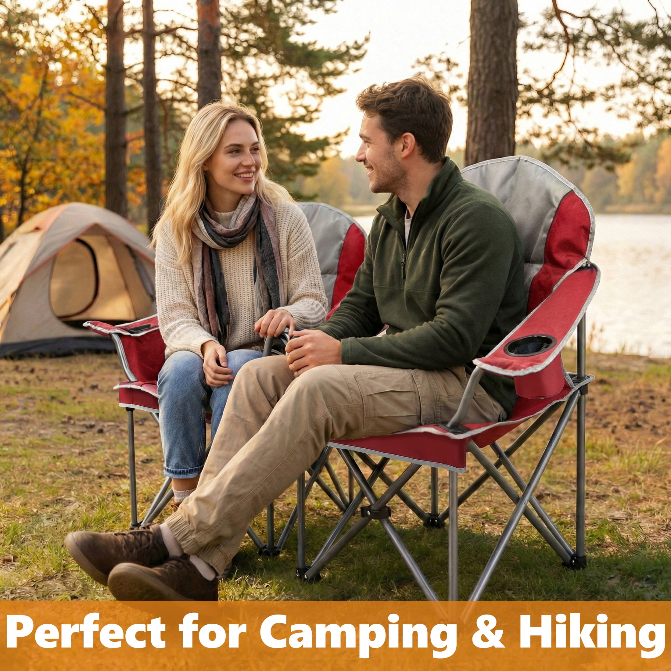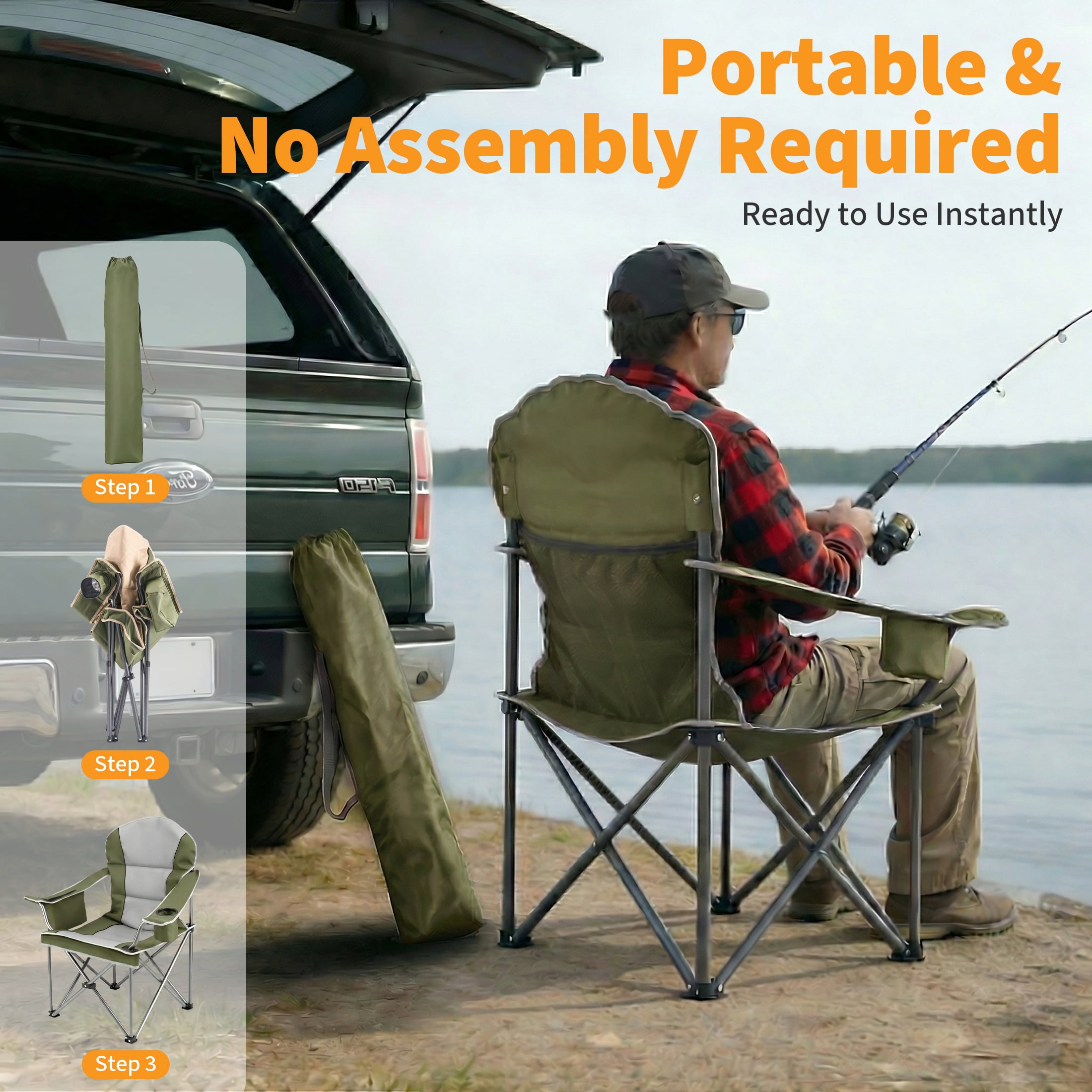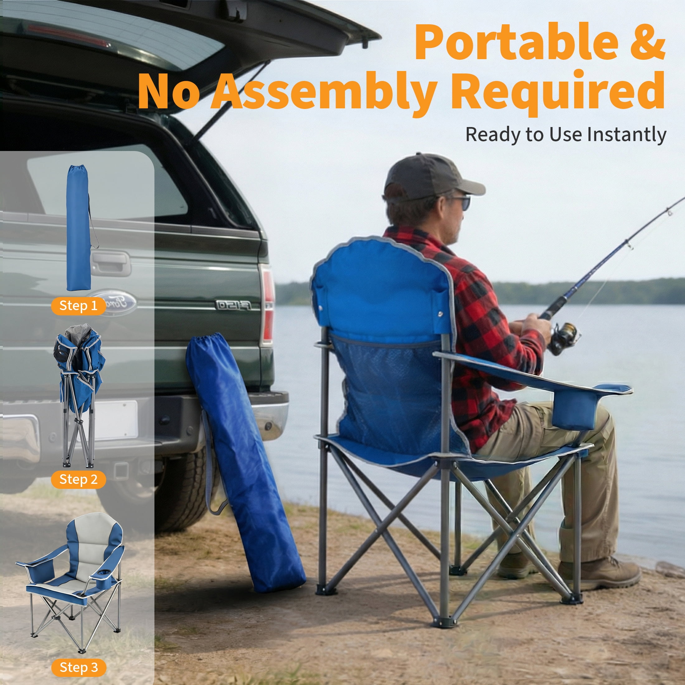 Foldable & Portable: Our camping chair is easy to set up and fold. Open dimension is 38.8″ x 24.2″ x 43.1″ , 8″ x 38″ after folded, weighs only 11 lbs, convenient to store and transport. This portable folding chair is a perfect outdoor seat.