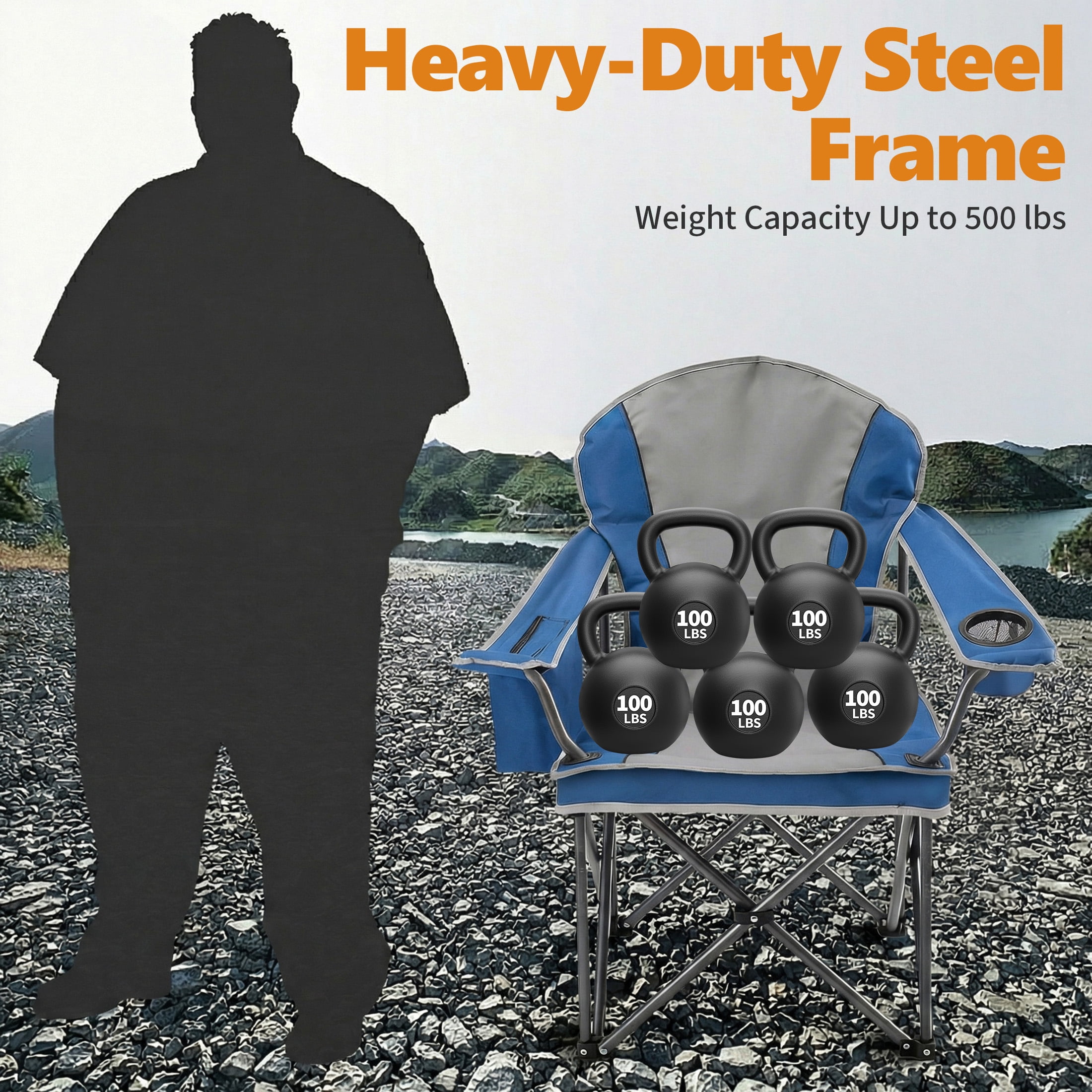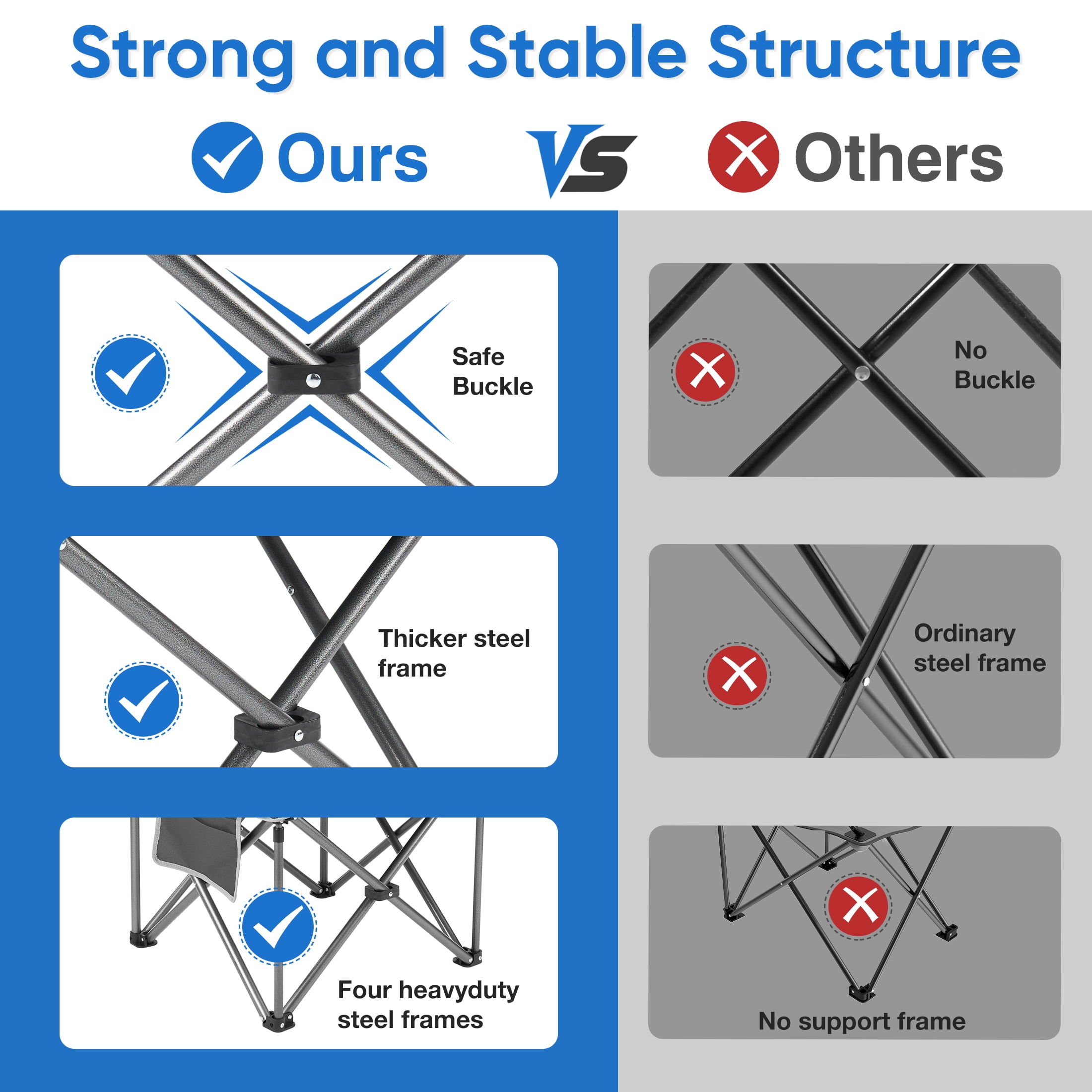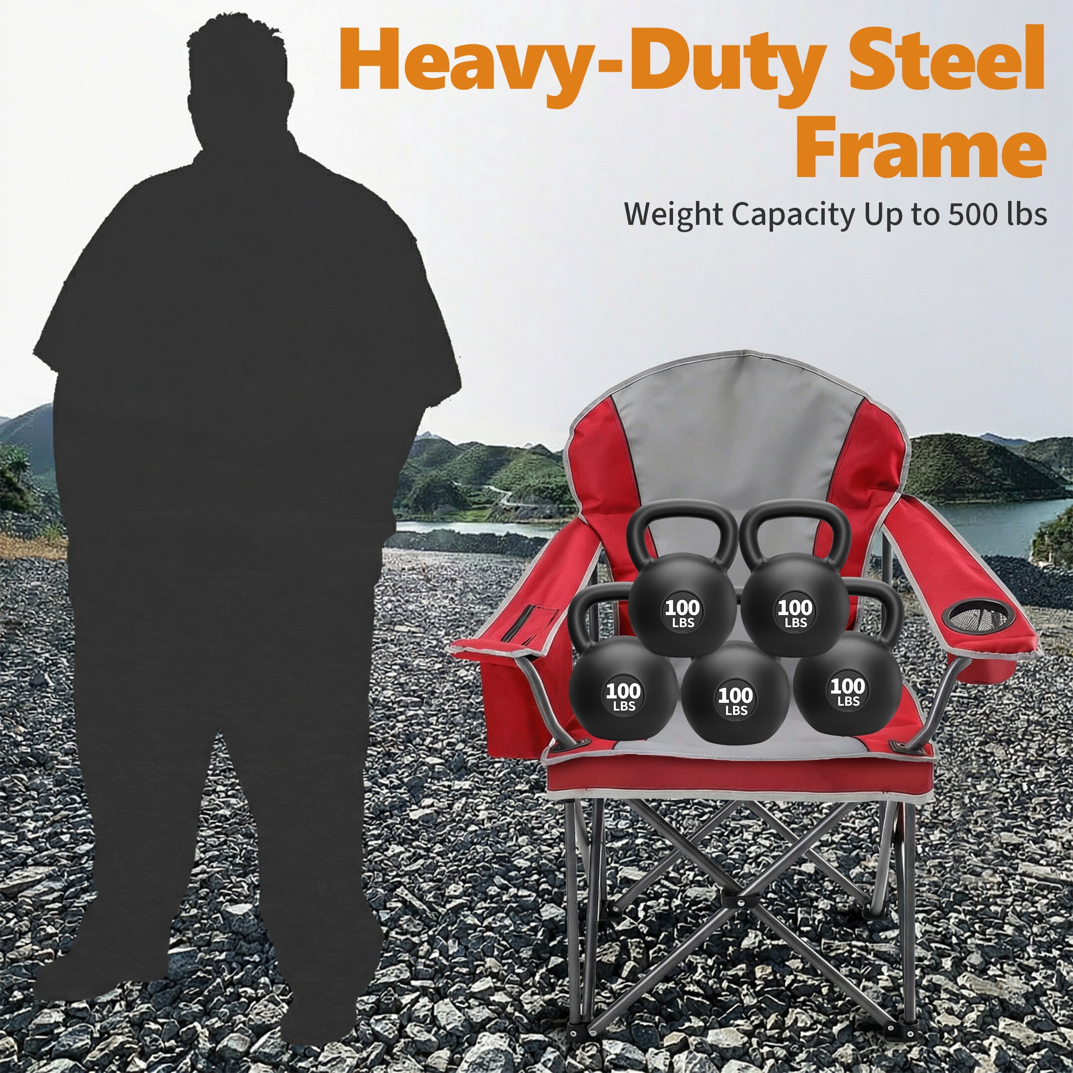 Heavy Duty Camping Chair: Camping chair features thick solid steel pipe, four heavy-duty steel frames have been added to the bottom of the chair. X-tube design reinforcement seat durability and safety, a solid scratch-resistant coating frame that supports load-bearing capacity up to 500lbs.