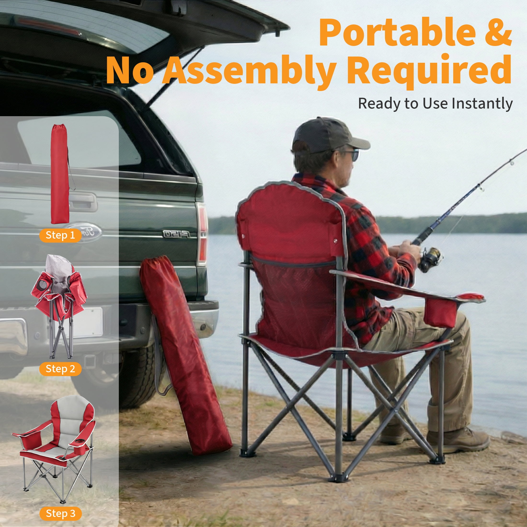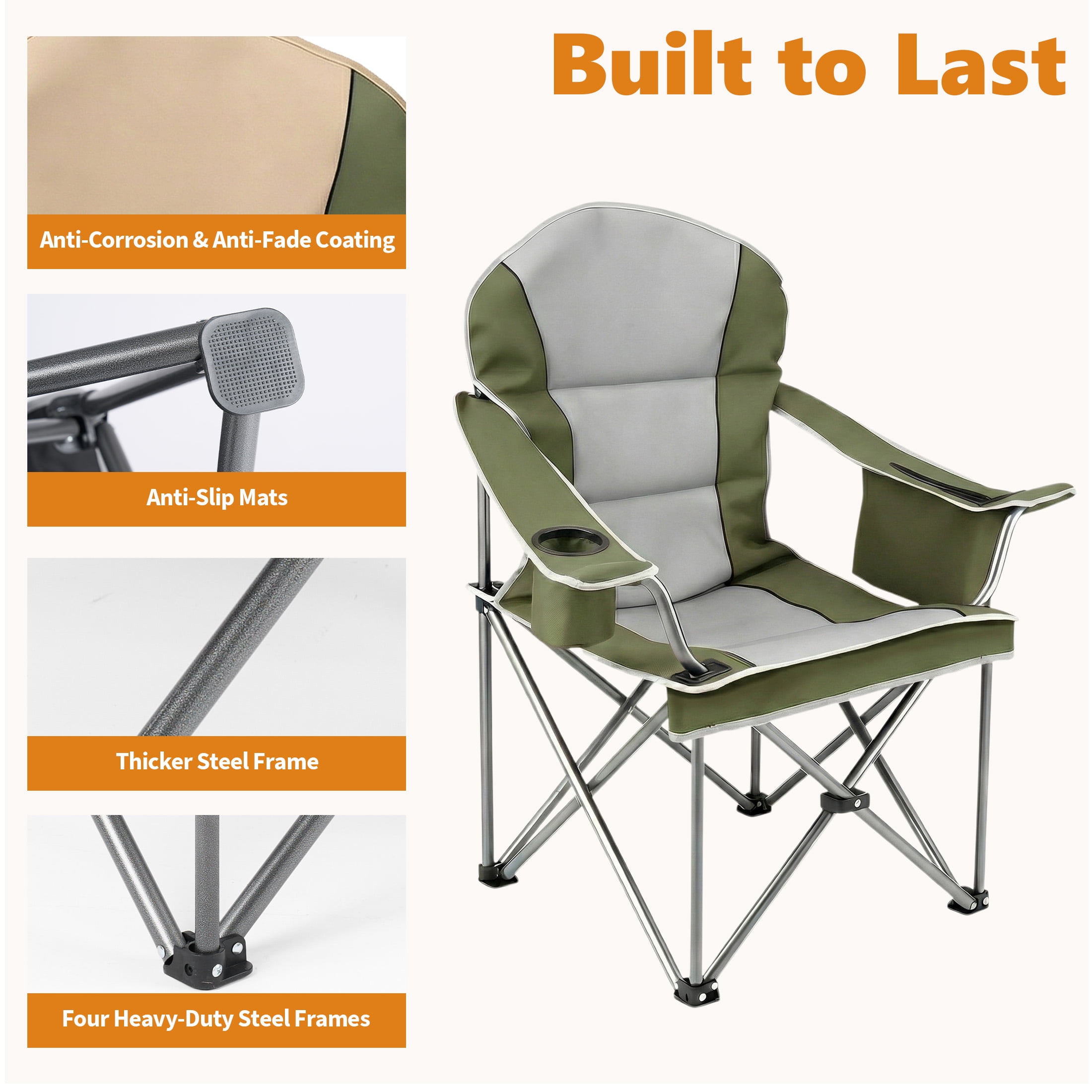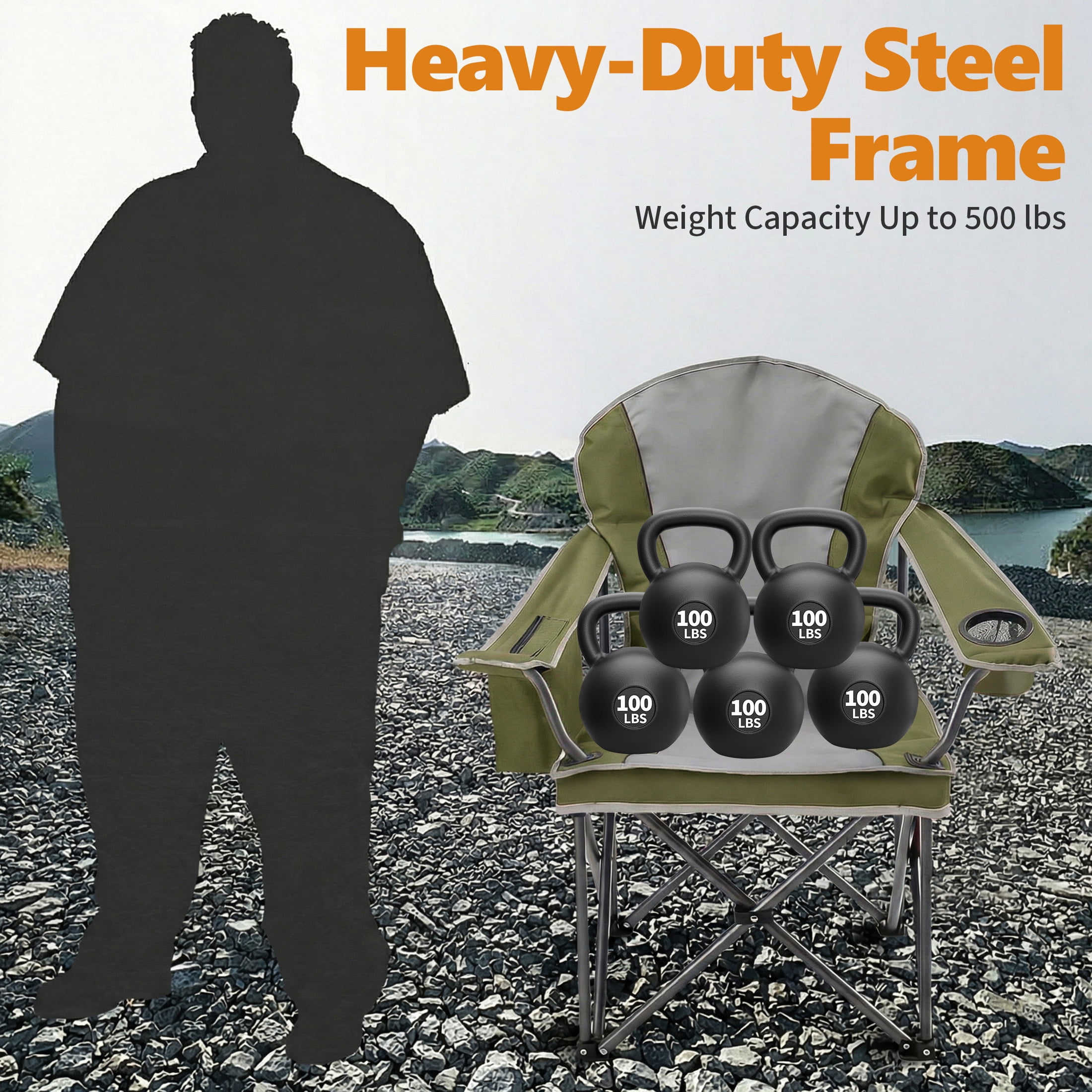 Heavy Duty Camping Chair: Camping chair features thick solid steel pipe, four heavy-duty steel frames have been added to the bottom of the chair. X-tube design reinforcement seat durability and safety, a solid scratch-resistant coating frame that supports load-bearing capacity up to 500lbs.