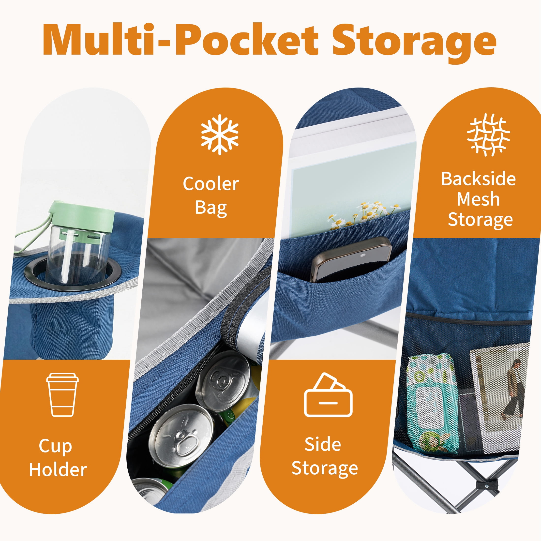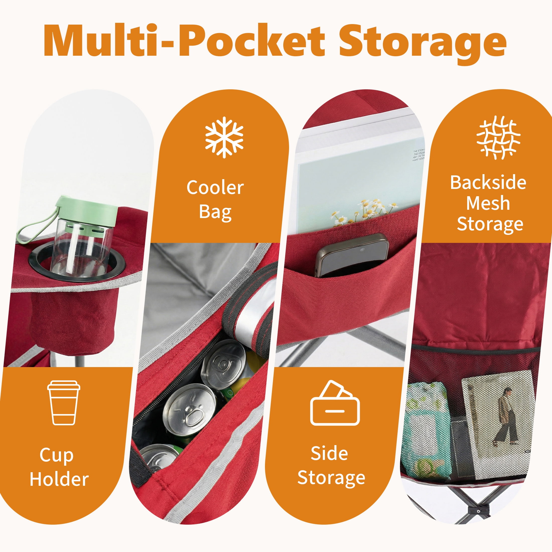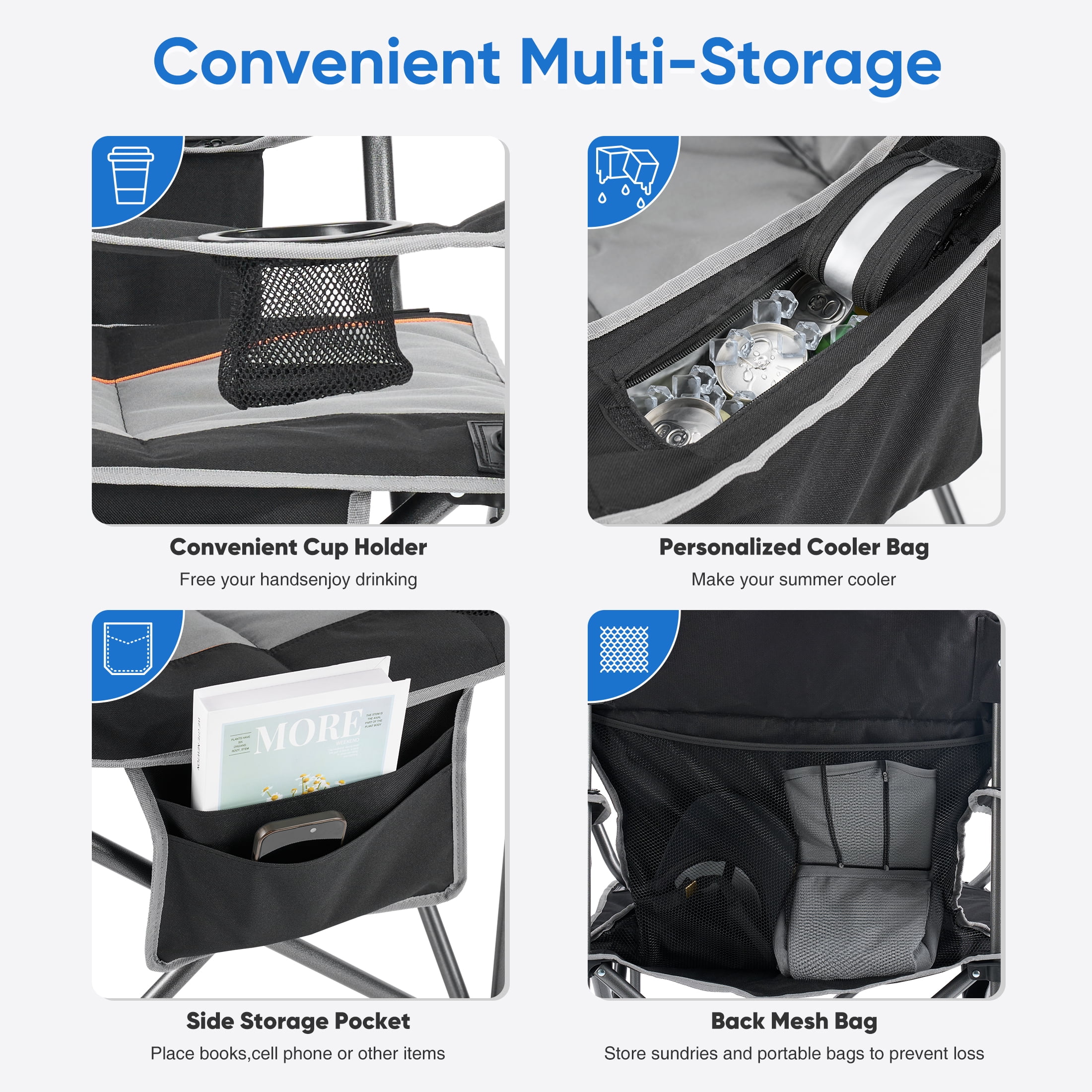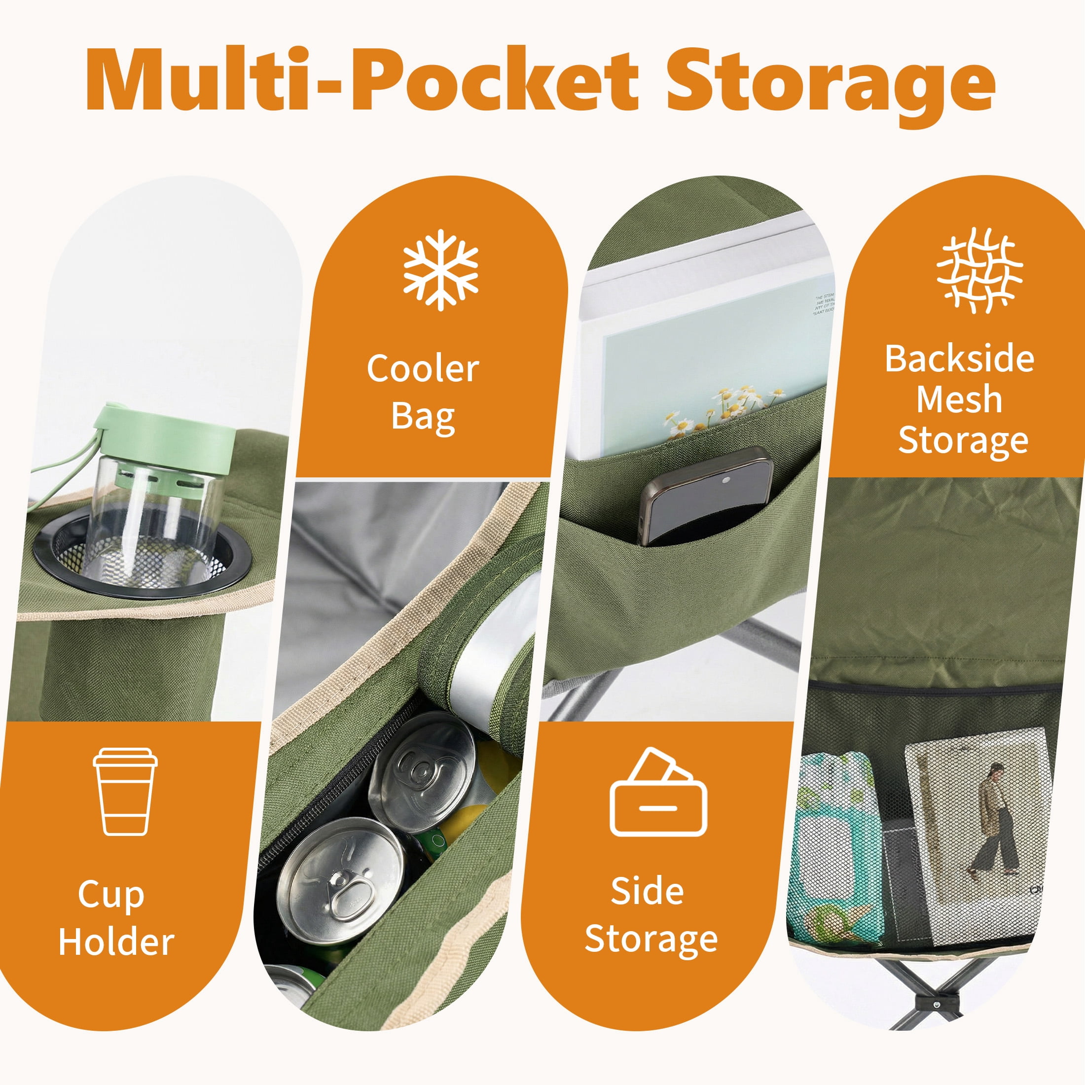 Powerful Storage Space: The Camping Folding Chair has all the storage space you need, Canned cooling bags, drink cups, as well as right side pockets and spacious rear pockets, allowing easy access to your belongings while camping, hiking or traveling.