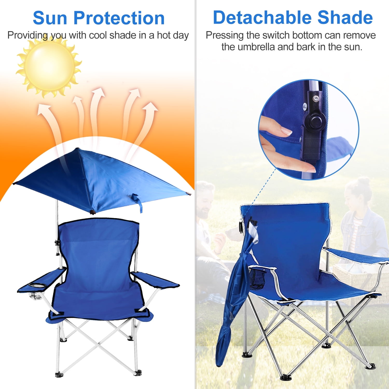 Come with an umbrella on the top, our TeqHome foldable canopy chair is suitable for you to enjoy the shade and breeze at park, beach, pool, backyard, camp site or other outdoor places. The detachable and adjustable umbrella is made of silver coated Oxford fabric, which can prevent strong UV and provide you with a cool shade on hot summer days. The heavy duty steel greatly improves its durability and reliability, the overall weight capacity of 220.5lbs. This chair is particularly designed into foldable style, the folded size is 6x4x35.4in, easy to store and carry. Set up quickly, can be opened and folded within seconds and packs easily back into its carry bag for storage or travel. Mesh cup holder keeps a beverage within reach. The included carry bag offers easy transport and storage.