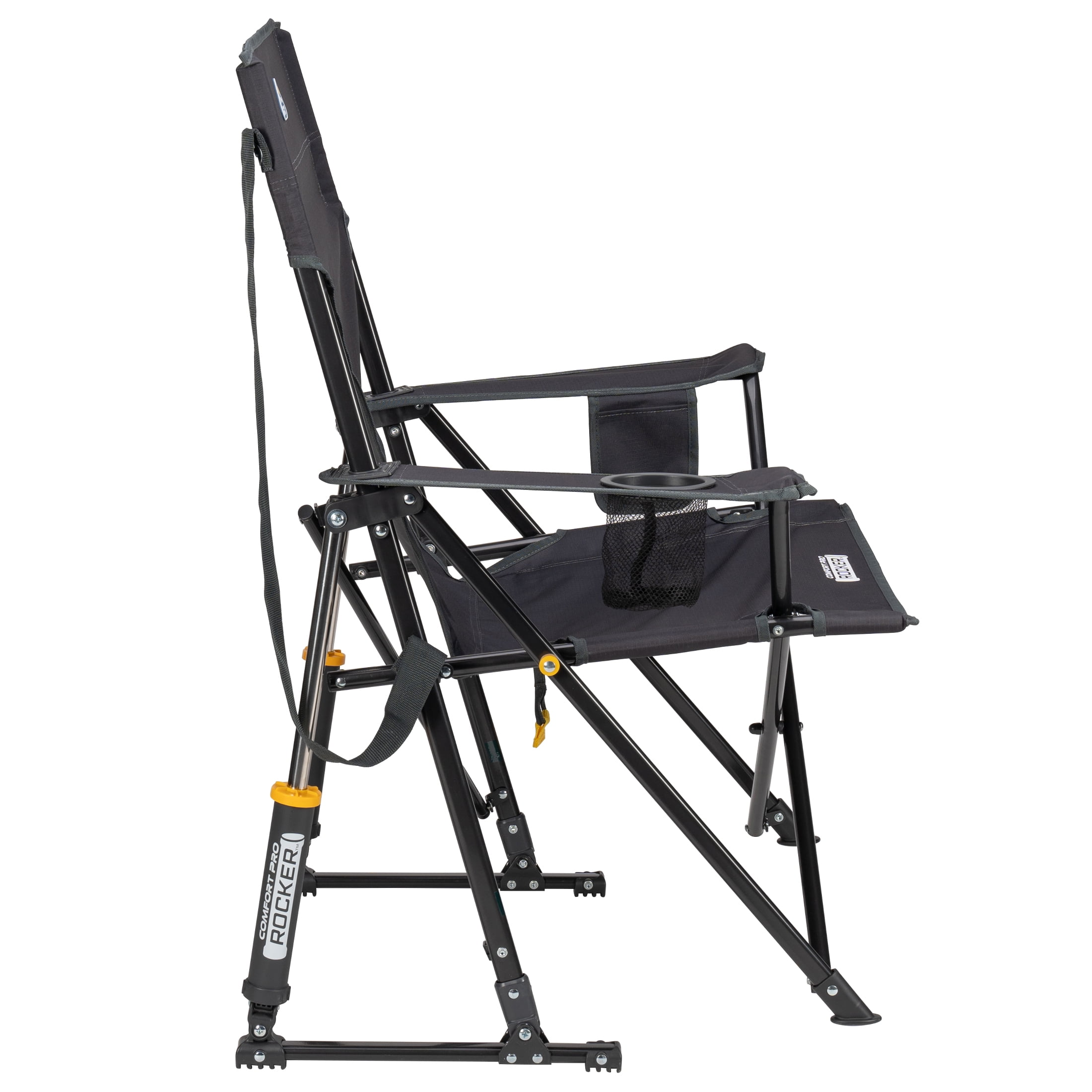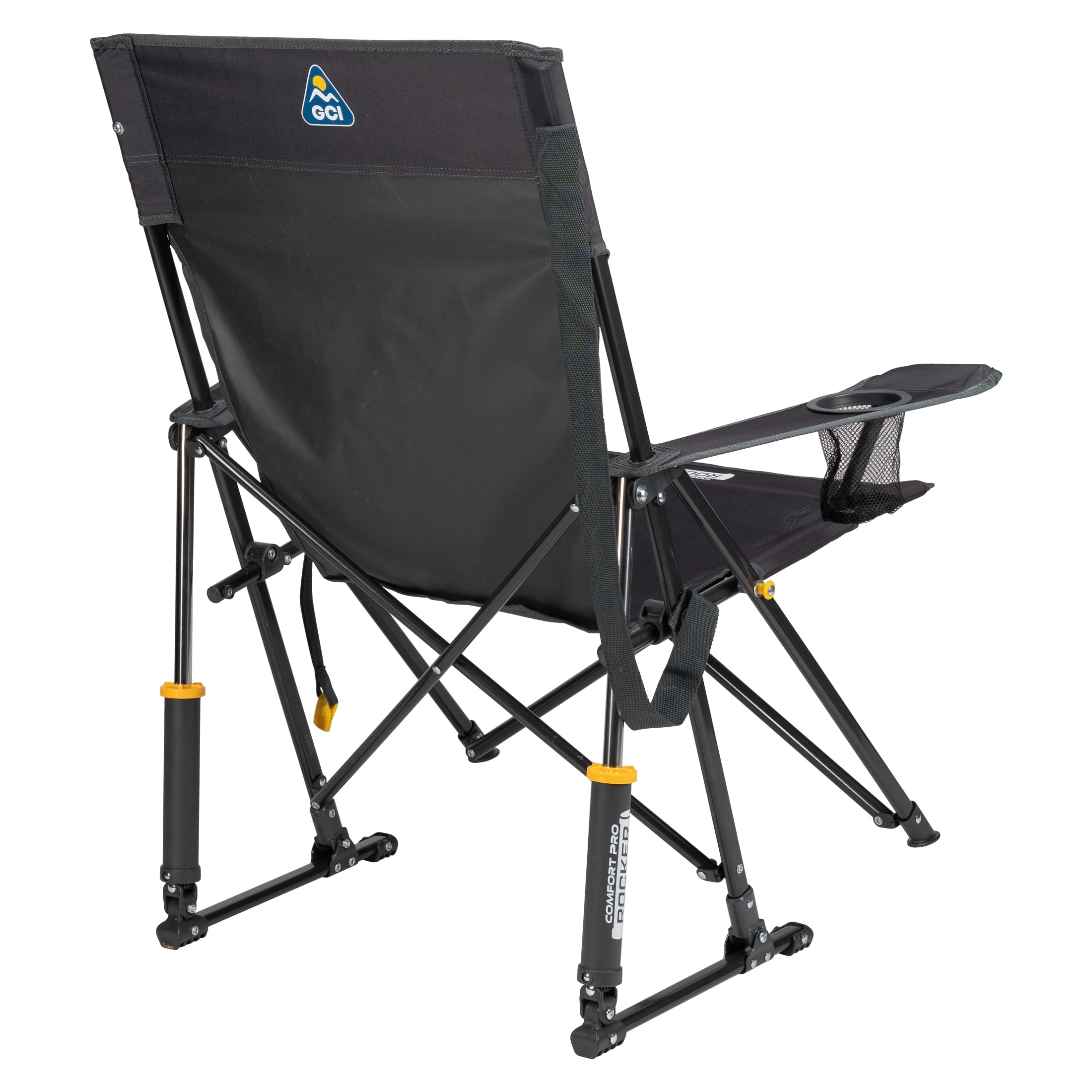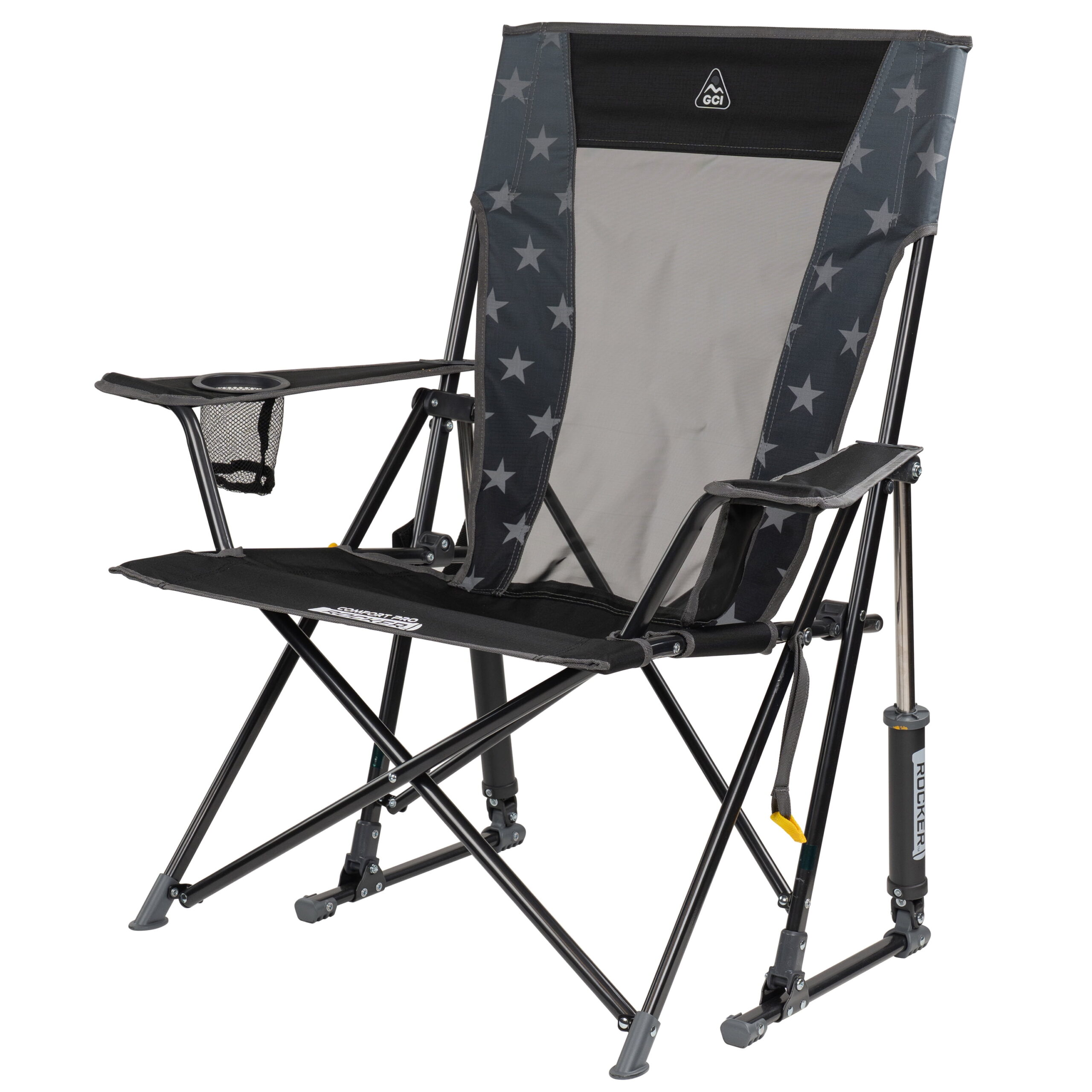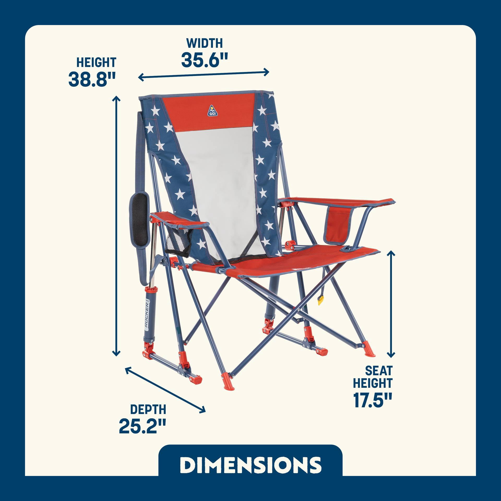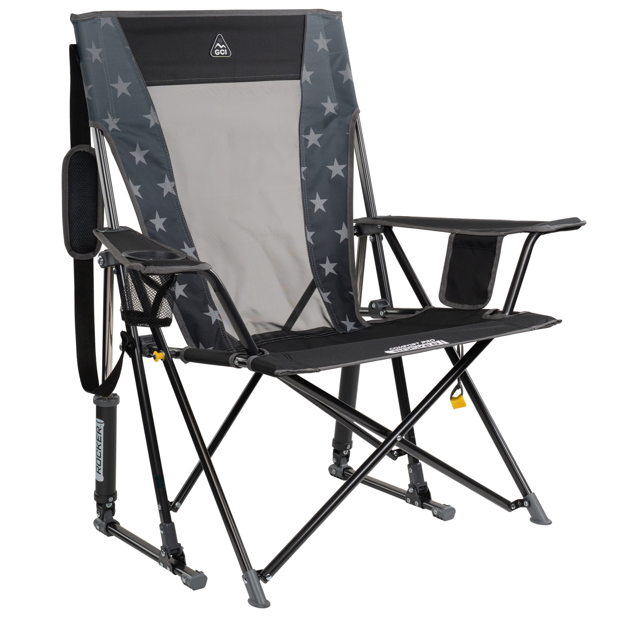 The GCI Outdoor Comfort Pro Rocker is your ticket to ultimate relaxation. Featuring a taller backrest and laid-back seating angle, along with innovative Spring-Action Rocking Technology for a smooth rocking motion, it delivers the kind of comfort that makes you forget you’re outdoors. The sturdy steel frame supports up to 250 lbs. and includes a shoulder carry strap for easy transport wherever adventure leads you. A built-in beverage holder for your favorite drink and a side pocket for quick access to photos, playlists or checking the score make it the perfect seat for sideline cheering, pre-game tailgating, or backyard barbecuing. When it’s time to head home, collapse the chair and secure it in a folded position with the attached closure tab for quick and simple pack up.
