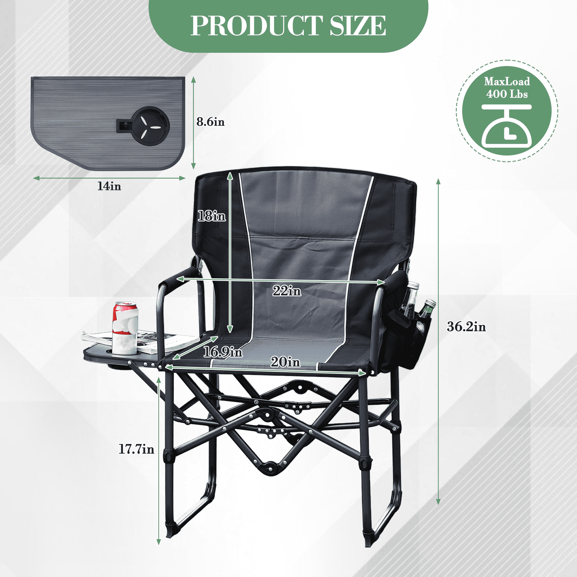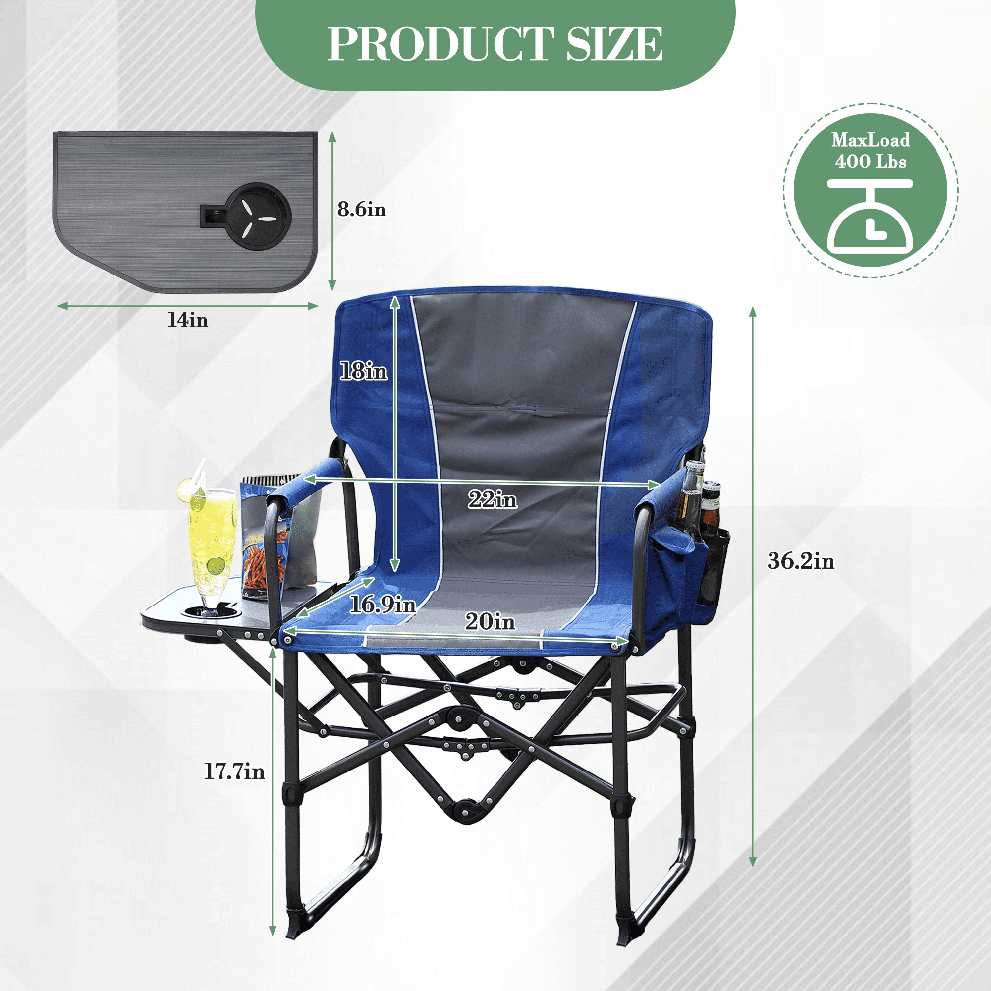 - Integrated Storage: Includes a 14 x 8-inch side table for drinks and snacks, plus a side pocket for small items.