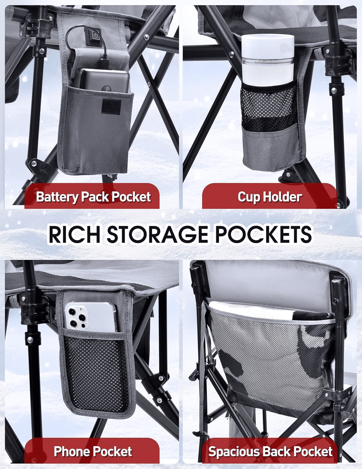 Heated Camping Chair for Adults, Fully Padded Heated Folding Chair with 3 Heat Levels, Heats Back and Seat, Rich Pockets, Heated Chairs Outdoor Sports, Support 300LBS – Batteries NOT Included – Gray