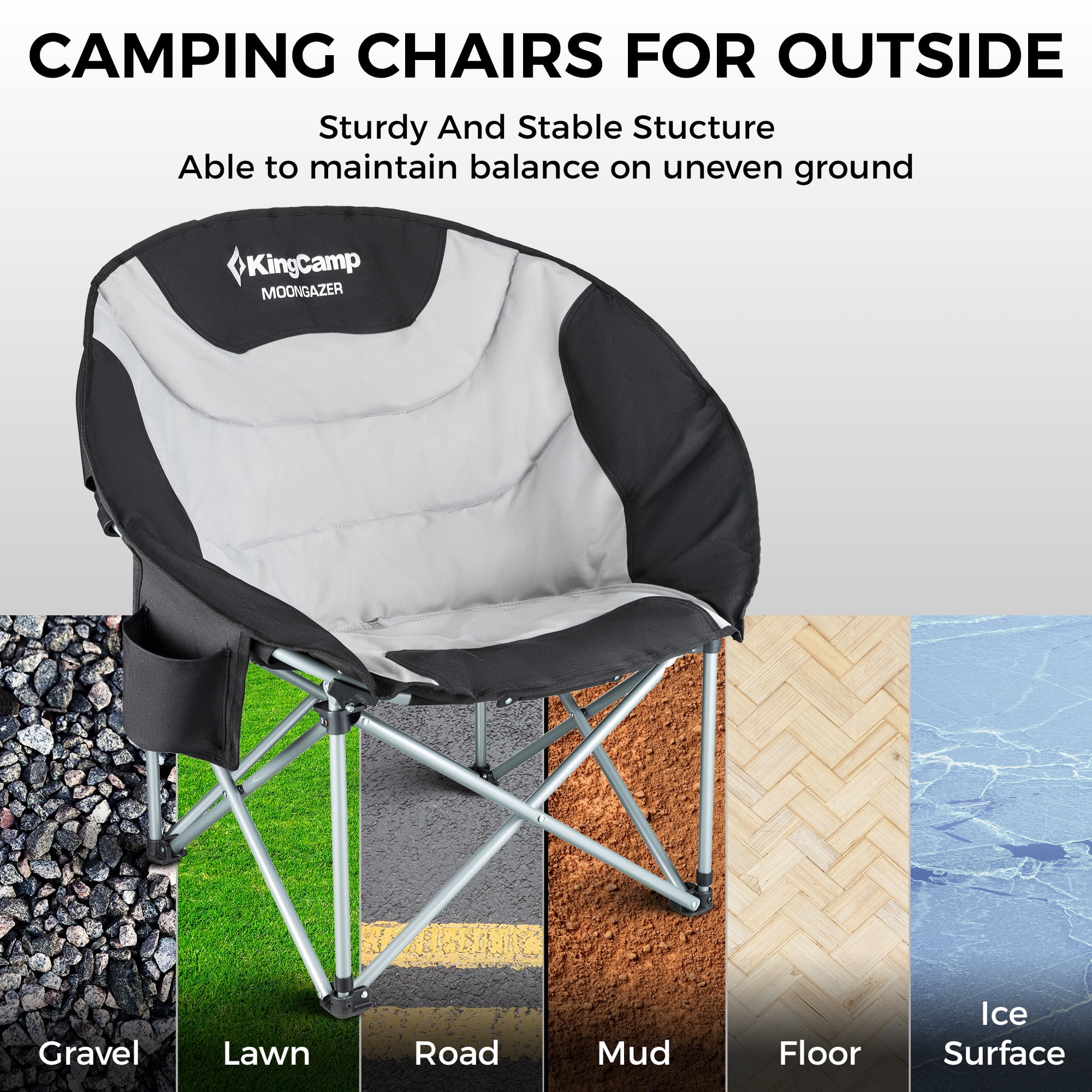 【Extra-Wide & Spacious Design】The KingCamp camping chair features a seat widened by 20%+ compared to standard camping chairs, offering an open size of 33.9 x 27.2 x 31.5 inches. The spacious design of our large lawn chair provides superior comfort, suitable for big people or anyone seeking extra room to relax.