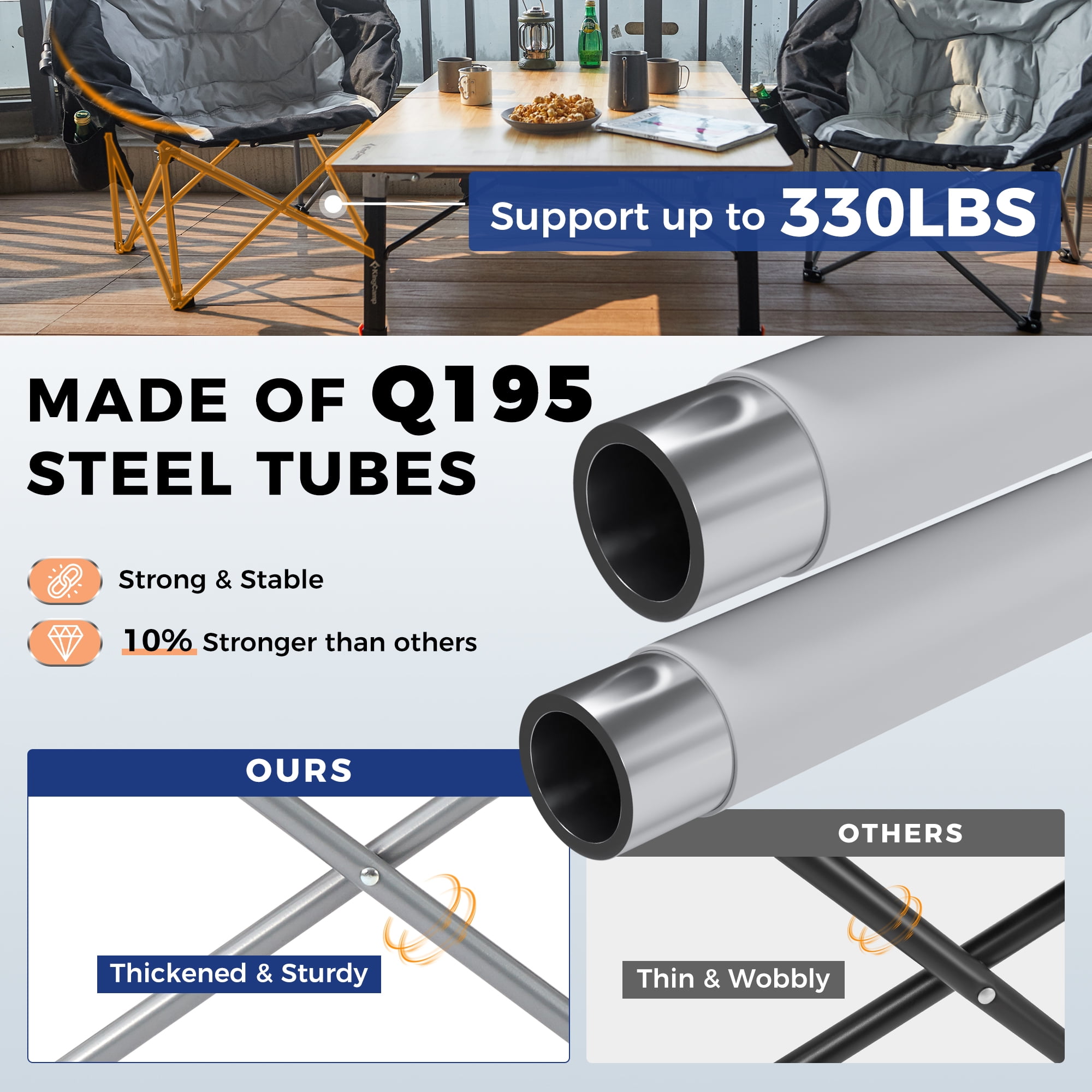 【Heavy-Duty & Sturdy Construction】Built with a durable Q195 steel frame, this folding chair includes a double vertical stiffened support tube stand and a triangular structure and the chair frame is lengthened and widened, greatly improving stability and durability. The reinforced design supports up to 330 lbs and more, ensuring long-lasting durability for adults. Whether you need a sofa chair for relaxing or a portable chair for outdoor adventures, this heavy-duty camping chair delivers unmatched strength.