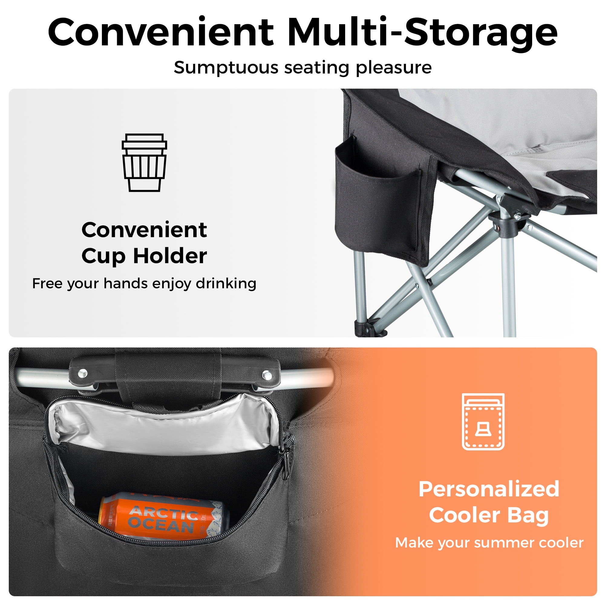 【Versatile & Convenient Features】Equipped with a cup holder and a cooler bag, this multipurpose outdoor chair is perfect for camping, fishing, sporting events, or relaxing in your garden or yard. The thoughtful design of the camp chair enhances your outdoor experience, keeping your drinks within reach while you unwind, this versatile folding chair is designed for all your outdoor and leisure needs.