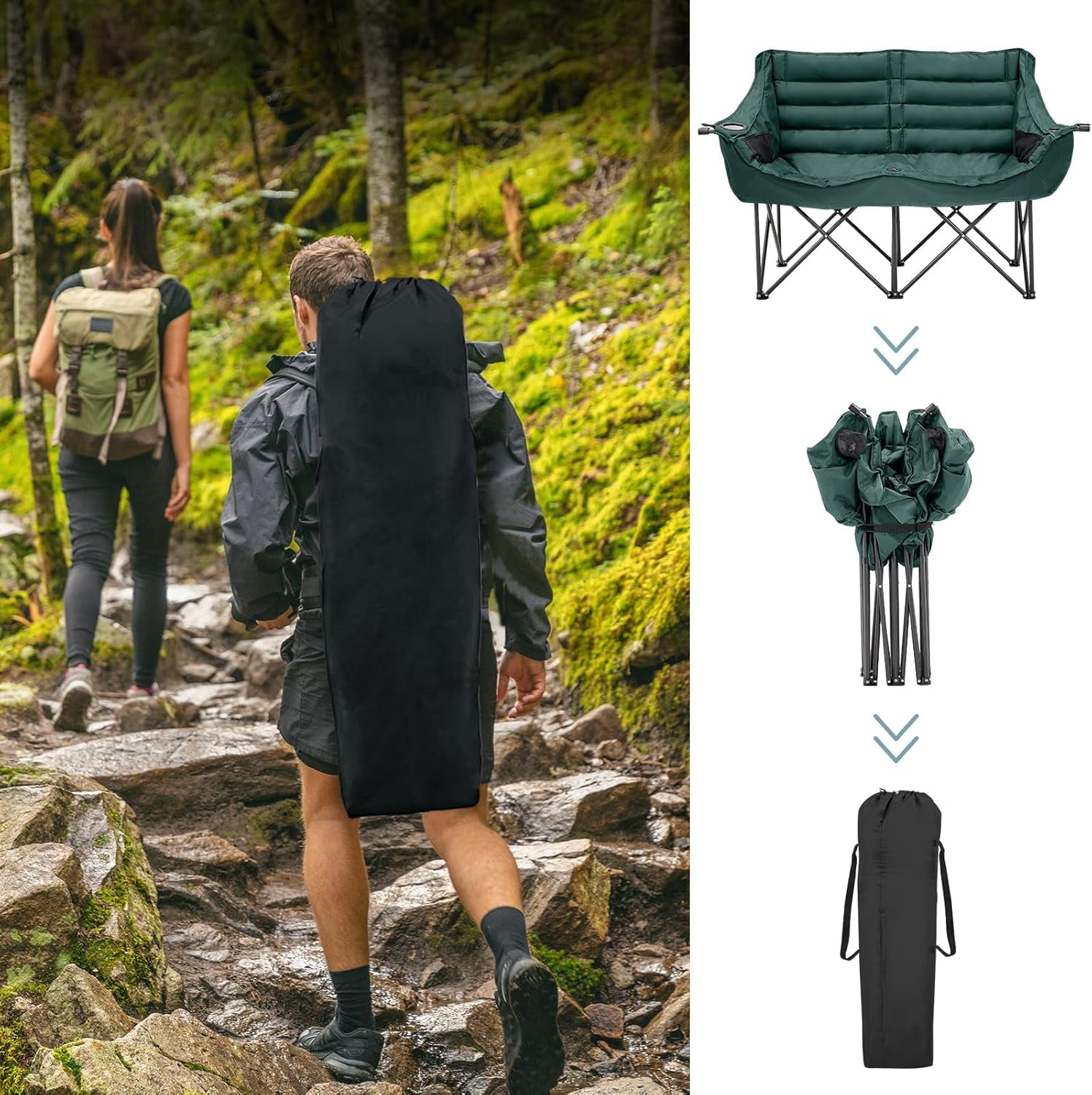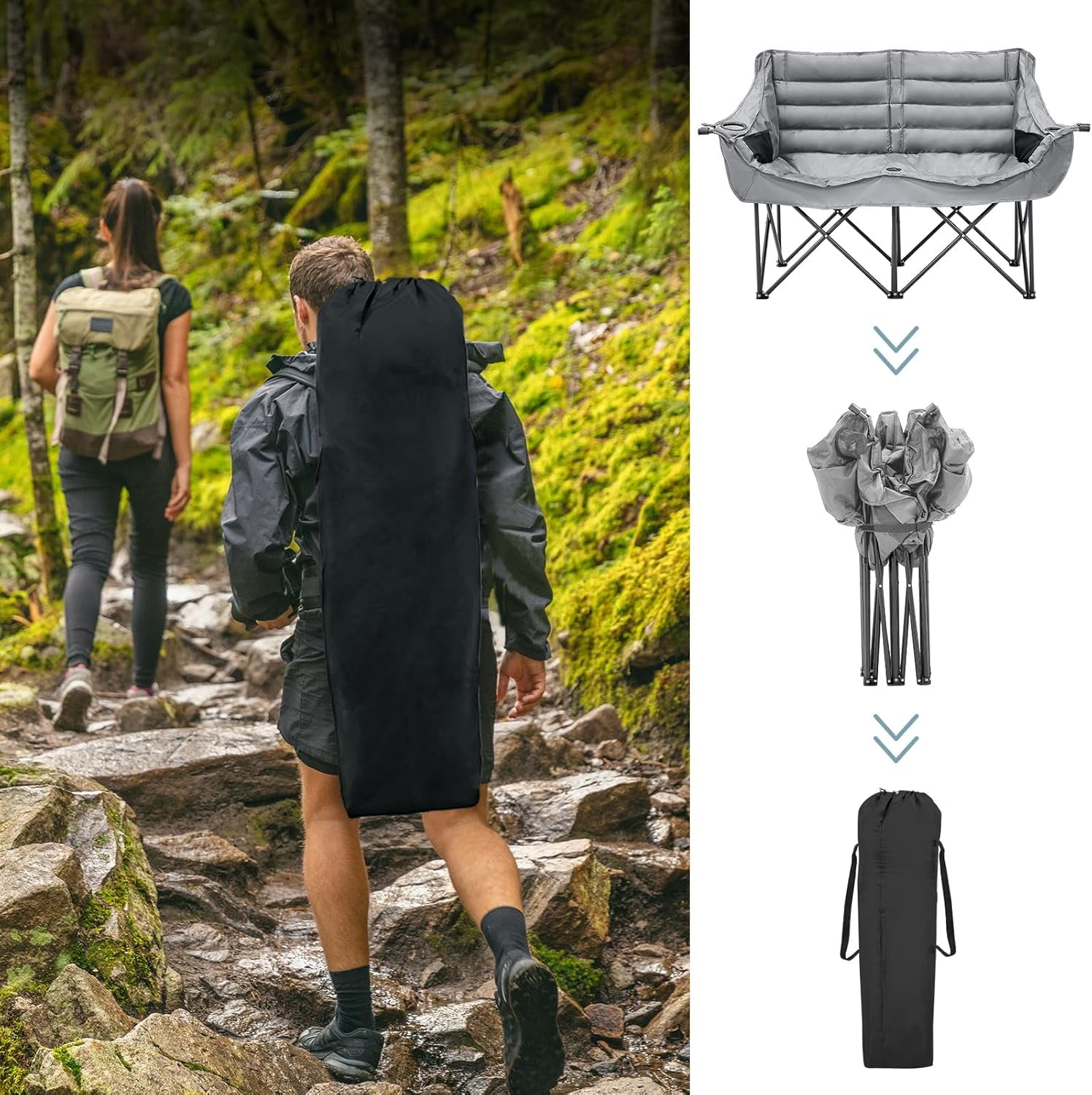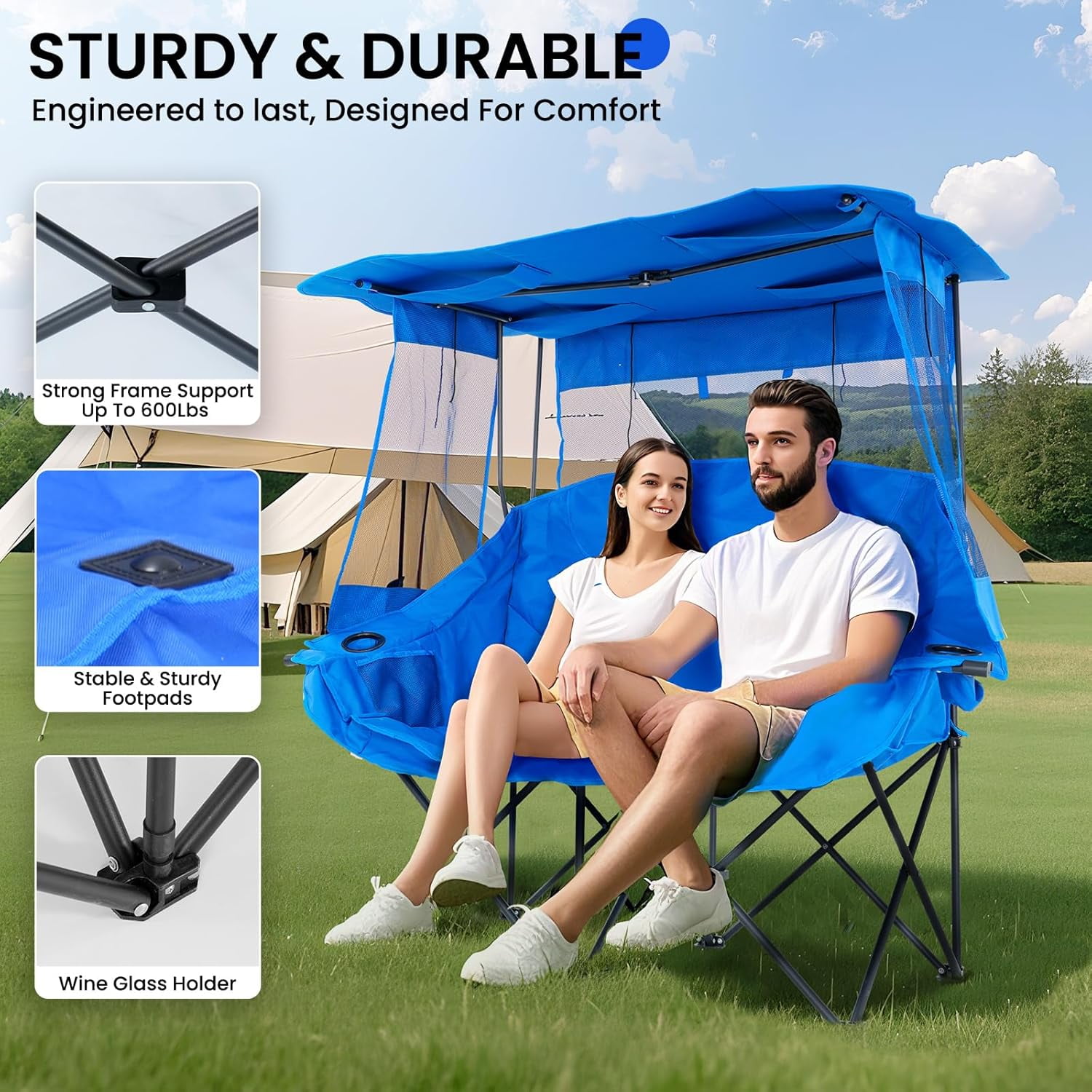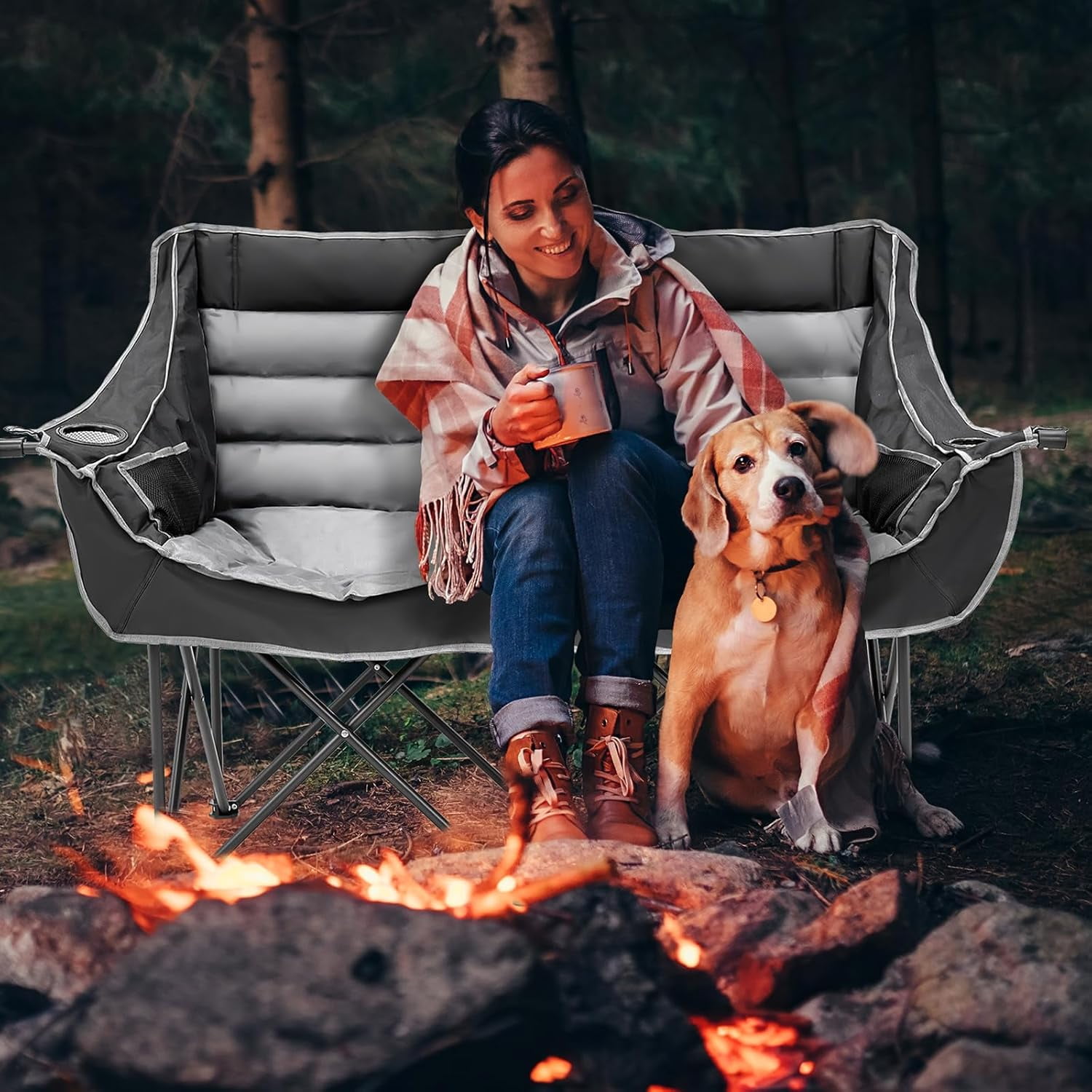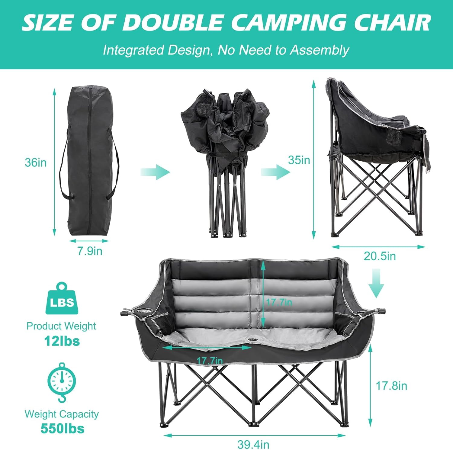 • Sturdy Construction: The Double Camping Chair features robust 600D oxford fabric, ABS tube sleeves, and reinforced stitching for enhanced durability, supporting up to 600 lbs.