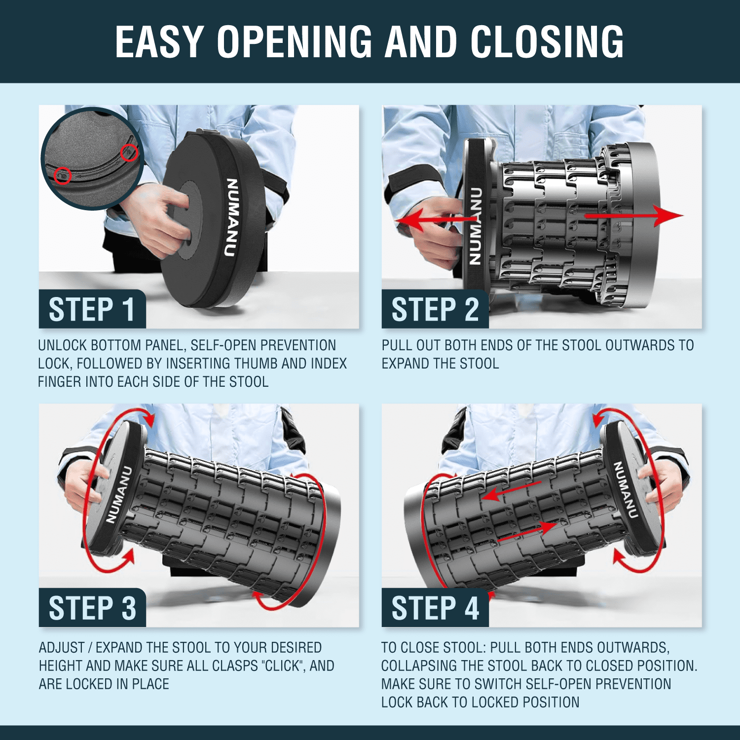 - Safety Lock: Features a self-open prevention lock to ensure the stool stays securely closed when not in use.