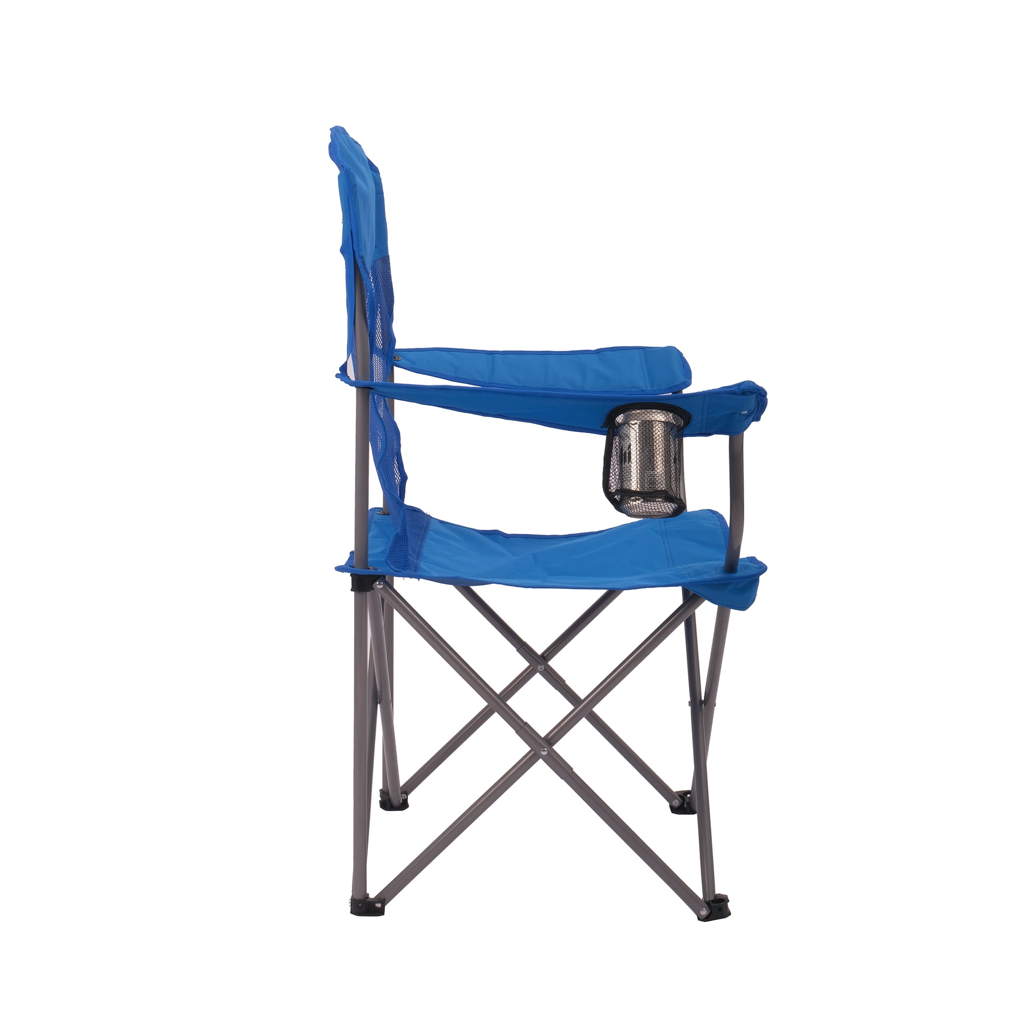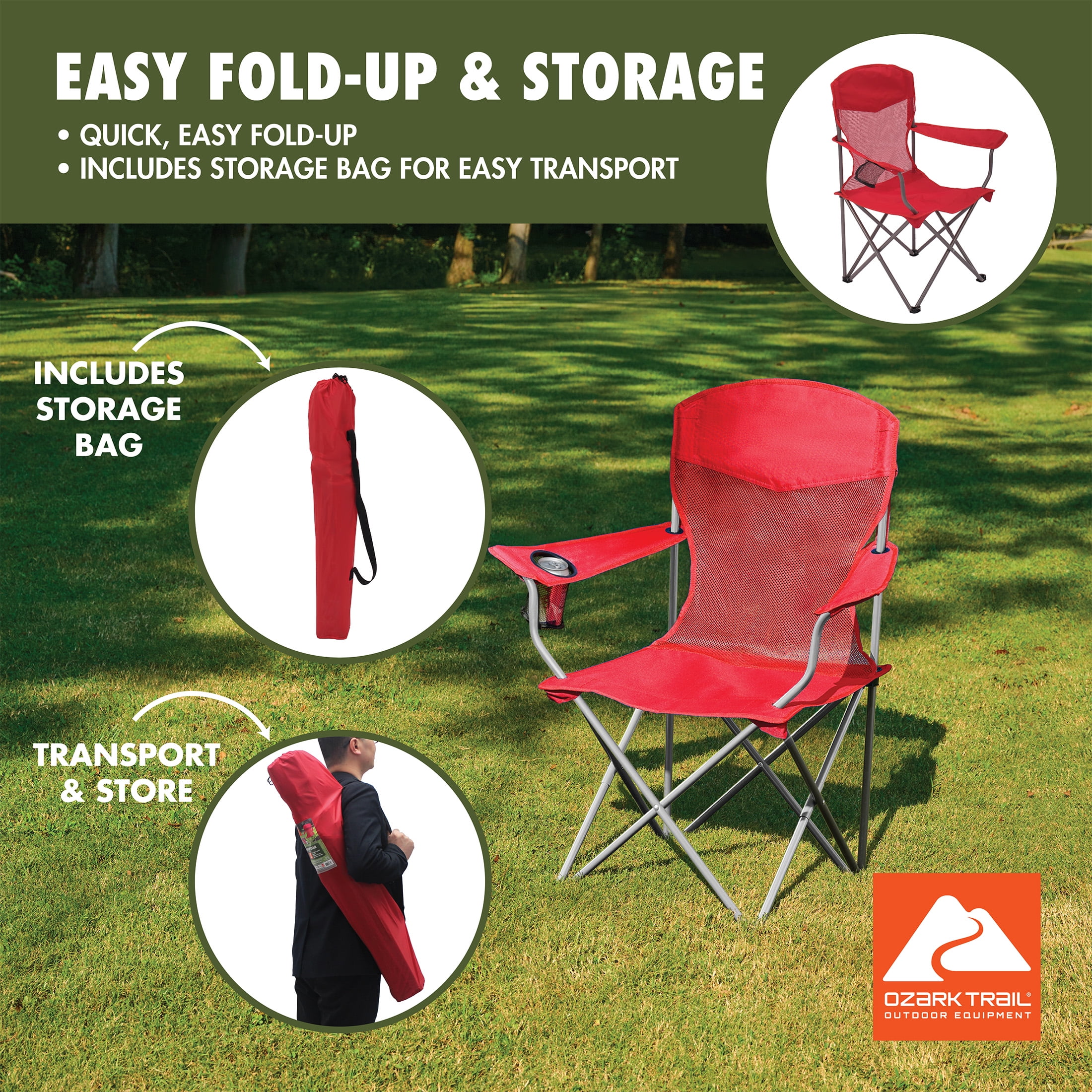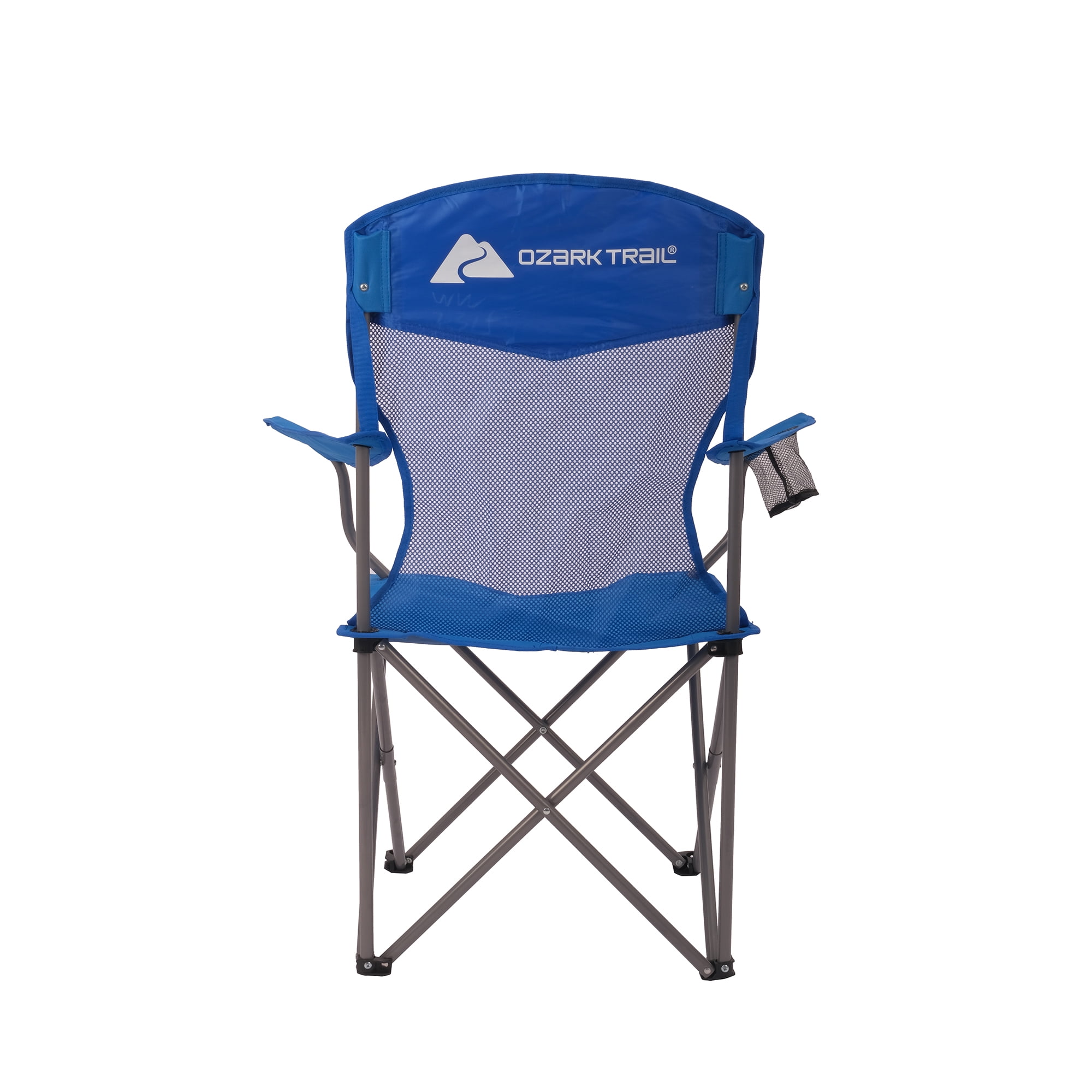 The Ozark Trail Mesh Folding Camping Chair in Blue is perfect for outdoor events, camping, and tailgating. The mesh back adds breathability, while the strong steel frame gives lasting support. It folds easily and comes with a built-in cup holder for added convenience. This lightweight chair is easy to carry and store, making it a great choice for outdoor comfort on the go.