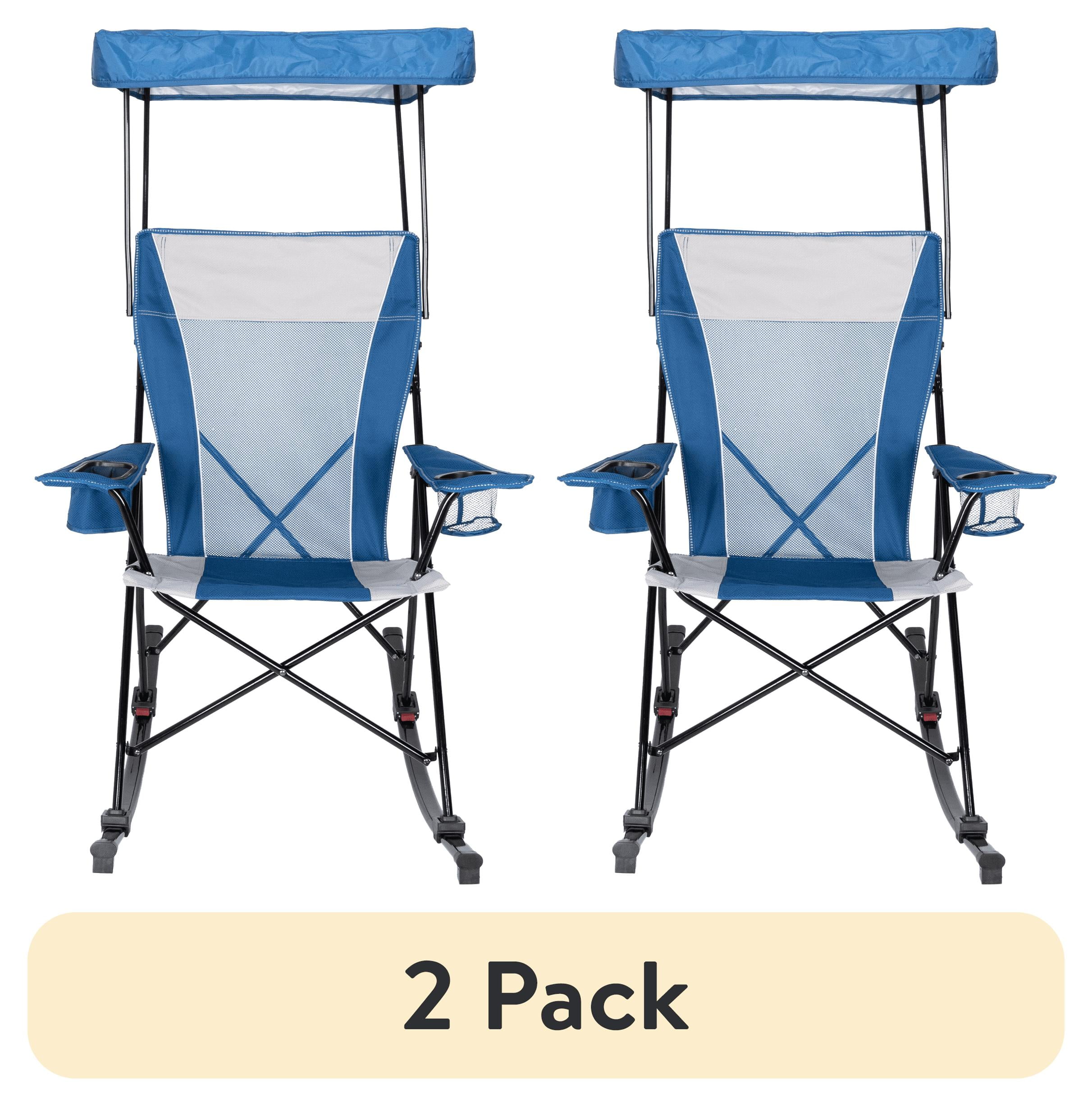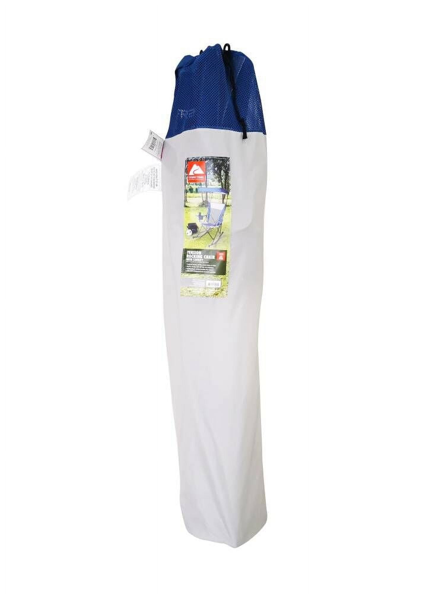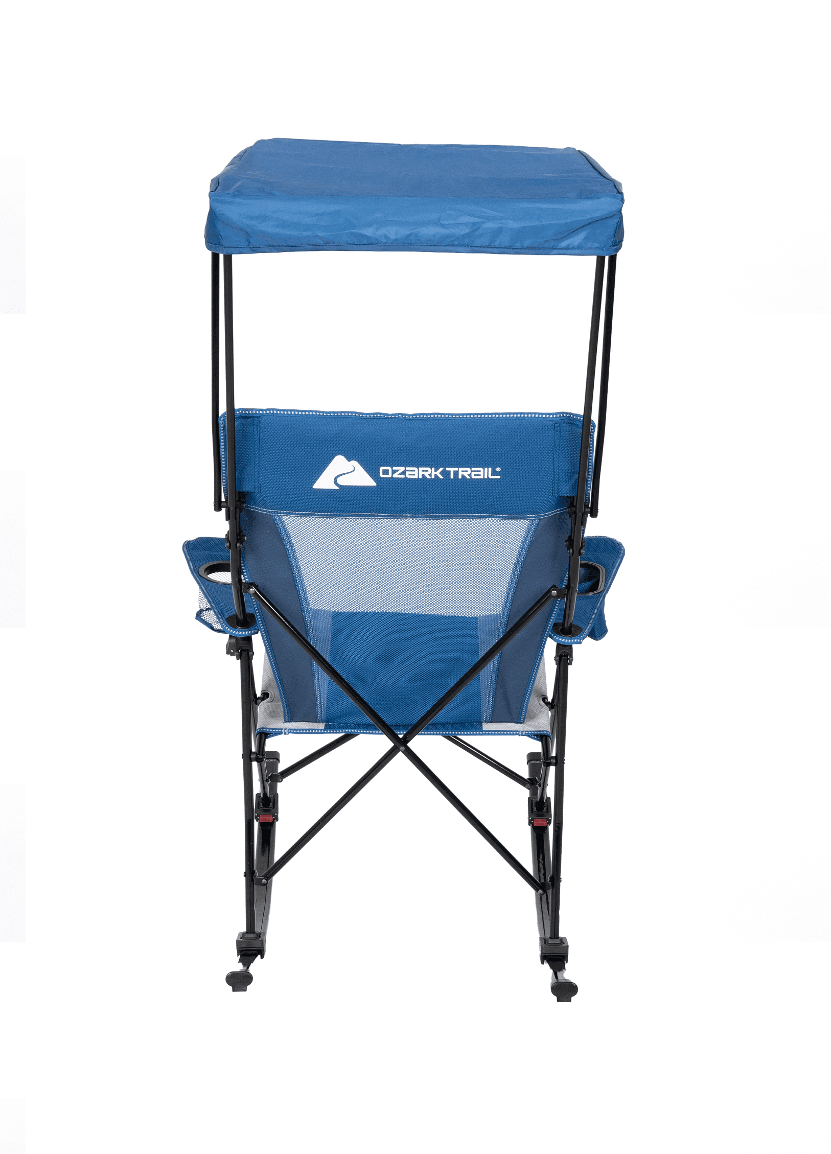 The grey and blue Ozark Trail Tension Rocking Chair with Canopy offers versatility, comfort and style for your outdoor and camping needs. Made with a sturdy steel frame, it can stand as a regular outdoor chair or convert into a rocking chair. With an overhead canopy and mesh backing for temperature control, the chair provides extra comfort. Use the cupholder to store all your drinks. A nice added feature to this item is the pocket on the other arm that allows for the protection of valuables, such as cell phones and wallets. With dimensions of 35.5″W x 39.5″D x 41″H, which is just right for relaxing outdoors or attending a sporting event. The Ozark Trail Tension Camp Rocking Chair is a good choice for any avid outdoor lover or camper. Perfect for any teen or adult.