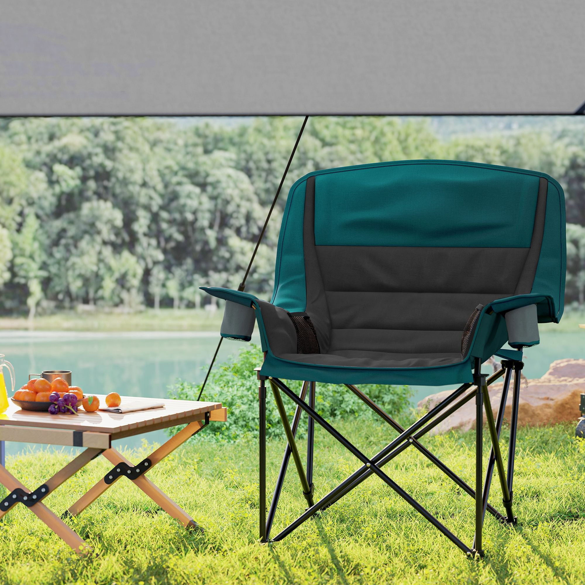 • – Convenient Storage Options: Equipped with two cup holders and side pockets, this lawn chair allows you to easily store snacks, beverages, smartphones, and other camping essentials within arm’s reach