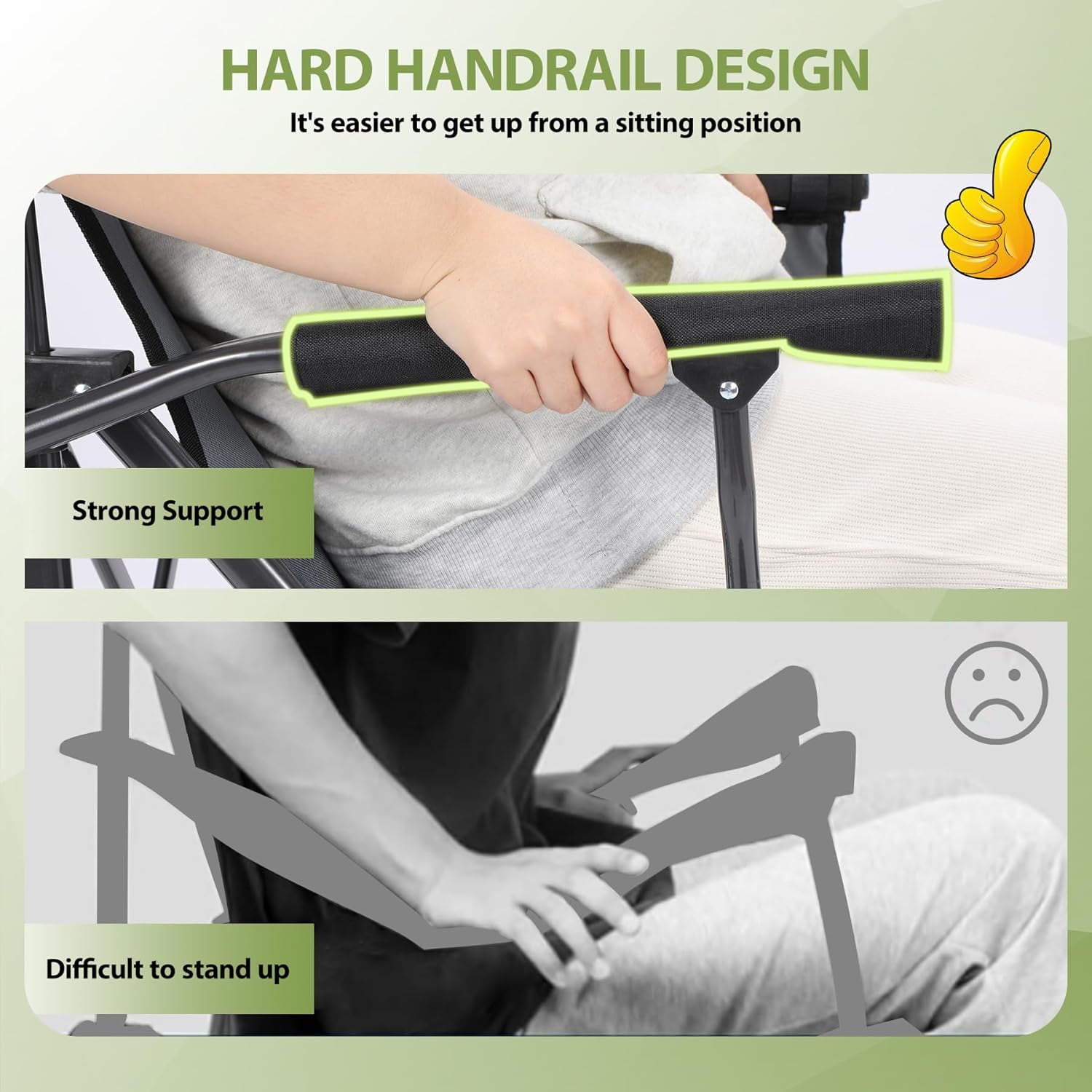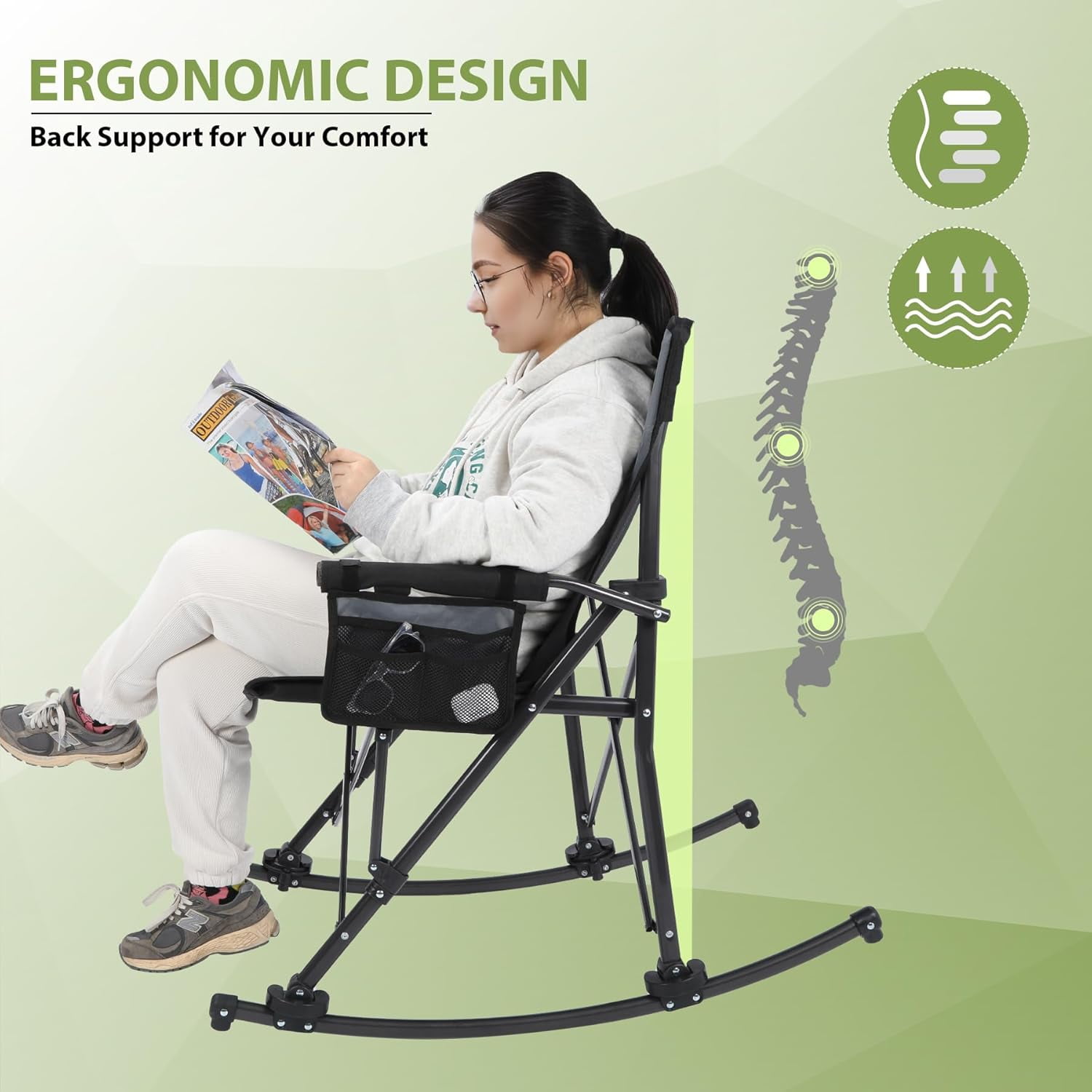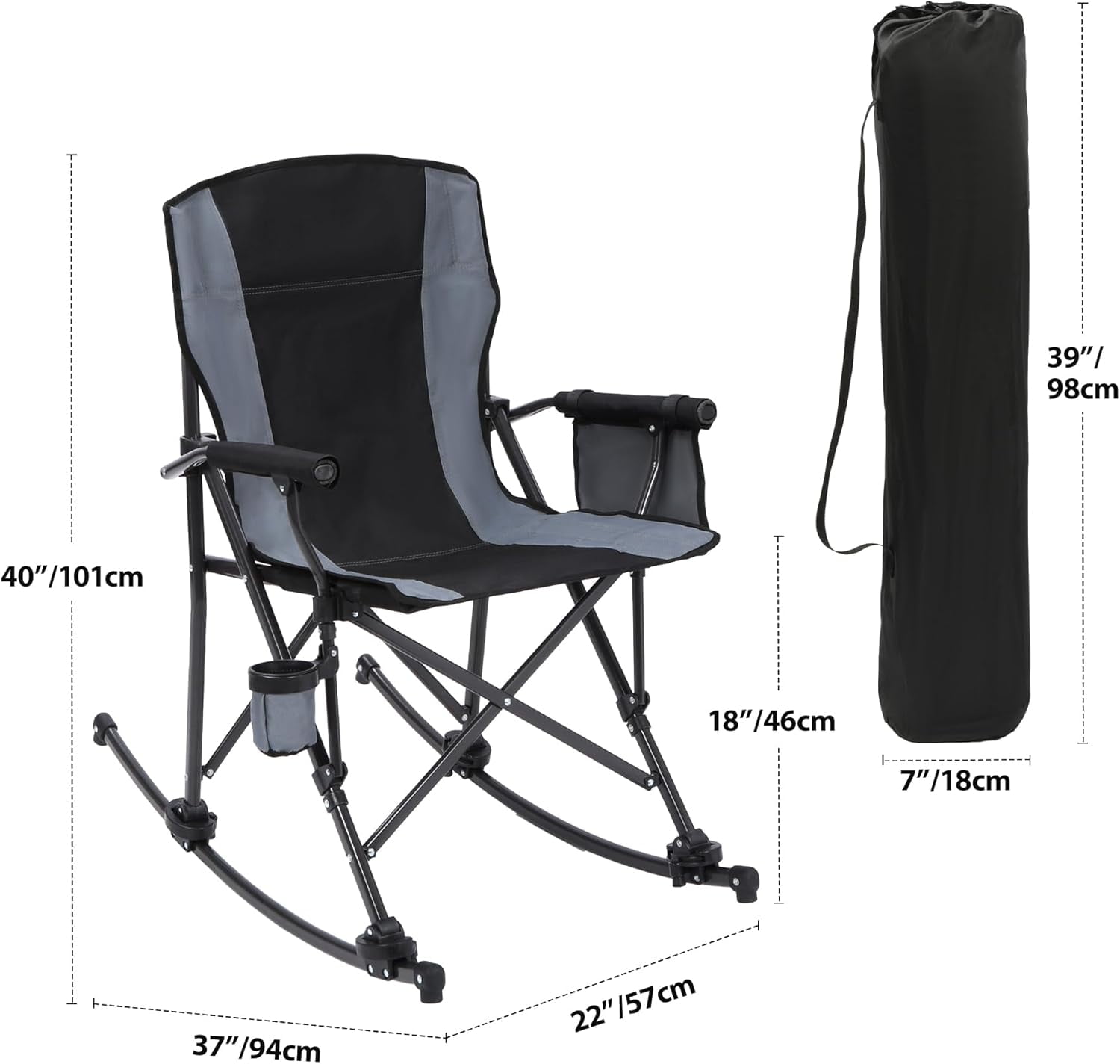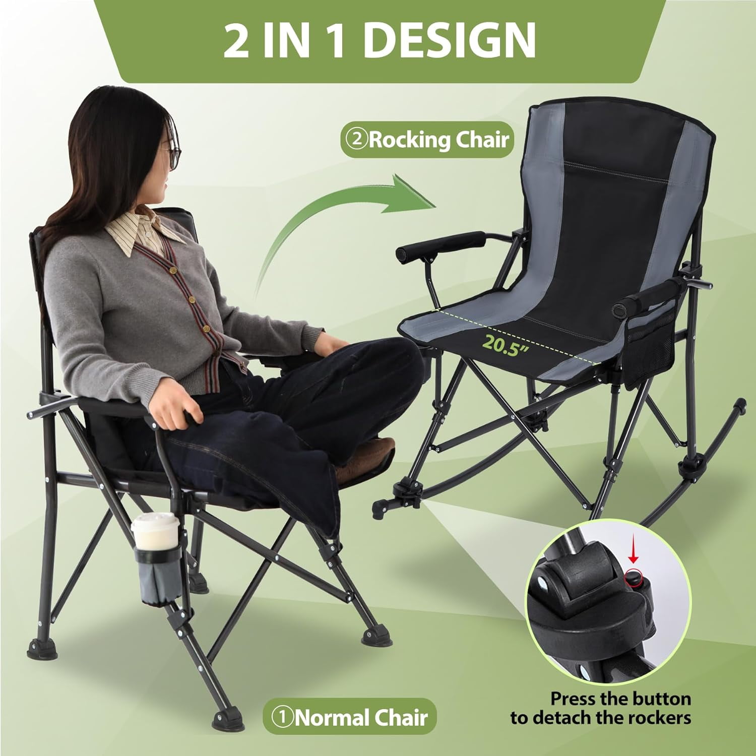 - Versatile Design: Features a 2-in-1 design, functioning as a rocking chair with removable rockers or a standard camping chair, enhanced with soft armrests and back.