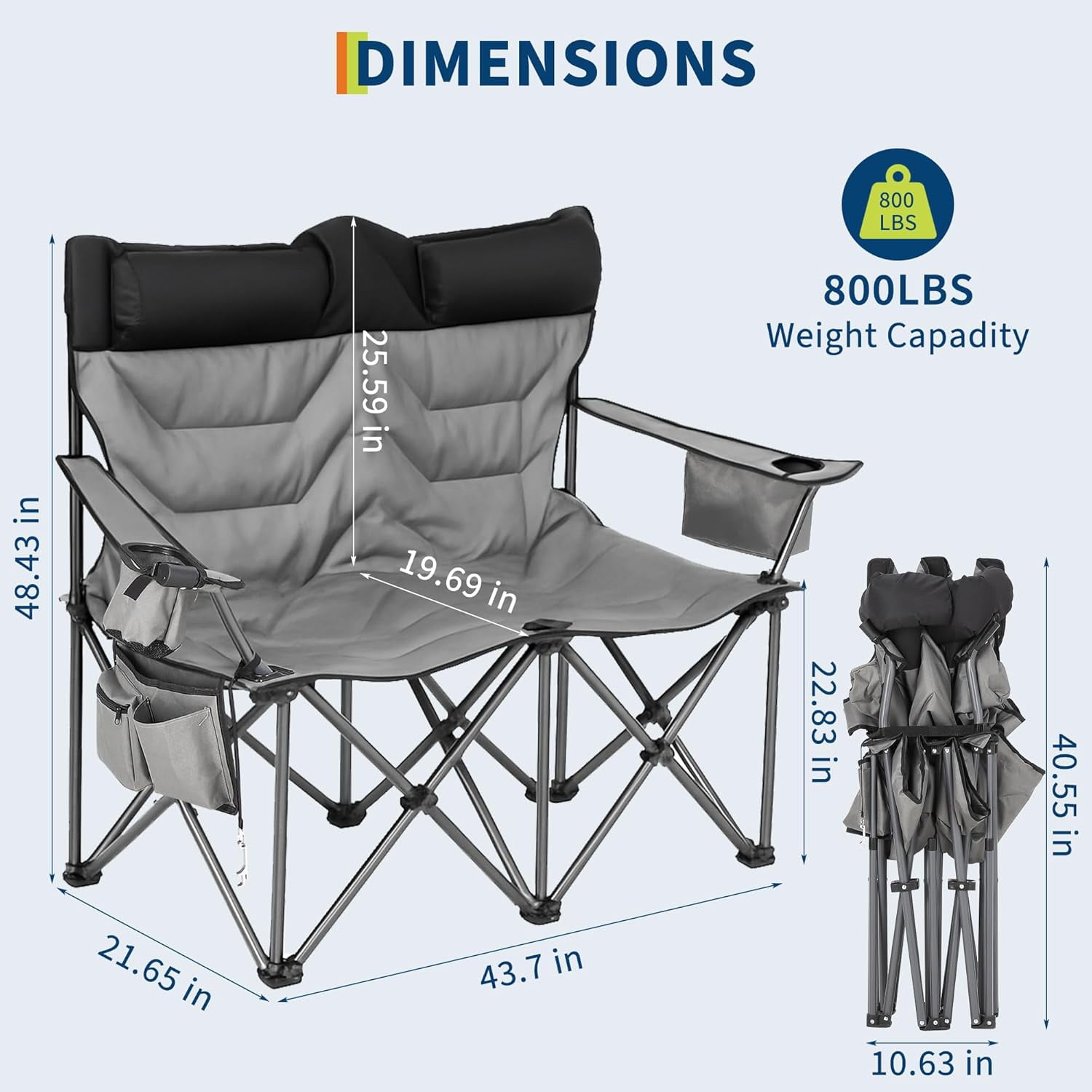 This Riedhoff double camping chair is perfect for sharing with a friend or loved one. Enjoy comfortable seating with its high back and included pillows. The sturdy, grey and black chair features convenient cup holders on each side, ideal for your drinks at your next outdoor event. Its foldable design and included carrying bag make transportation and storage a breeze. With a weight capacity of 800 lbs, this chair is built to last. The chair’s dimensions are approximately 48.43 inches high, 43.7 inches wide, and 21.65 inches deep when open. When folded, it measures approximately 40.55 inches high, 22.83 inches wide, and 10.63 inches deep.
