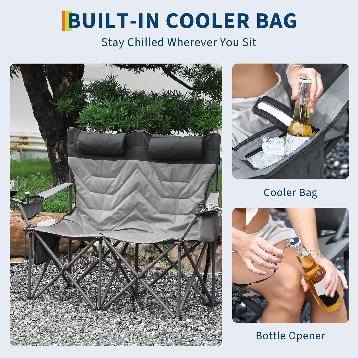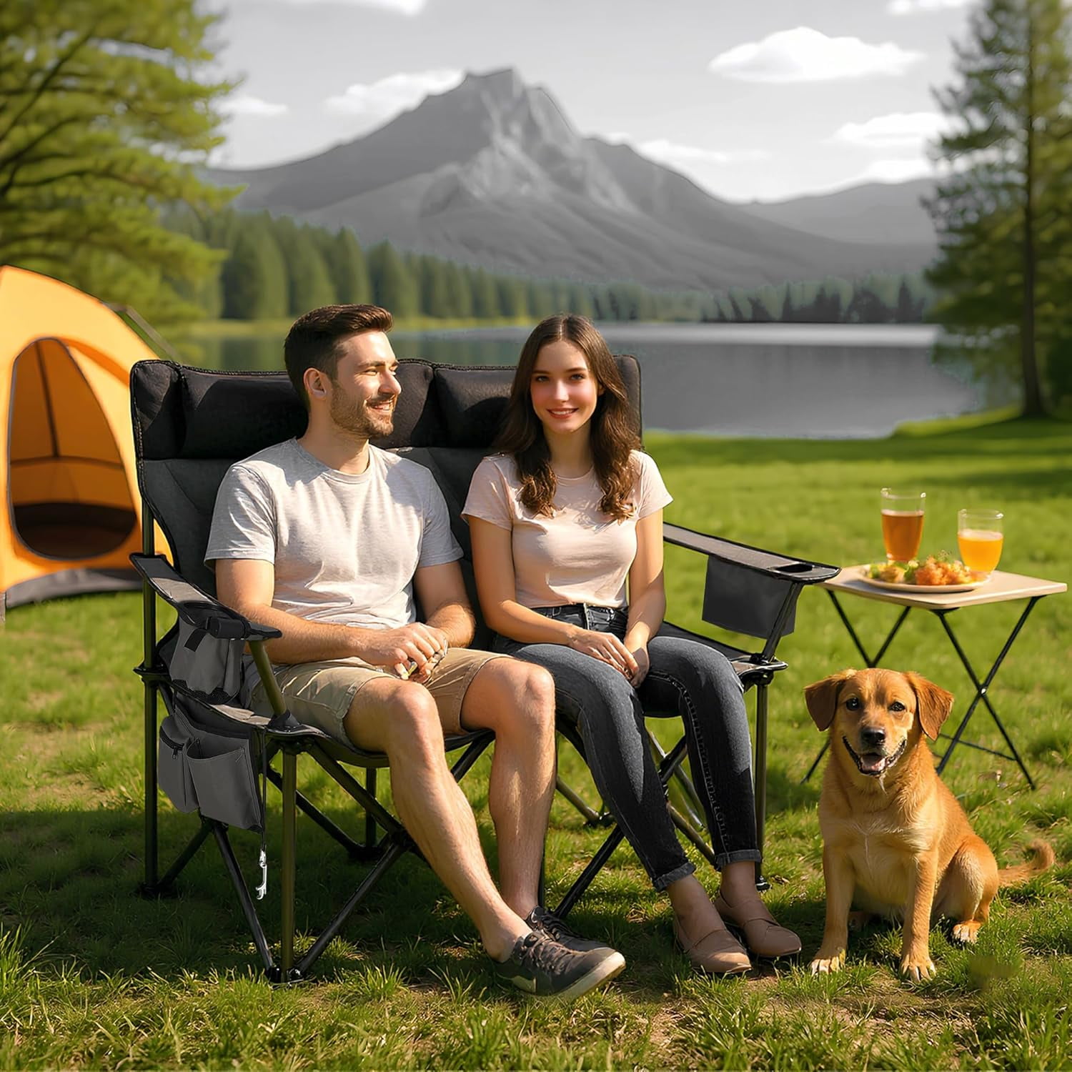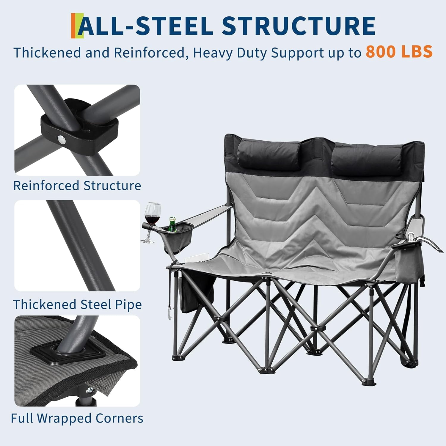 Robust Construction: Engineered with a reinforced steel frame and military-grade fabric, this oversized double camping chair supports up to 800 lbs, featuring rust-proof powder coating for all-weather durability.
