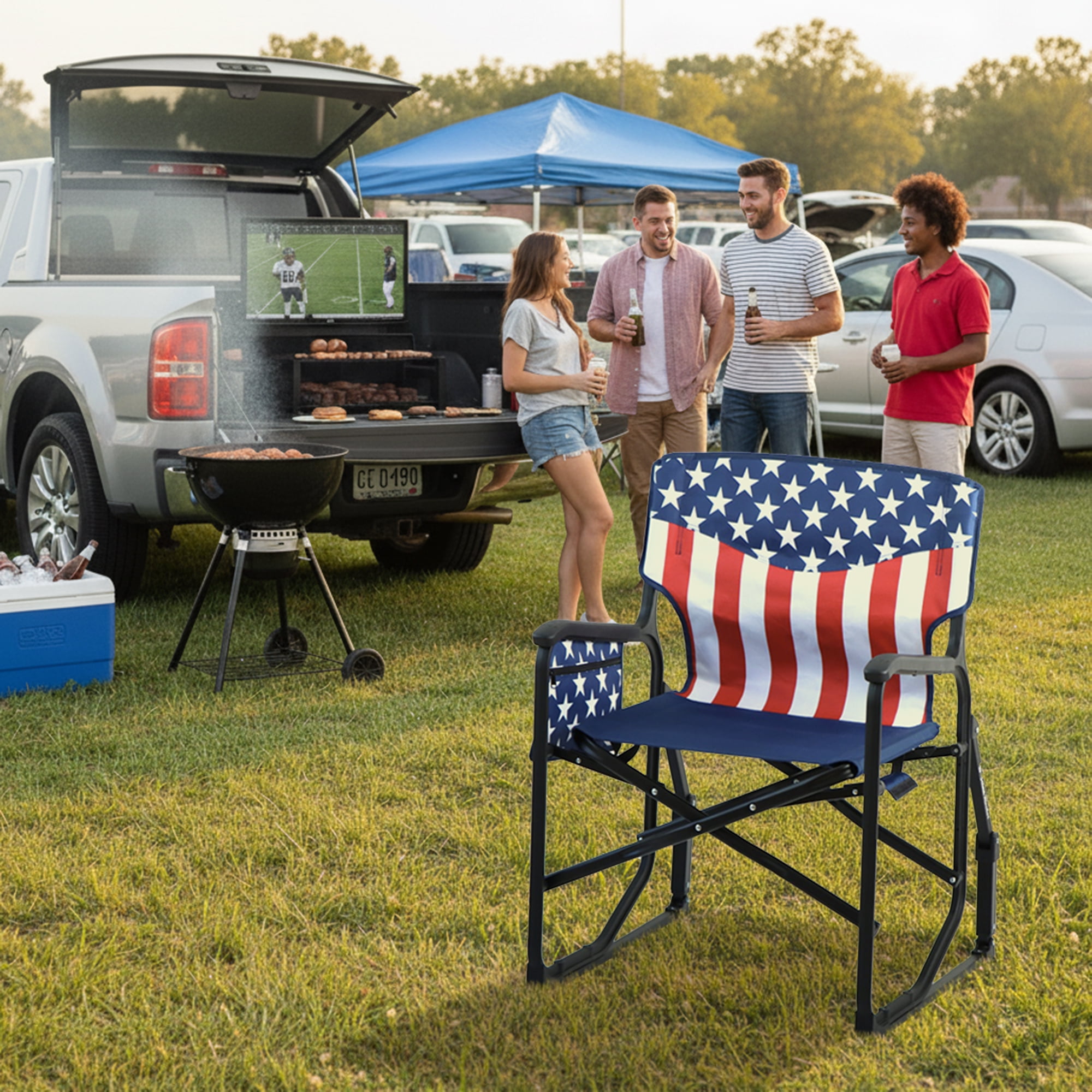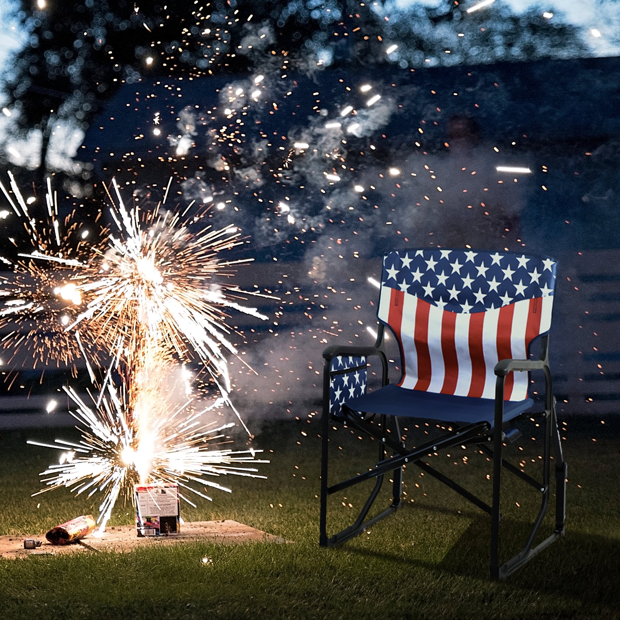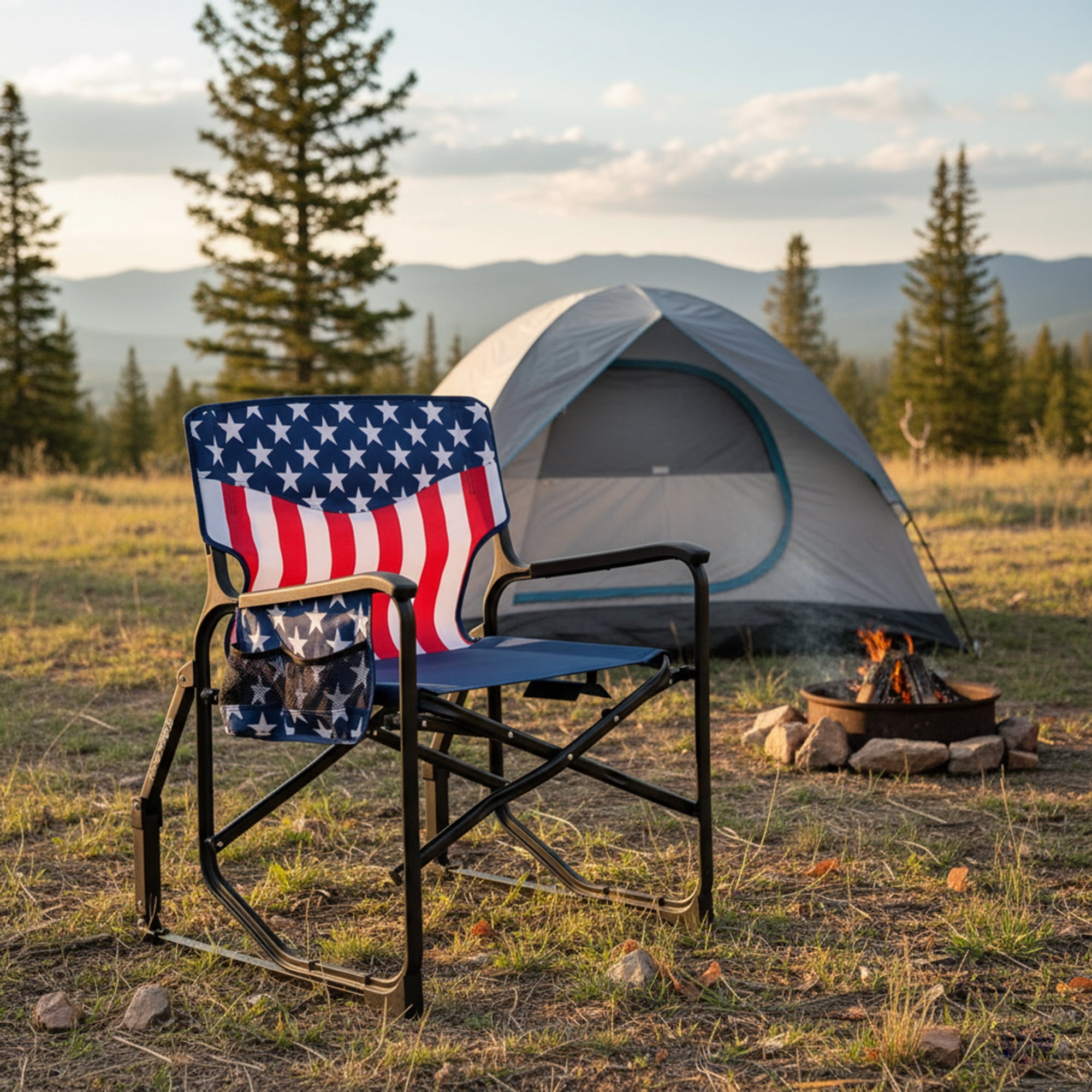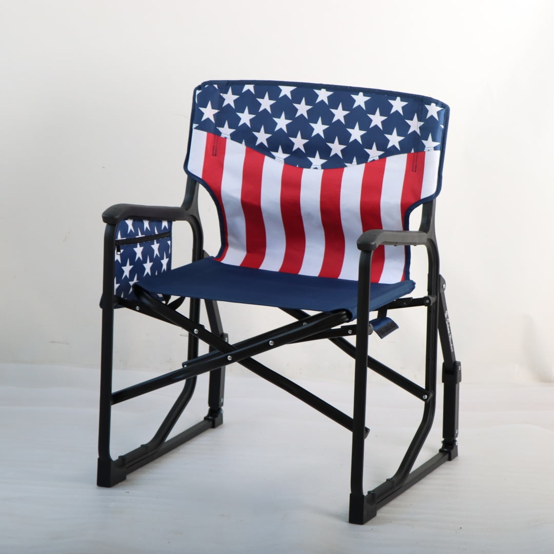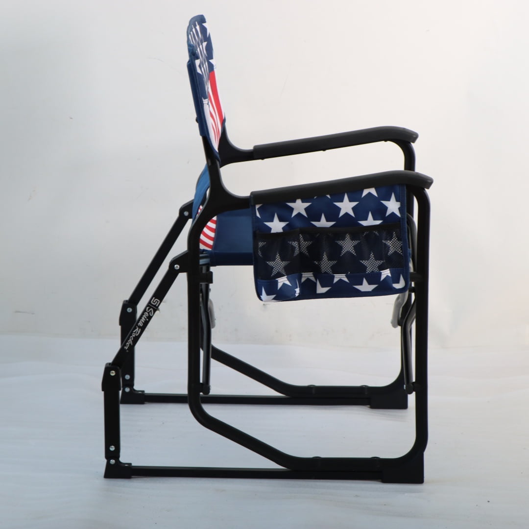 Indulge in outdoor leisure with the Seina Patriotic Outdoor Foldable Rocking Chair, designed for both comfort and style. This robust chair boasts a weight capacity of up to 300 pounds, made possible by its powder-coated steel frame and durable 600D polyester fabric. The chair includes a mesh cup holder and a side pocket, keeping essentials within arm’s reach.