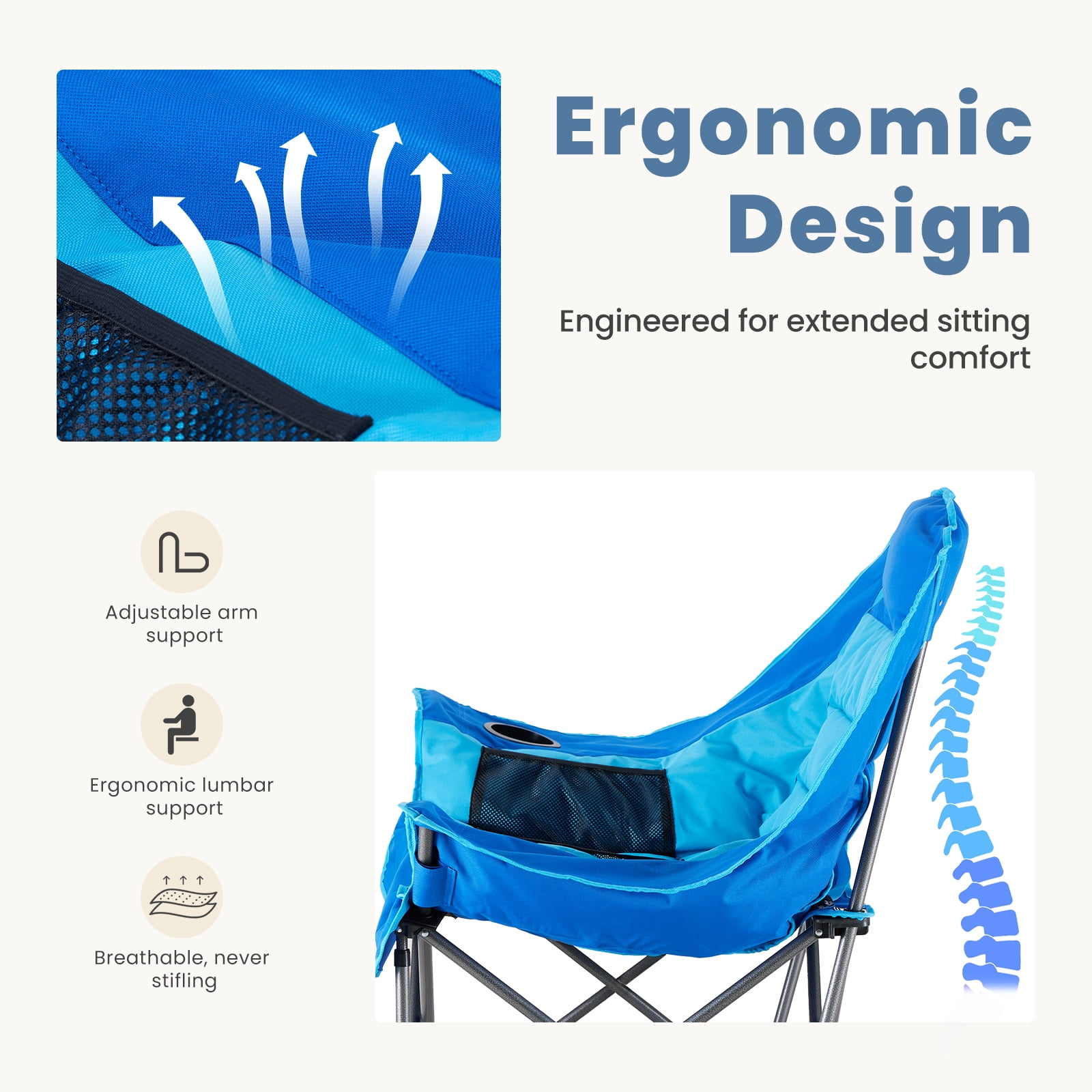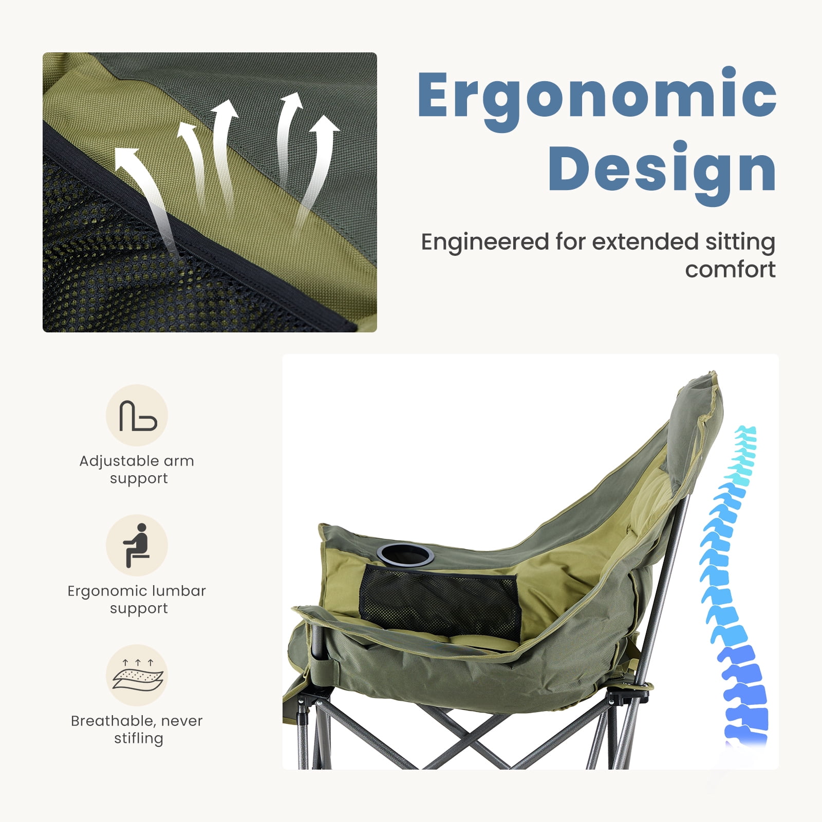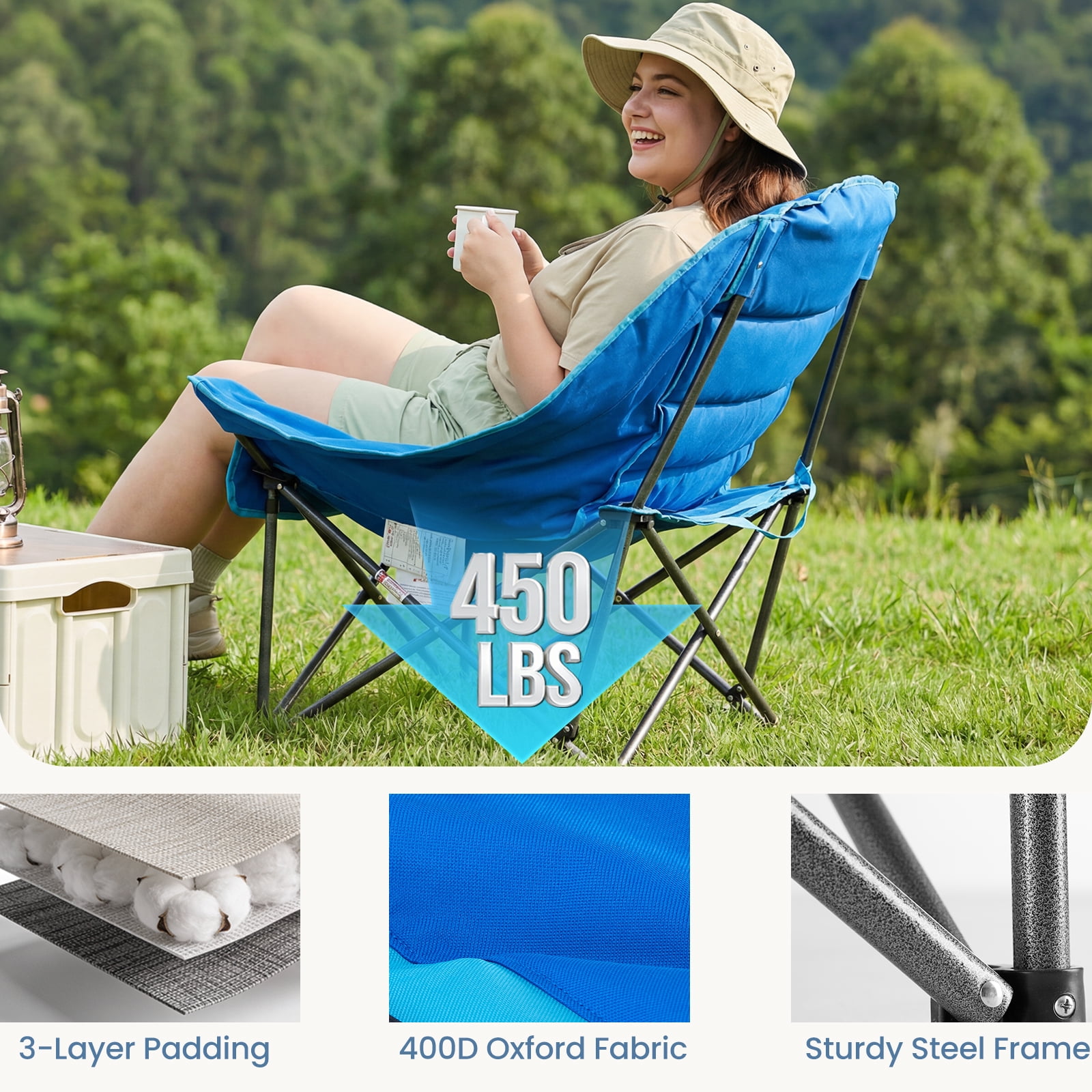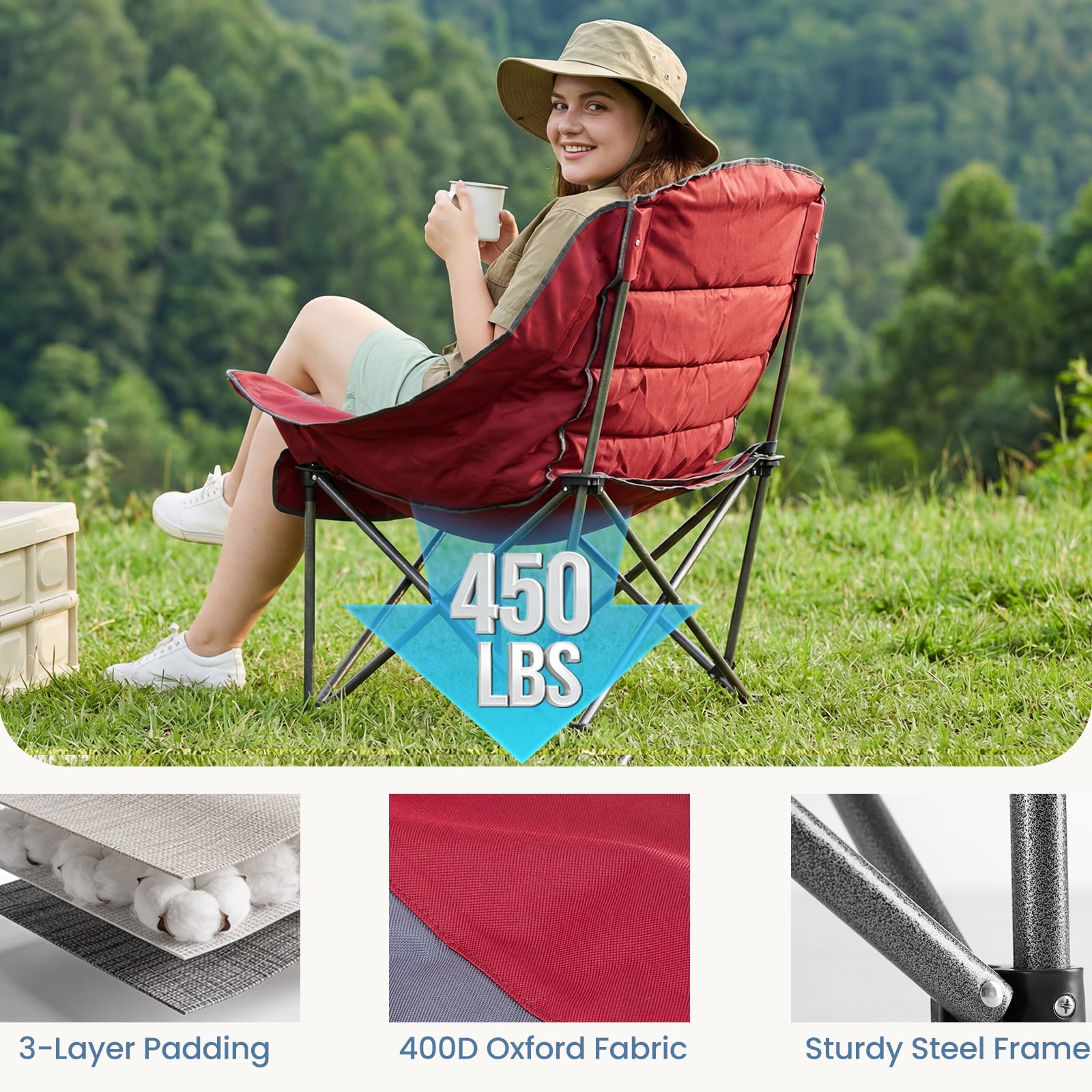 [Strong & Durable] Built to last with a tough steel frame and upgraded supports. It holds up to 400 pounds. The steel frame has a powder-coated surface to prevent rust and fading. The fabric is strong, tear-resistant Oxford cloth (600D), tightly stitched and breathable. This chair stays stable for long-term use.