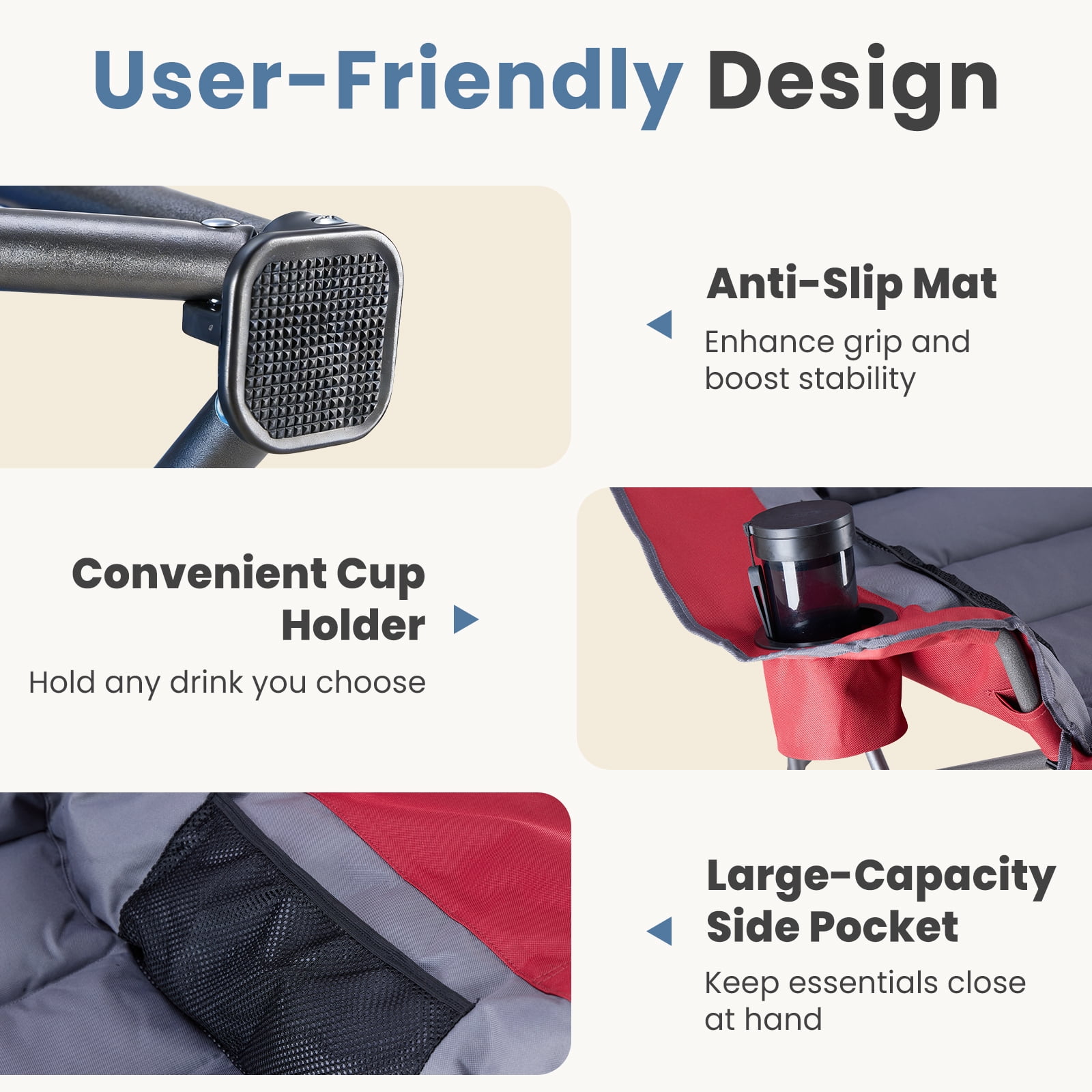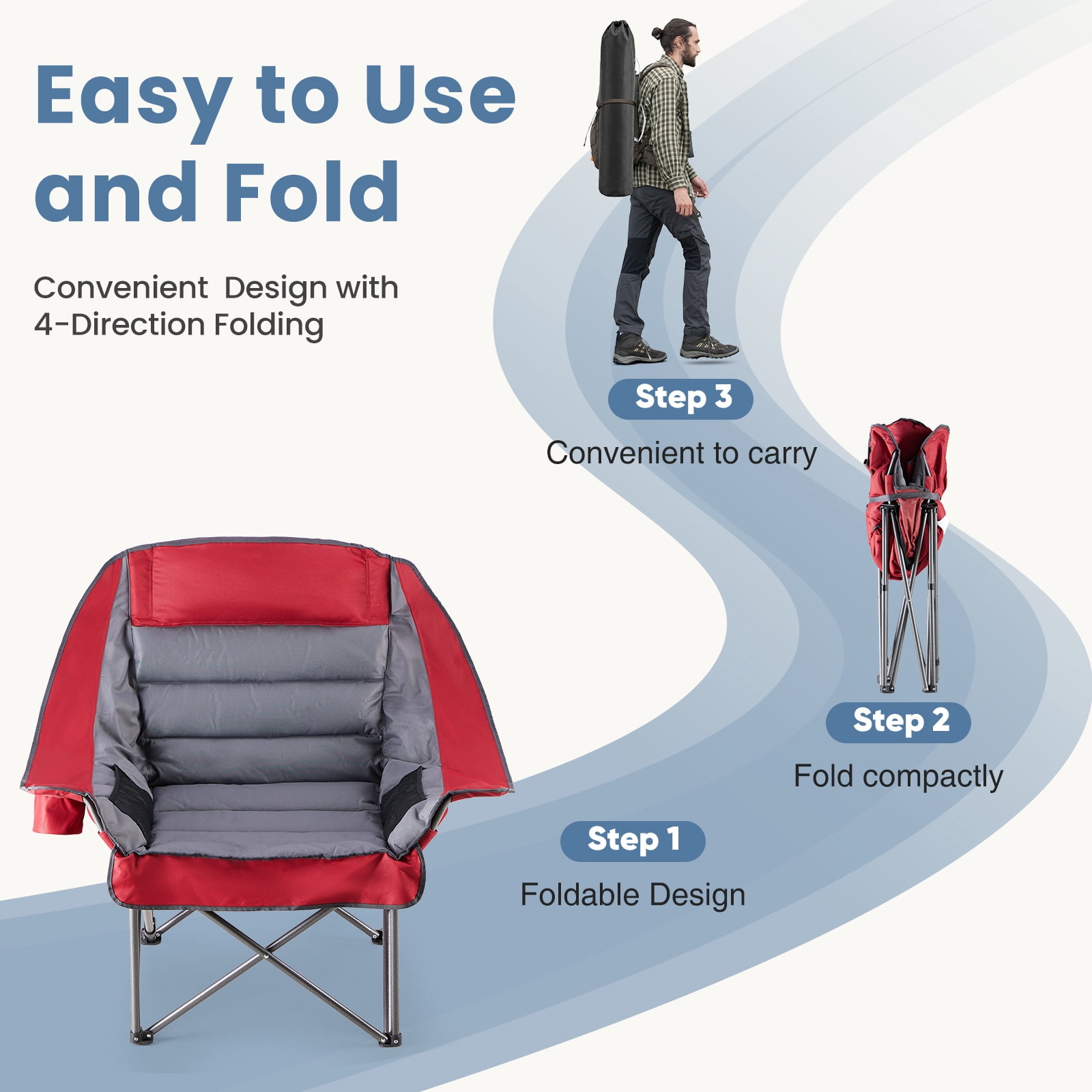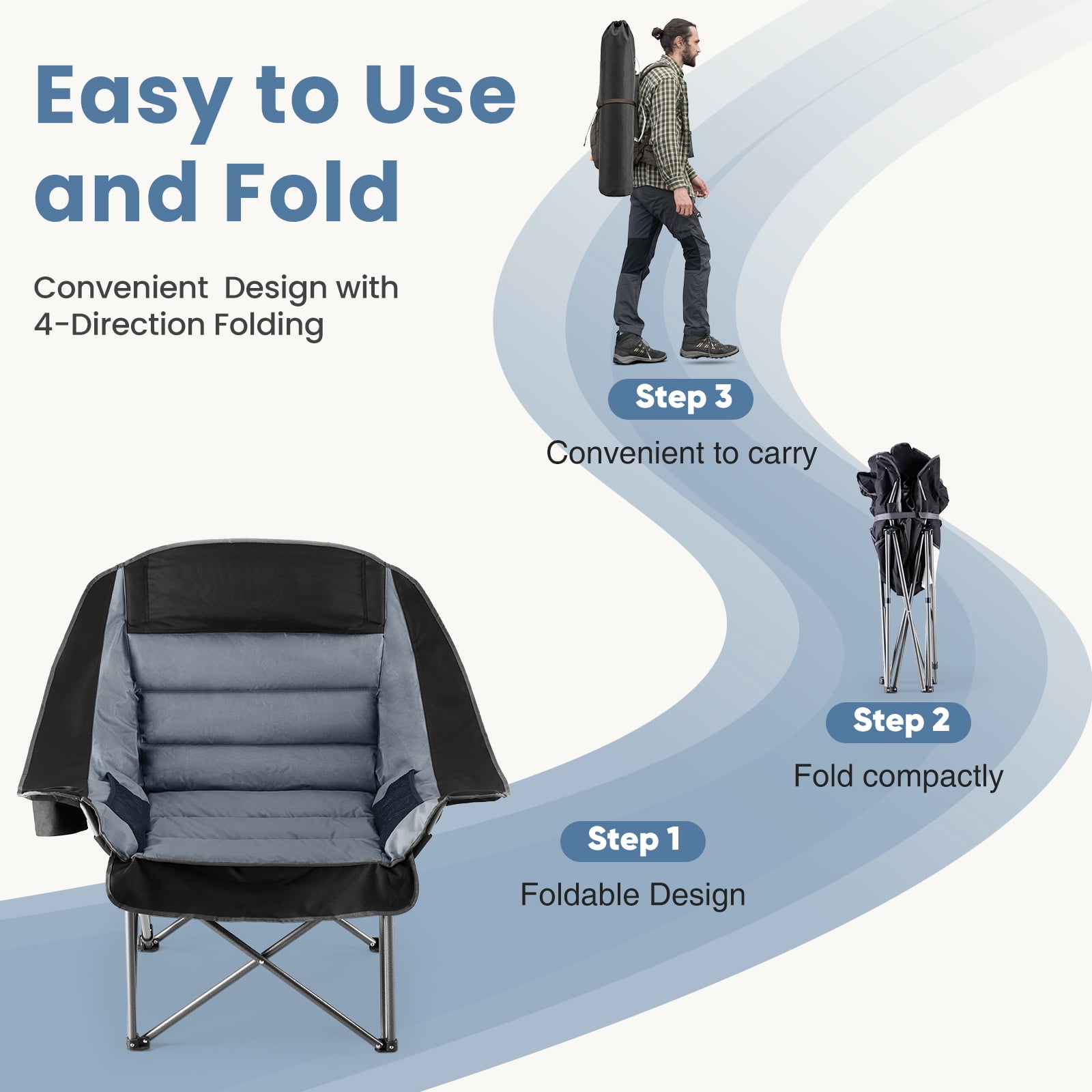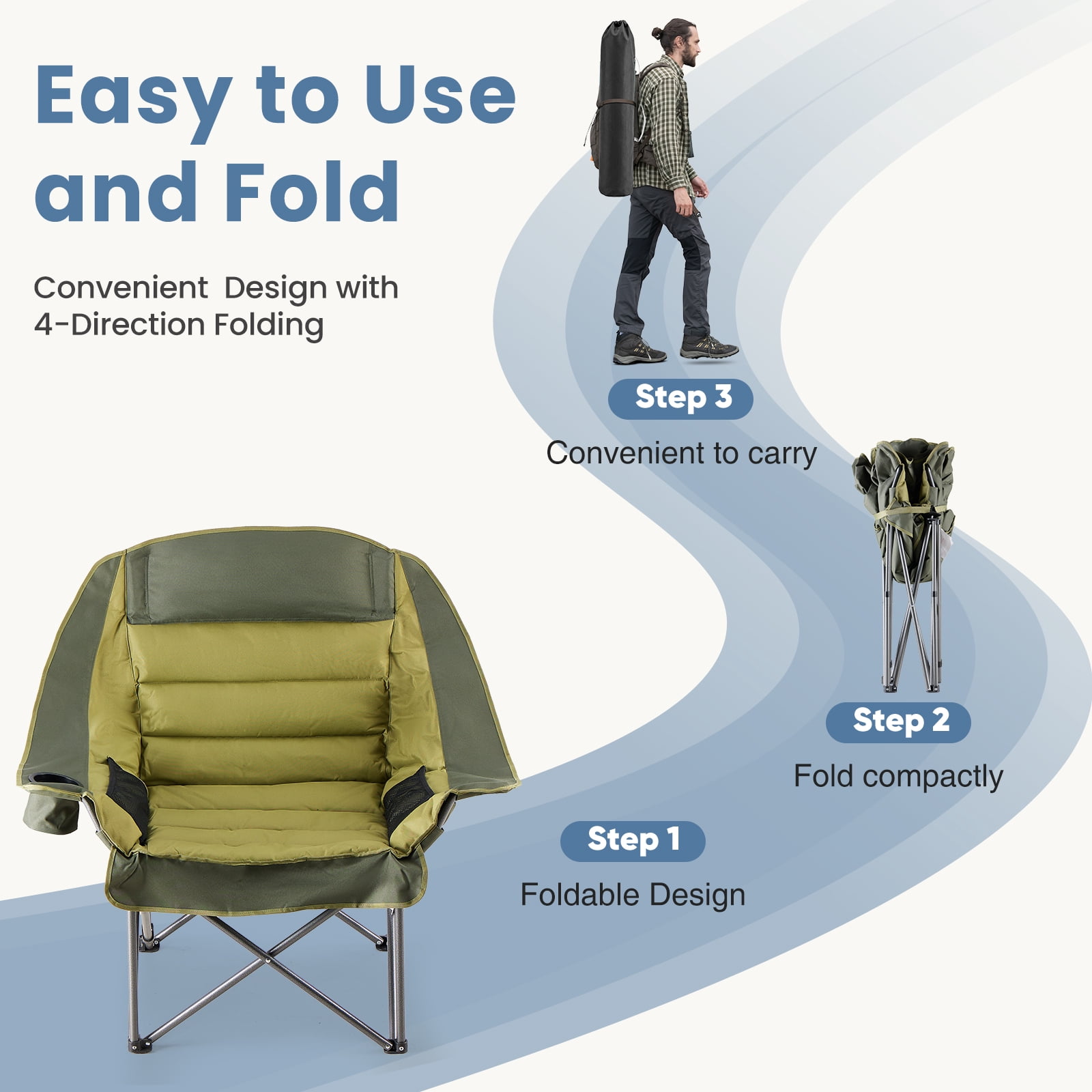 [Strong & Durable] Built to last with a tough steel frame and upgraded supports. It holds up to 400 pounds. The steel frame has a powder-coated surface to prevent rust and fading. The fabric is strong, tear-resistant Oxford cloth (600D), tightly stitched and breathable. This chair stays stable for long-term use.