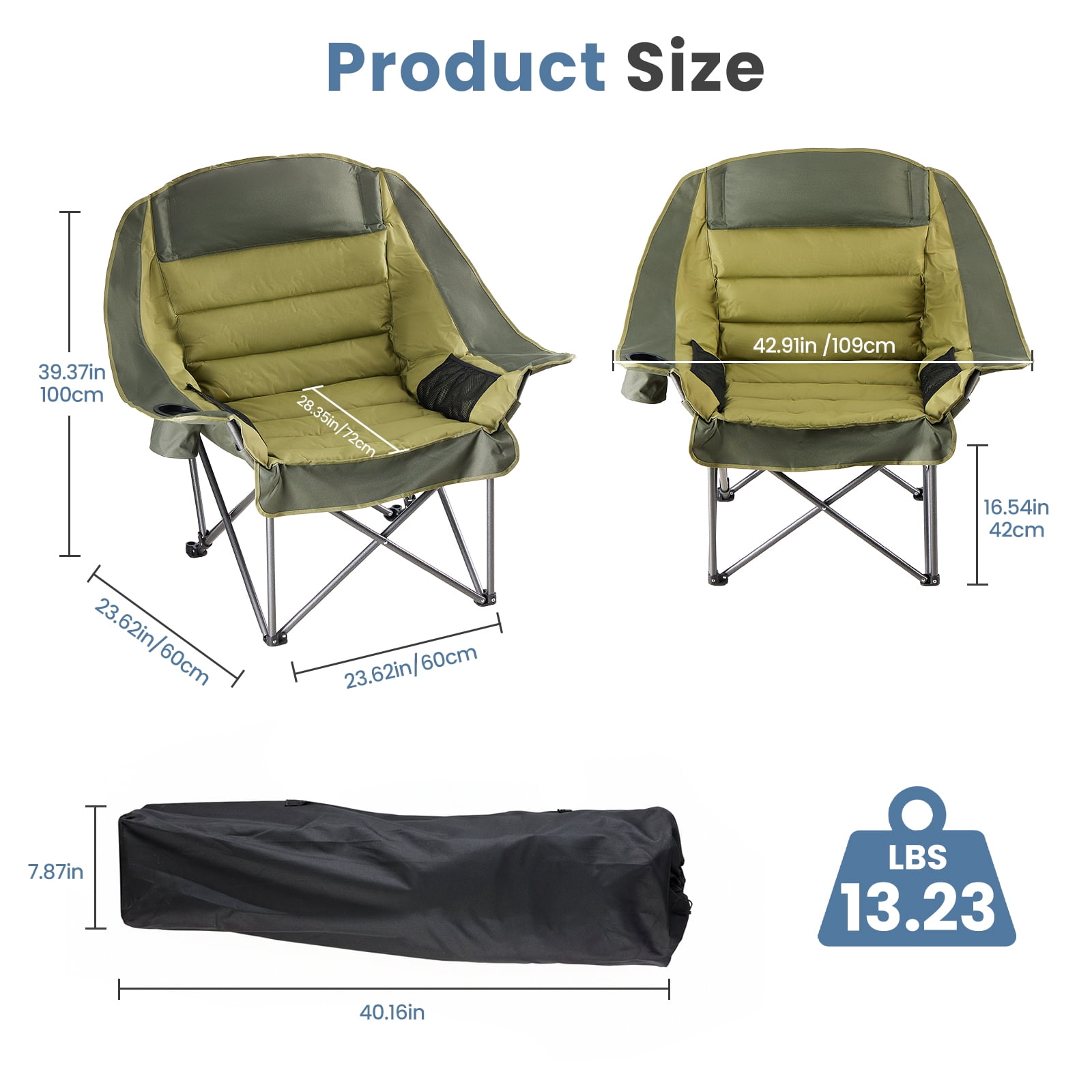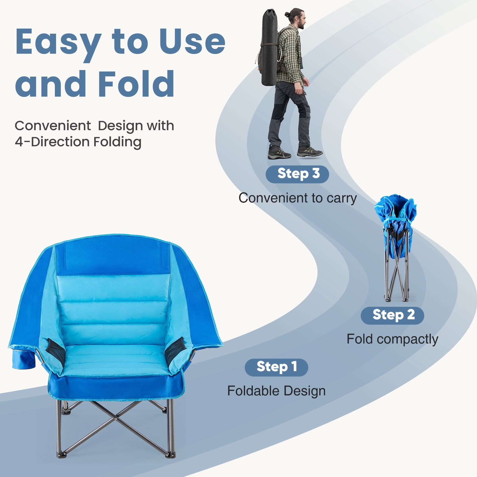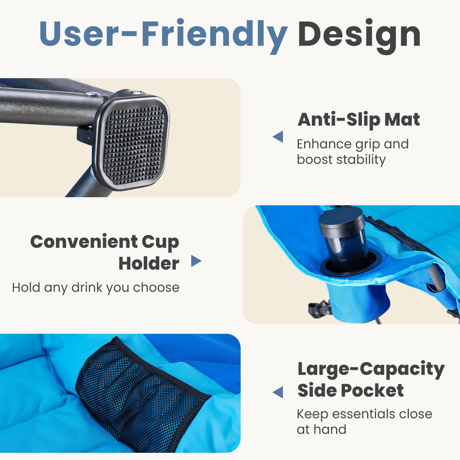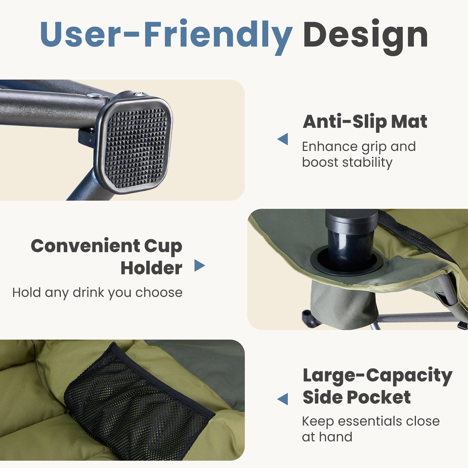 [Strong & Durable] Built to last with a tough steel frame and upgraded supports. It holds up to 400 pounds. The steel frame has a powder-coated surface to prevent rust and fading. The fabric is strong, tear-resistant Oxford cloth (600D), tightly stitched and breathable. This chair stays stable for long-term use.