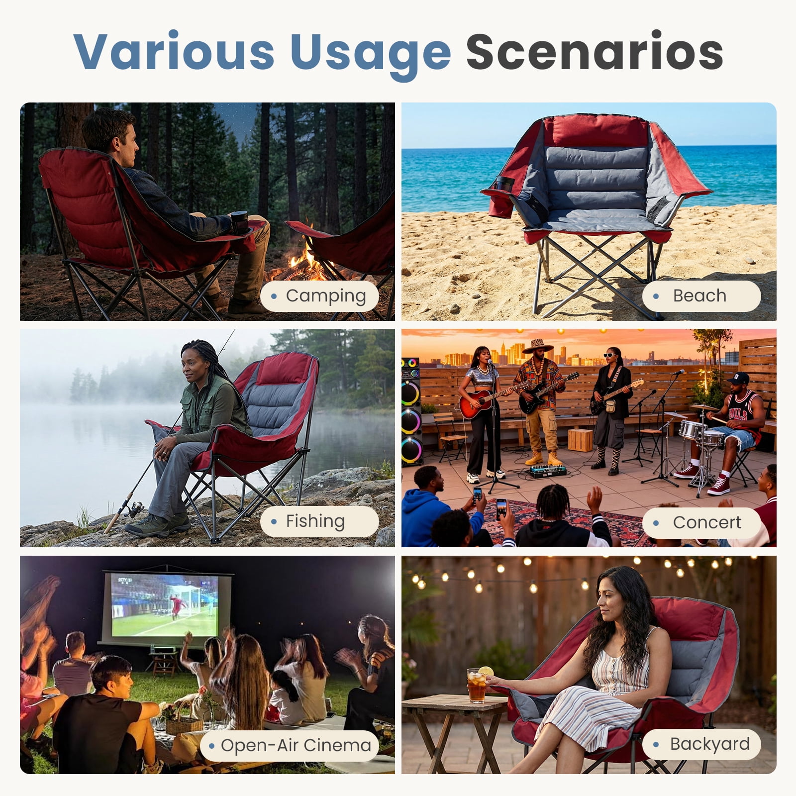[Many Uses] This folding chair is great for hiking, camping, and fishing. It’s also perfect for outdoor concerts, picnics, movies, or relaxing at home. It’s a versatile seating choice for lots of different places and events.