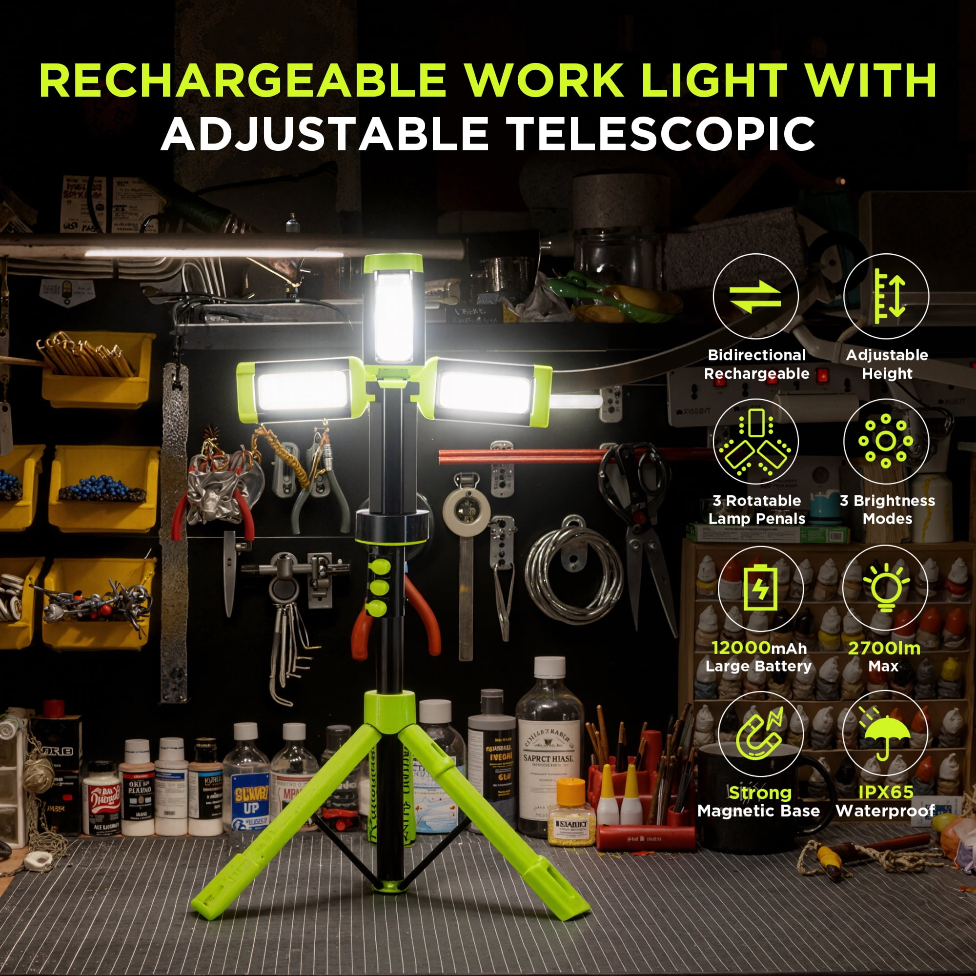 Steelite Rechargeable Camping Light with Stand 74″,Portable Cordless LED Work Light with 3 LED Lamp Heads,2700 Lumens Foldable Working Lantern with Detachable Tripod