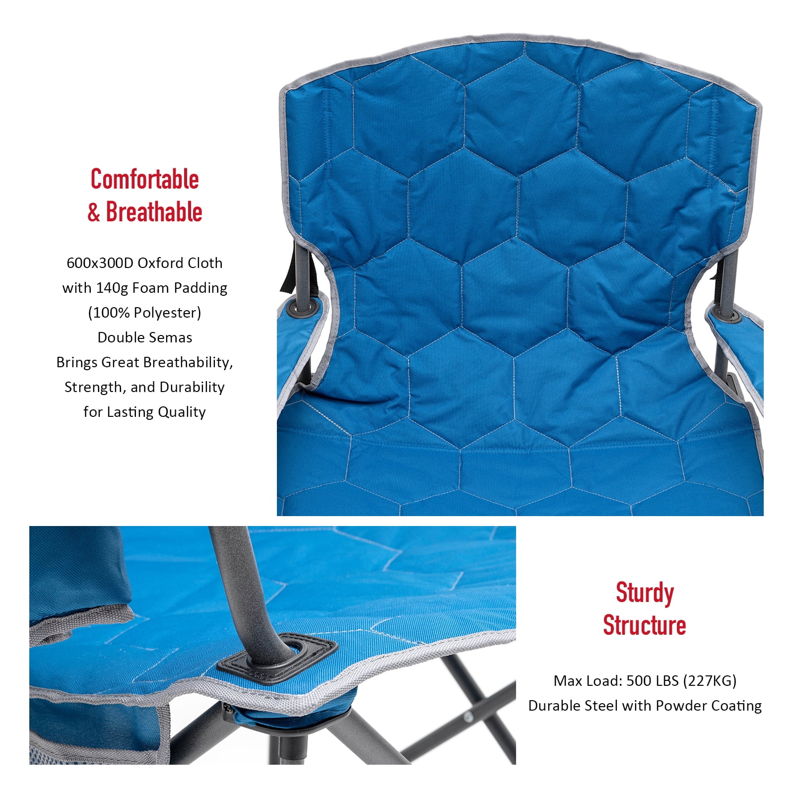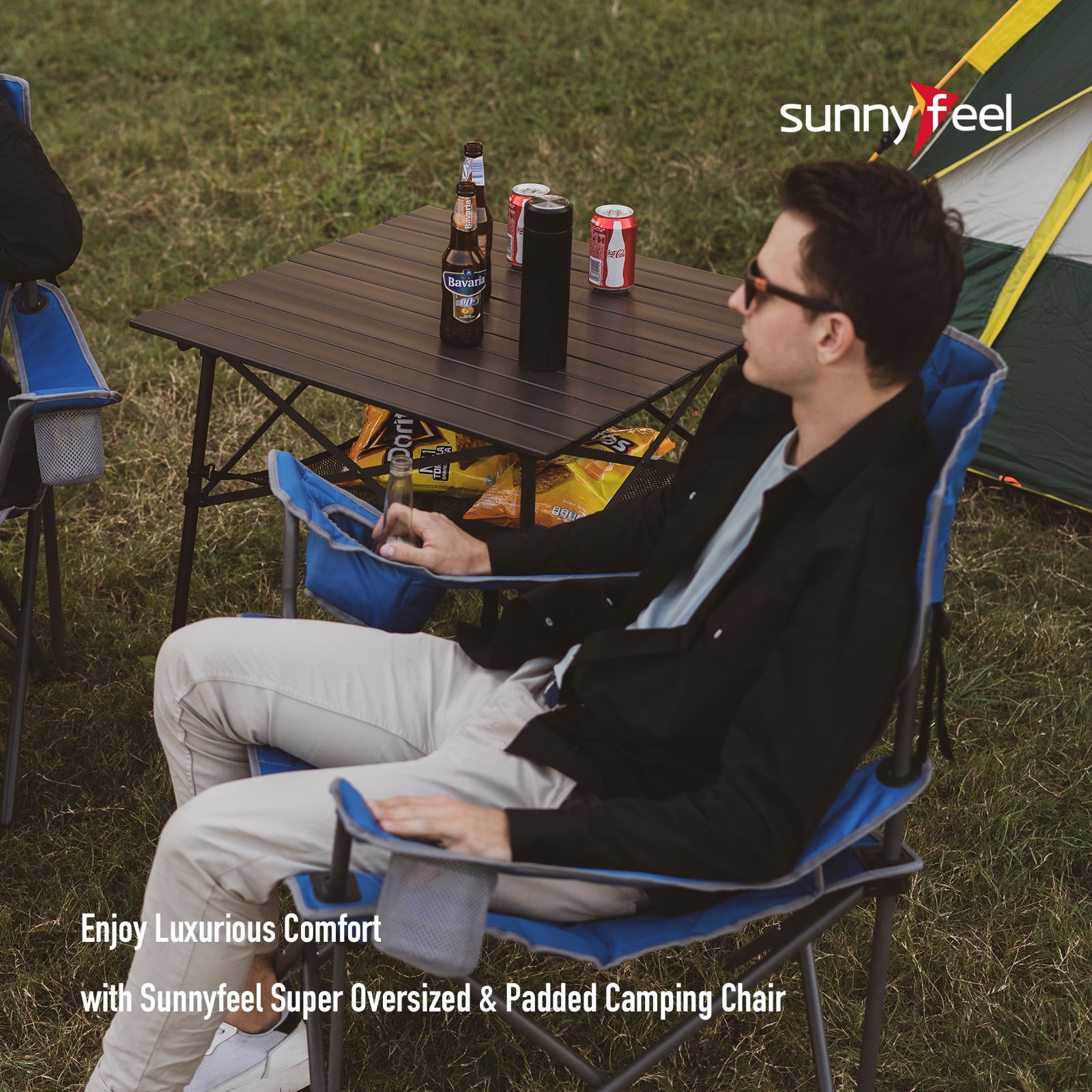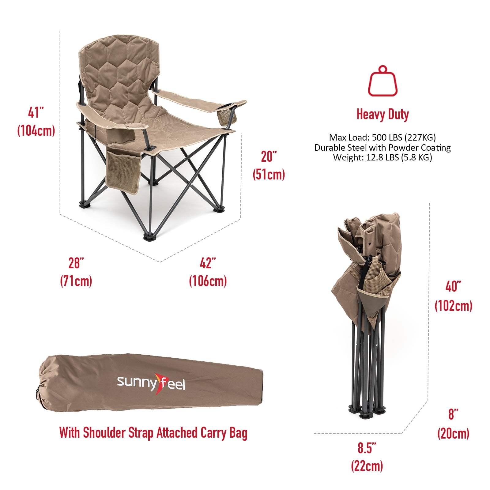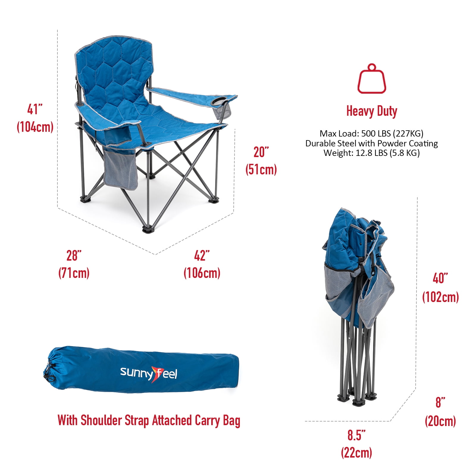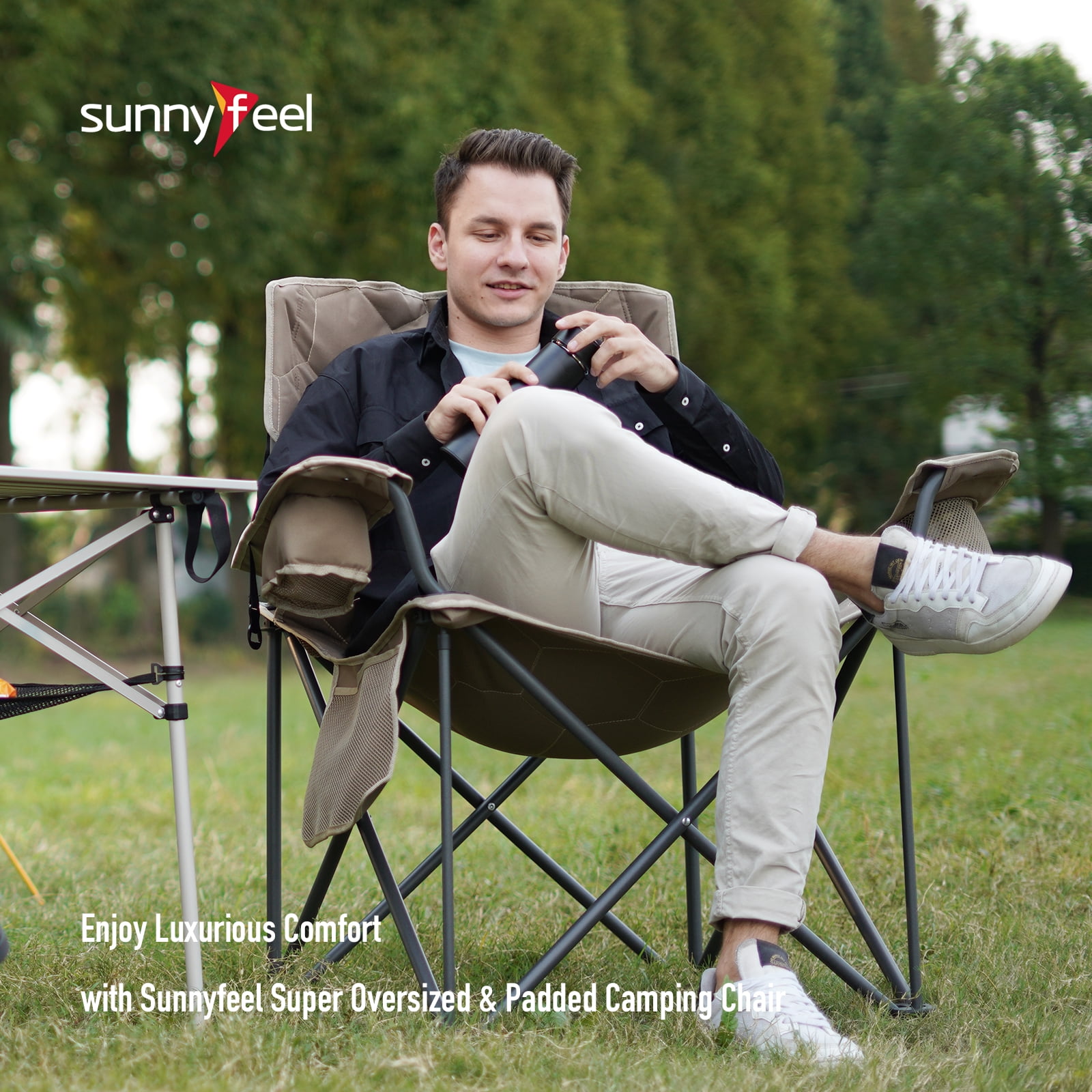 Oversized & Maximum Weight Capacity: The oversized folding chair size is 27″x41″x42″ and the sturdy steel frame construction affords up to 800 LBS (364KG) weight capacity. This oversized & padded chair is your best partner to help you relax and enjoy your journey.Super Handy: The built-in 2 attached cup holders free your hands while camping, hiking, traveling, or watching sporting events, and easily store your drinks, sunglasses, and phone within hand’s reach.Built to Last: The sturdy steel frame construction affords up to 800 LBS (364KG) weight capacity, and the chair weighs 10 LBS (4.6KG). The double-seam 600x300D Oxford Cloth with 140g Foam Padding has great strength, durability, and breathability. You don’t have to worry about the heavy-duty use, either, to buy a new one in the near future.Easy-Peasy: Setting this chair up is effortless and fast. You only have to take it out from the shoulder straps attached to the carry bag and pull the frame apart, and … Ta-Da! Here you go – now you can enjoy this supreme comfy chair and easily transport it to camp, lawn, concerts, and festivals.A camping lawn chair that is built for anywhere: Use it as a camping chair, folding chair, lawn chair, travel chair, beach chair, and more. Suitable for outdoor adventures, tailgating, fishing, backpacking, beach trips, picnics, sports games, car travel, or just to put in the backyard, cabin, balcony, patio, or lawn parties. The SunnyFeel camping chair is a must-have addition to your camping essentials.