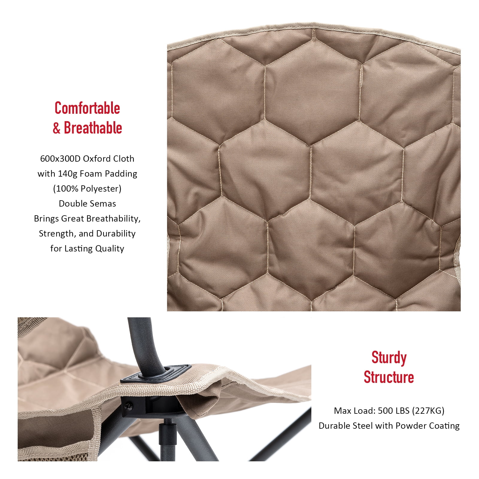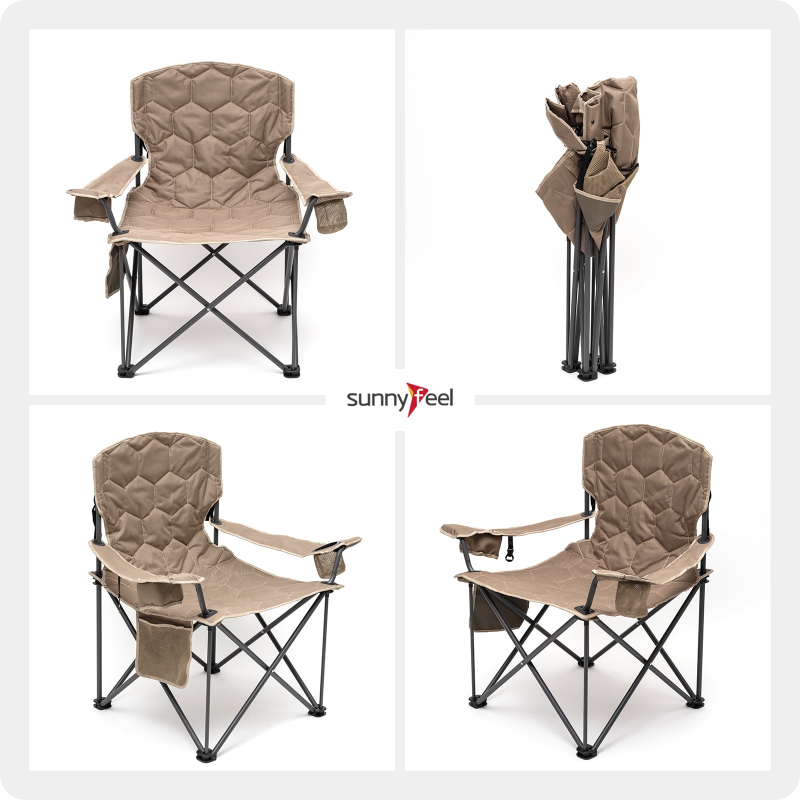 The SunnyFeel XXL Oversized Camping Chair Heavy Duty 500 LBS Ideal for Tall People Above 6’4 (Khaki) offers exceptional comfort and durability for outdoor enthusiasts. With a sturdy steel frame construction, it supports up to 500 lbs and provides ample width for big people. This camping chair features a built-in bottle opener, 2 cup holders, and a handy side pocket for convenient storage. The double-seam 600x300D Oxford Cloth with 140g Foam Padding ensures strength, durability, and breathability. Perfect for camping, picnics, hiking, traveling, or fishing, the SunnyFeel XXL Oversized Camping Chair is your best partner for relaxation and enjoyment.